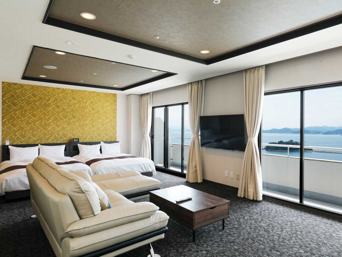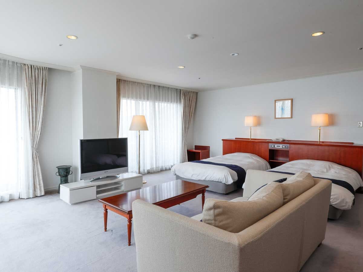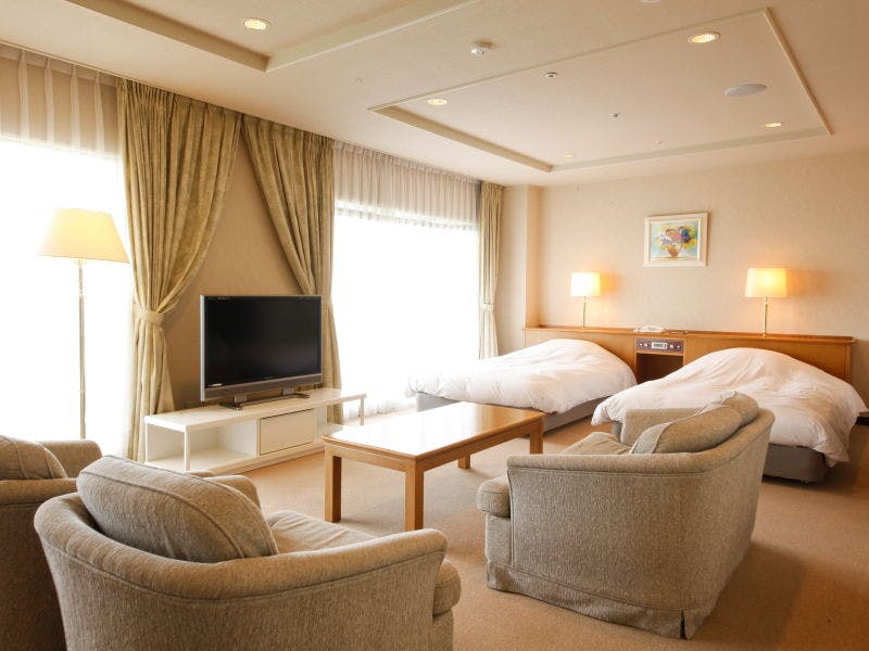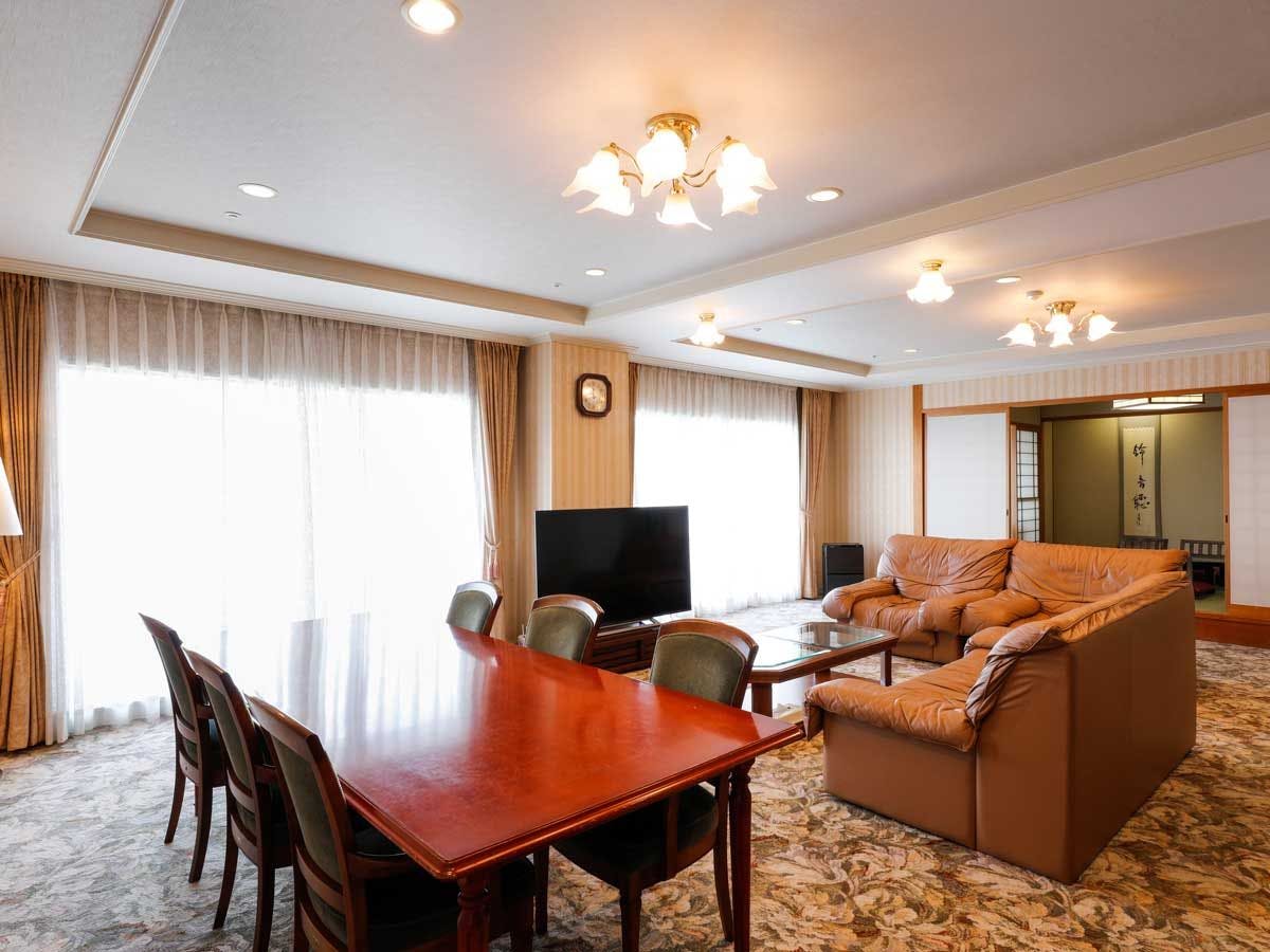客室最上階(6階)海側、70平米(和室8畳部屋を含む)の広々した和洋室タイプのスーペリアスイートルームです。
