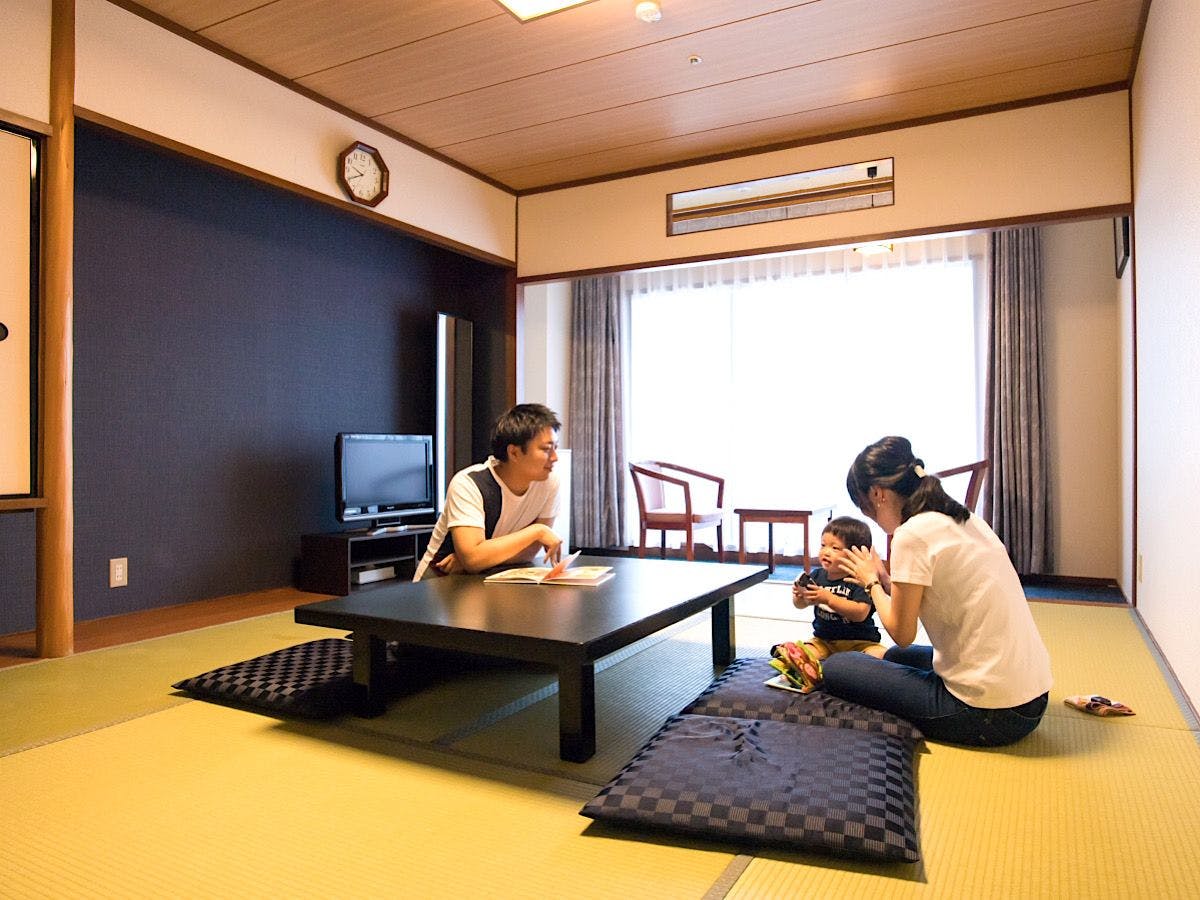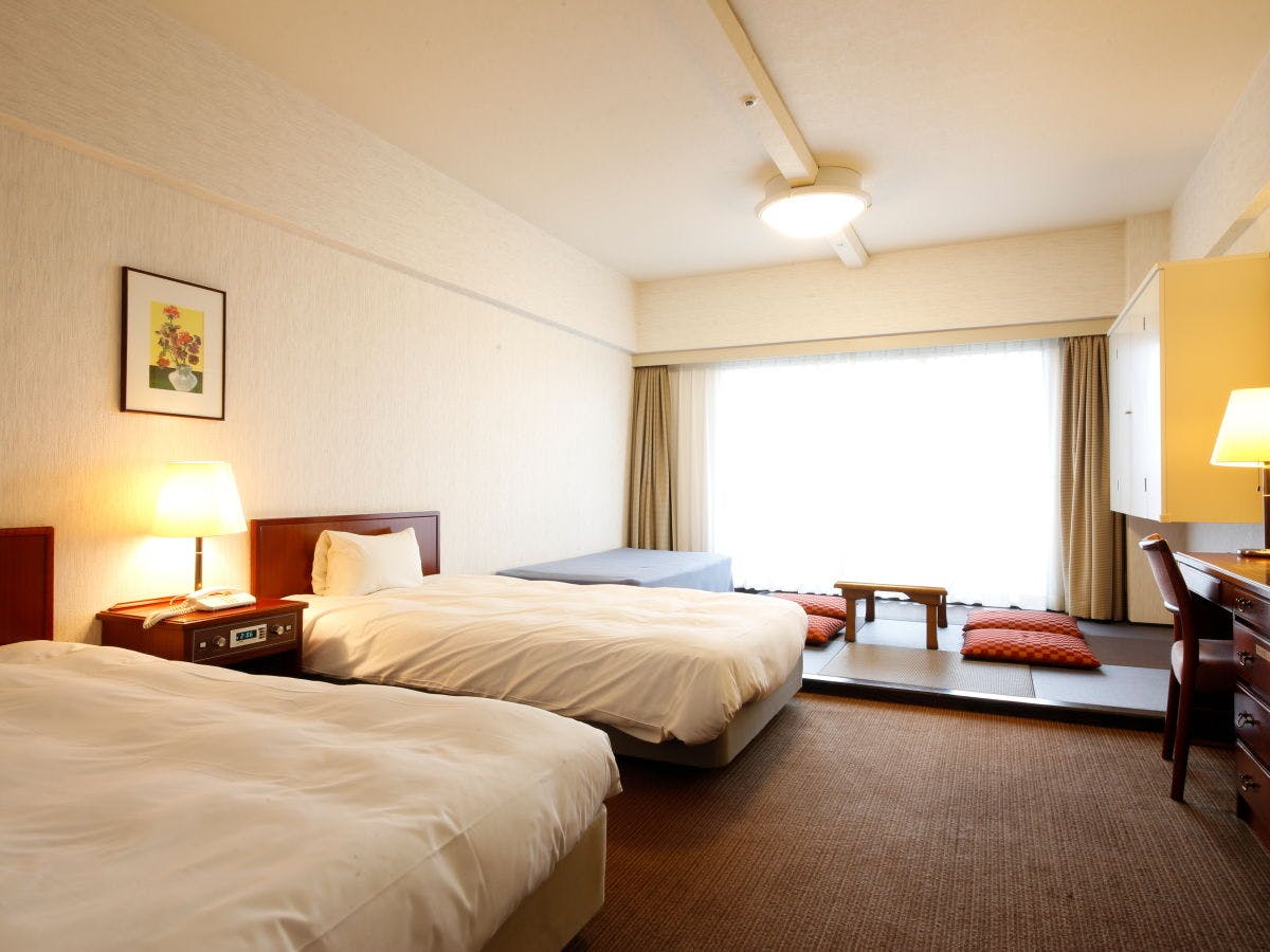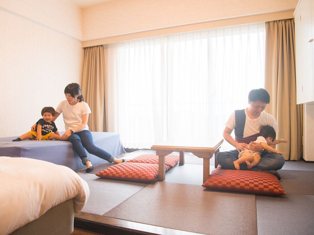 小さなお子様連れのご宿泊にオススメのお部屋で、最大ベッド3台(120cm幅セミダブル×2、シングル×1)と、畳の上にお布団(セルフ)を敷いてご宿泊いただけます。