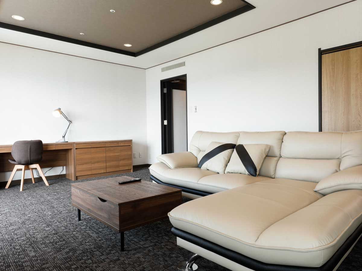 ワークデスクに足が伸ばせるソファー、ビーズクッション、コーヒーメーカーなどリラックスできる空間にこだわったスイートルームです。ワーケーションや長期滞在にもご利用いただけます。
