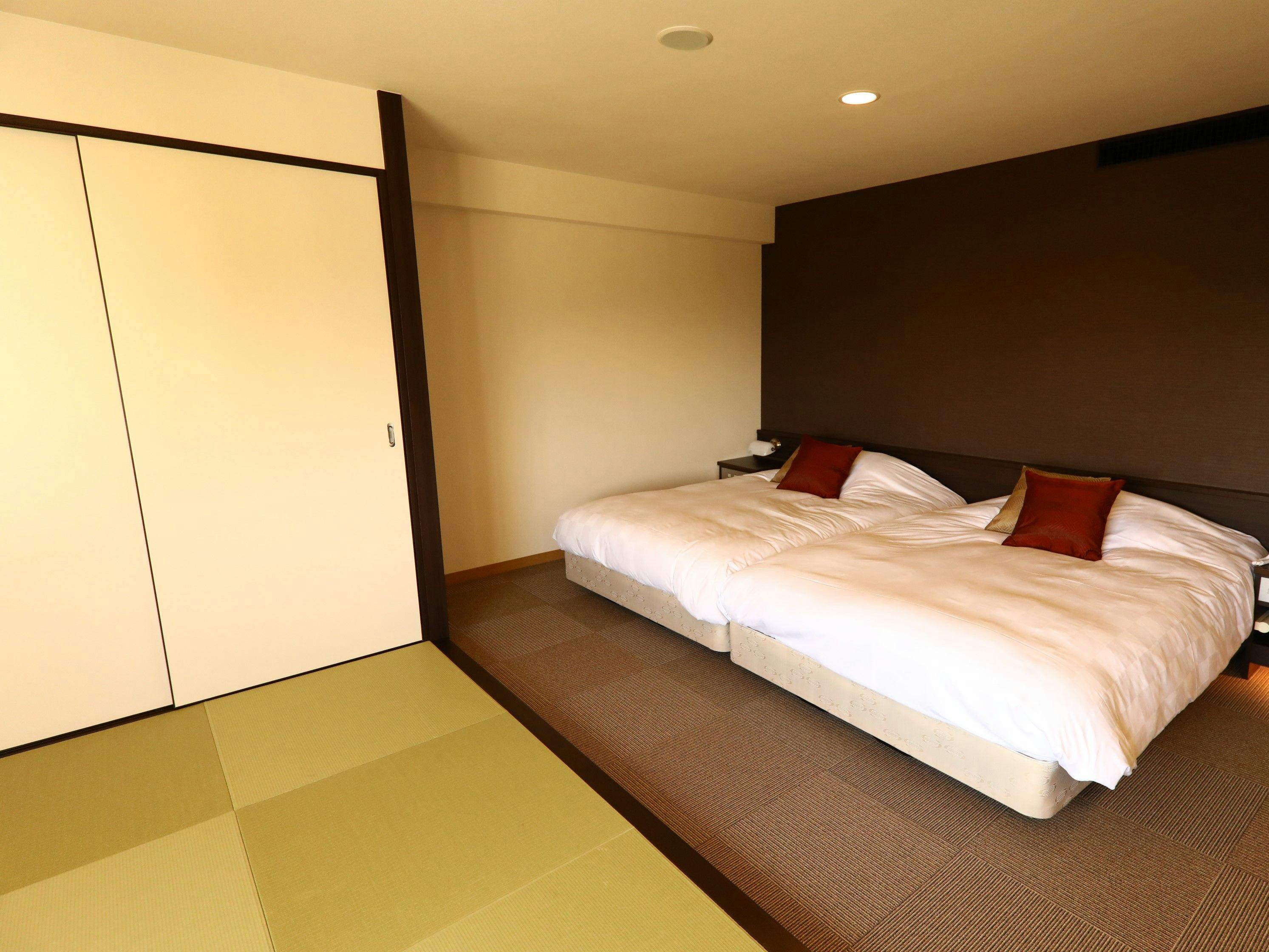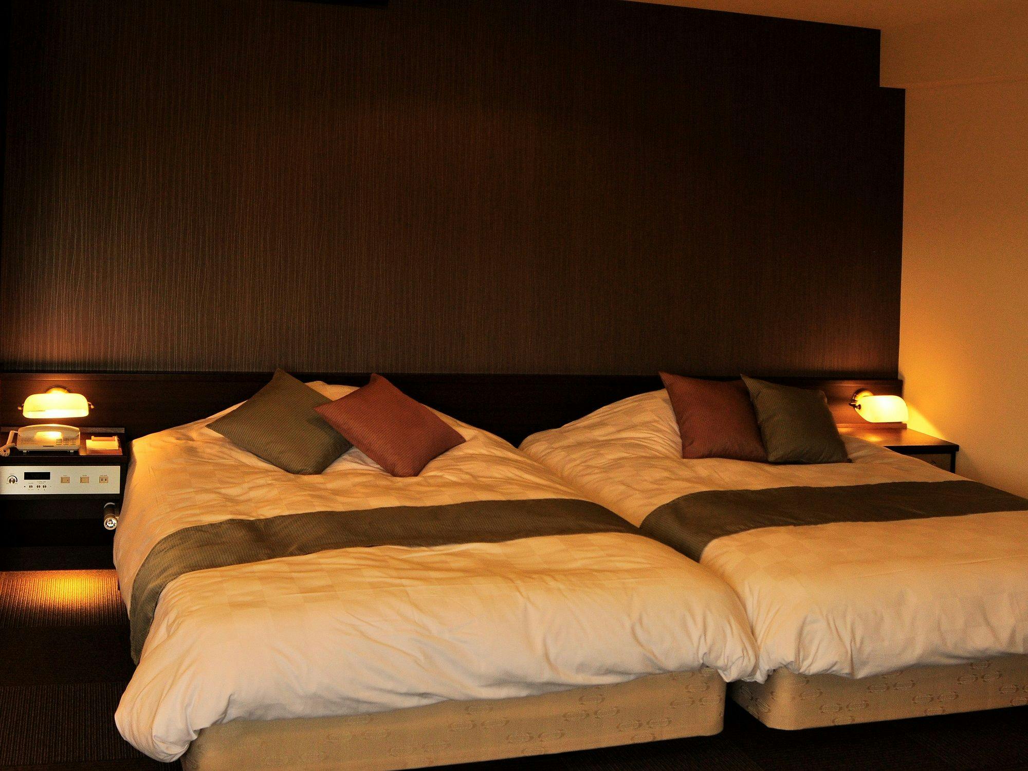 【禁煙室】特別室52平米/4名様定員。モダンな茶色が基調の和洋室で、ベッド間スペースがないハリウッドタイプ。3名様以上は和式布団でのご用意となります(お布団は最大2組まで)。お布団敷きは(令和3年10月より)セルフサービスです。