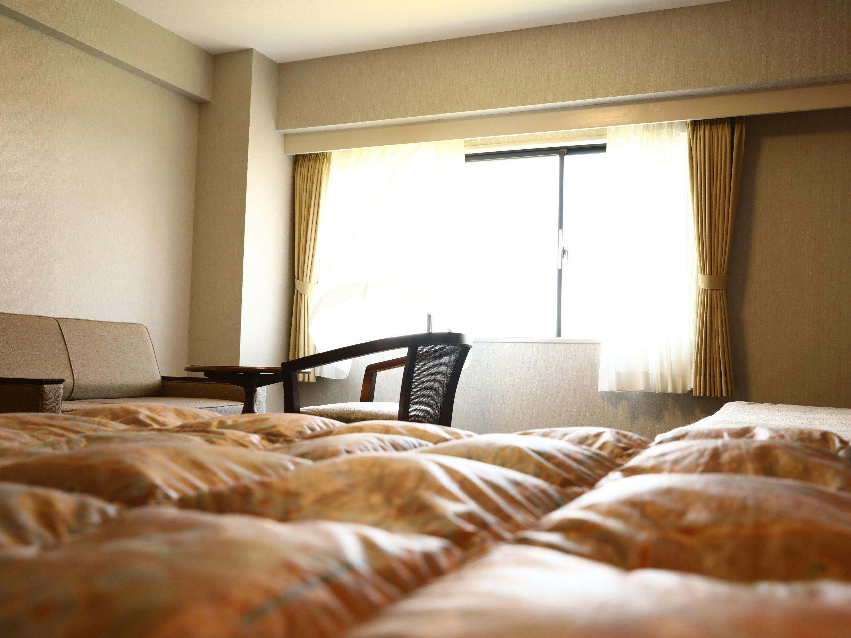 ツインベット(120cm幅)×2台、3名様以上は和式布団でのご用意となります(お布団は最大2組まで)。お布団敷きは(令和3年10月より)セルフサービスです。ユニットタイプのバス(水道水)、トイレ(温水洗浄便座)付き。全室WiFi無料接続サービス利用可。パスワードはフロントにてご案内(接続機器や場所によっては繋がりにくい場合がございます)。
