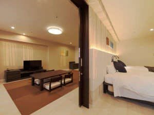 三世代旅行にオススメ!和室10畳のお部屋と洋室36平米のお部屋が一枚の引き戸で仕切られた、THE HAMANAKO初の<和洋コネクティングルーム>です。ドアを開けたらまず靴を脱いでお入りください!和室のローテーブルの角は面取りしており、小さなお子様が歩き回っても安心です。洋室のベッドは、最大4台まで横並びでくっつけることができるので添寝にもオススメ!