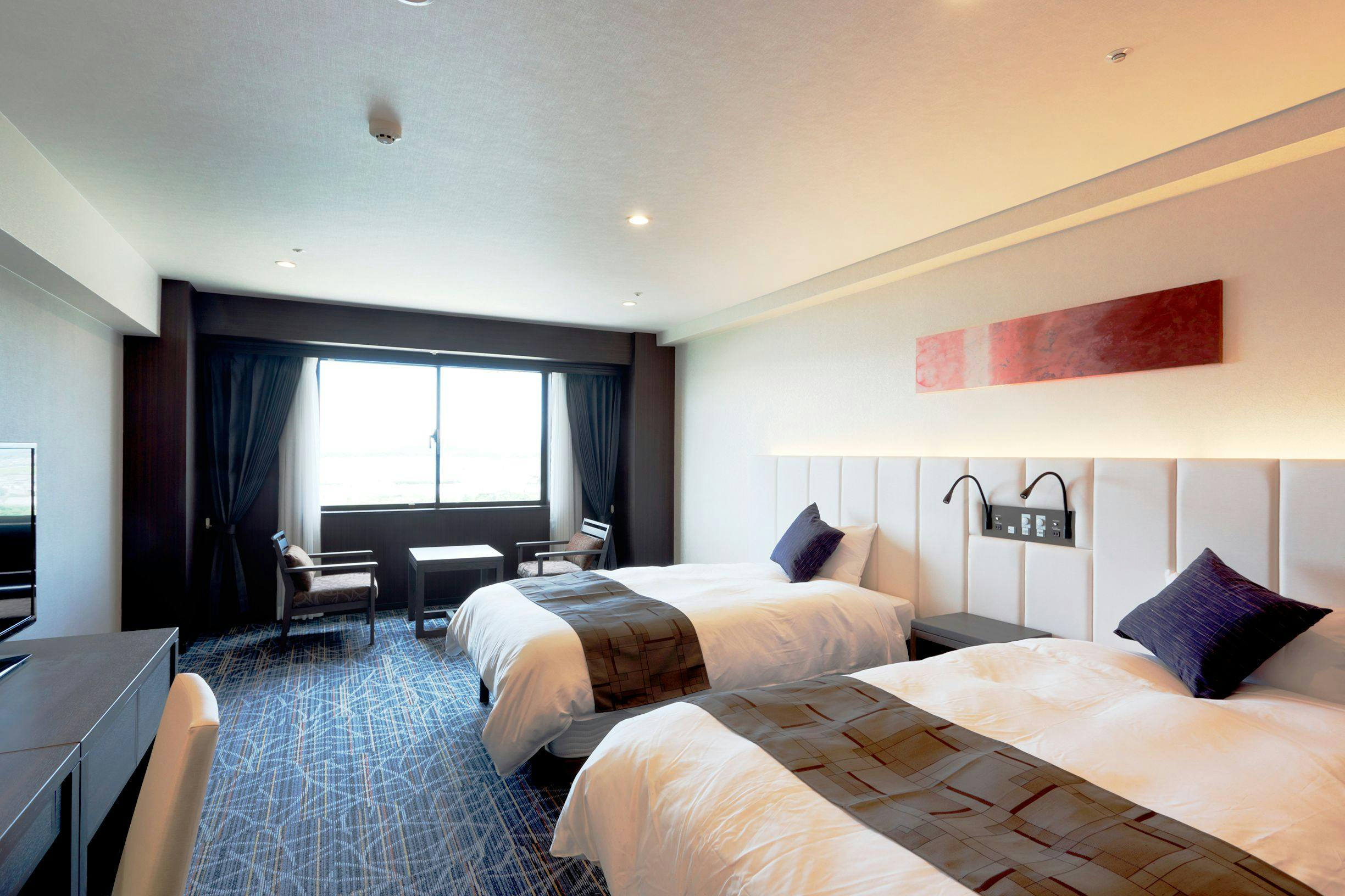 36平米とかなりゆったりめで開放感のあるツインルームです。セミダブルベット2台+ソファーとなります。