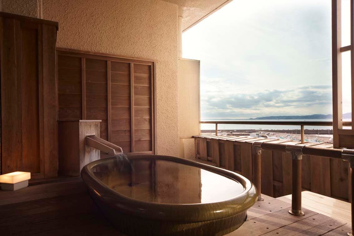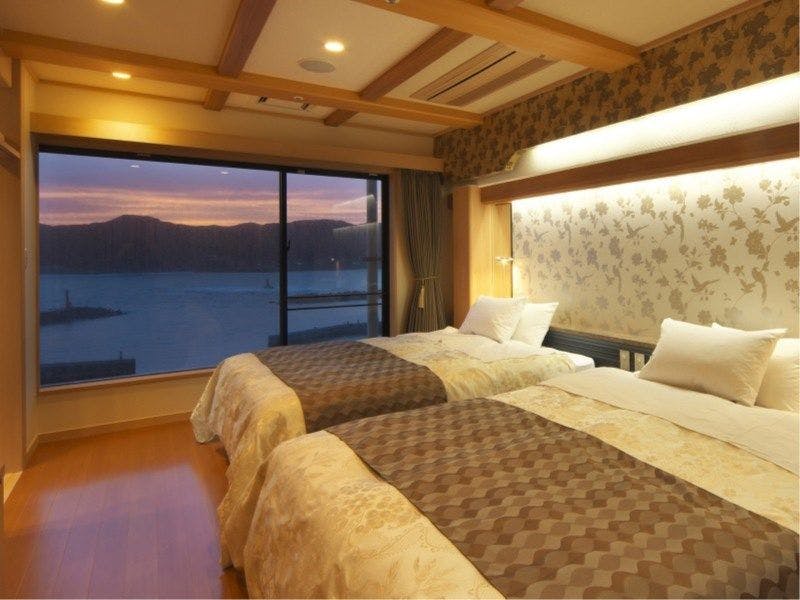 客室はオーシャンフロントとなっており、夕陽百選の宿にも選ばれた絶景をお部屋からもお愉しみ頂けます。