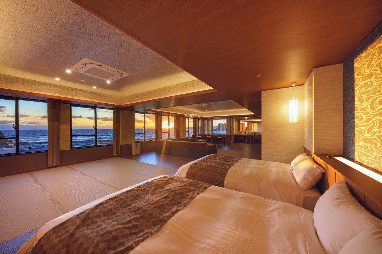 客室はオーシャンフロントとなっており、夕陽百選の宿にも選ばれた絶景をお部屋からもお愉しみ頂けます