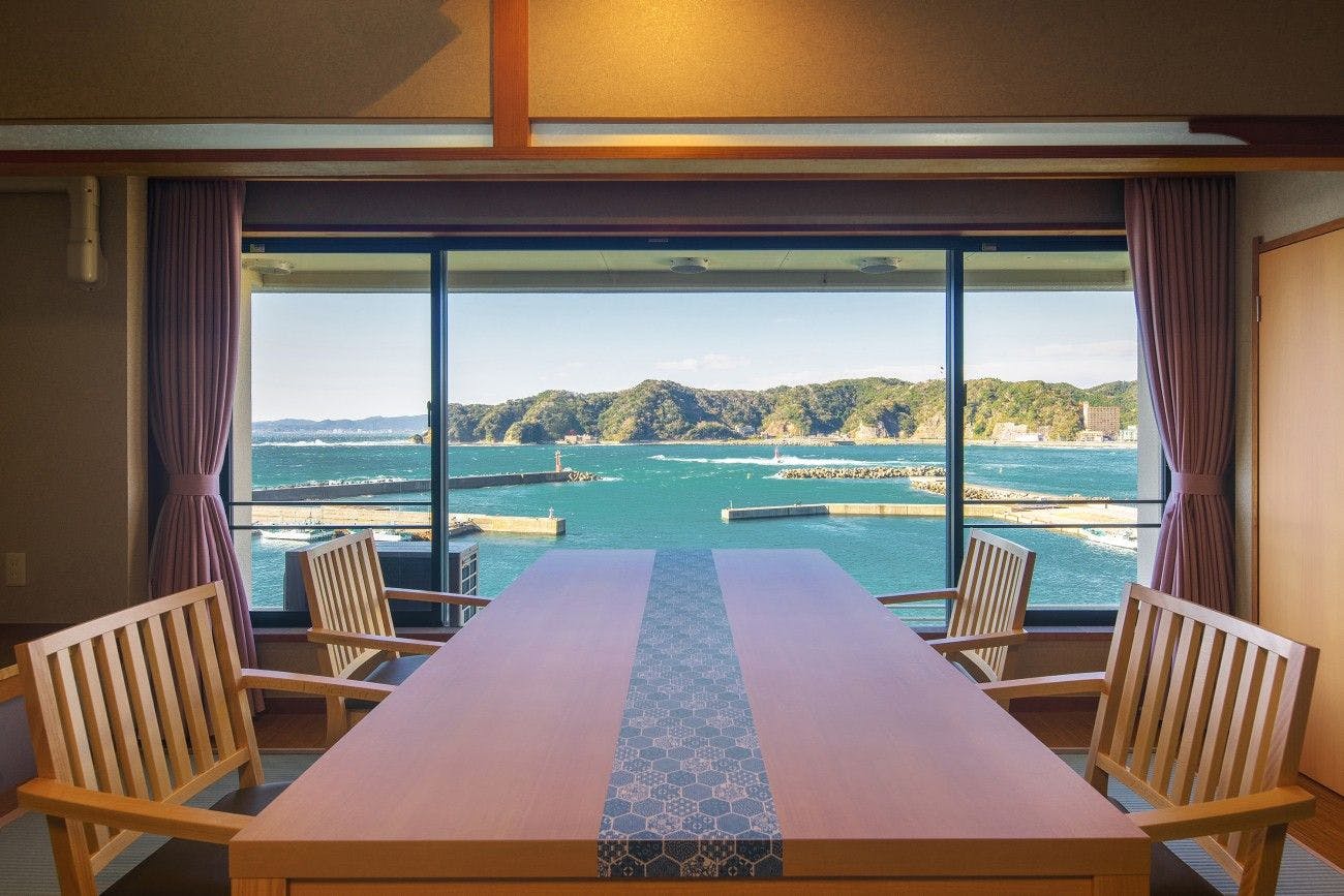 夕陽の見える宿100選にも選ばれた絶景を満喫できる宿。お食事は南房総の海と里の恵みに技と真心込めた創作和食会席に舌鼓。貸切風呂やお部屋食のご用意もあり、ゆったりとしたひと時をお過ごしいただけます。