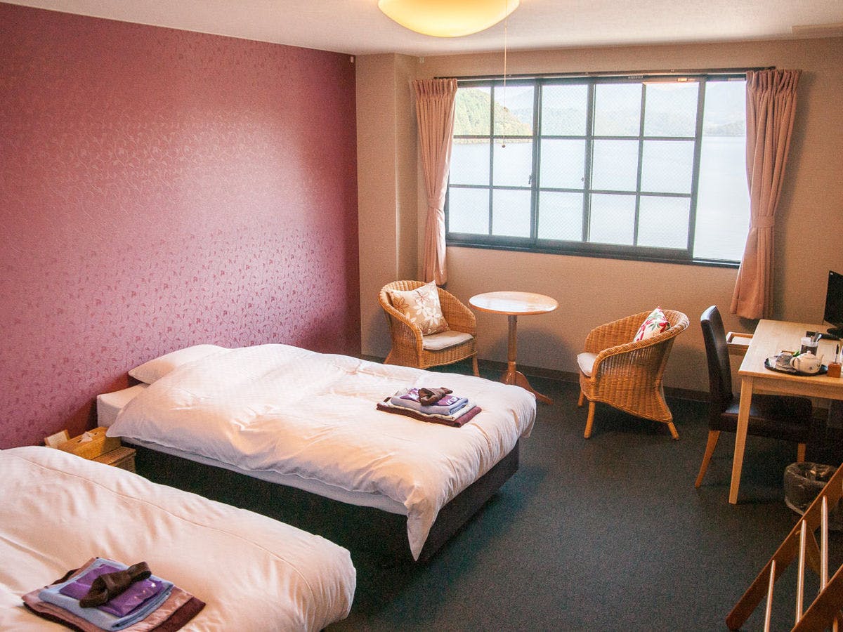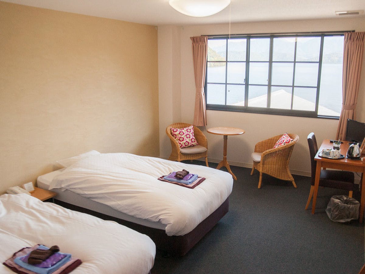 水月湖に面した眺望自慢のツインルーム(ユニットバス付、約10畳)。