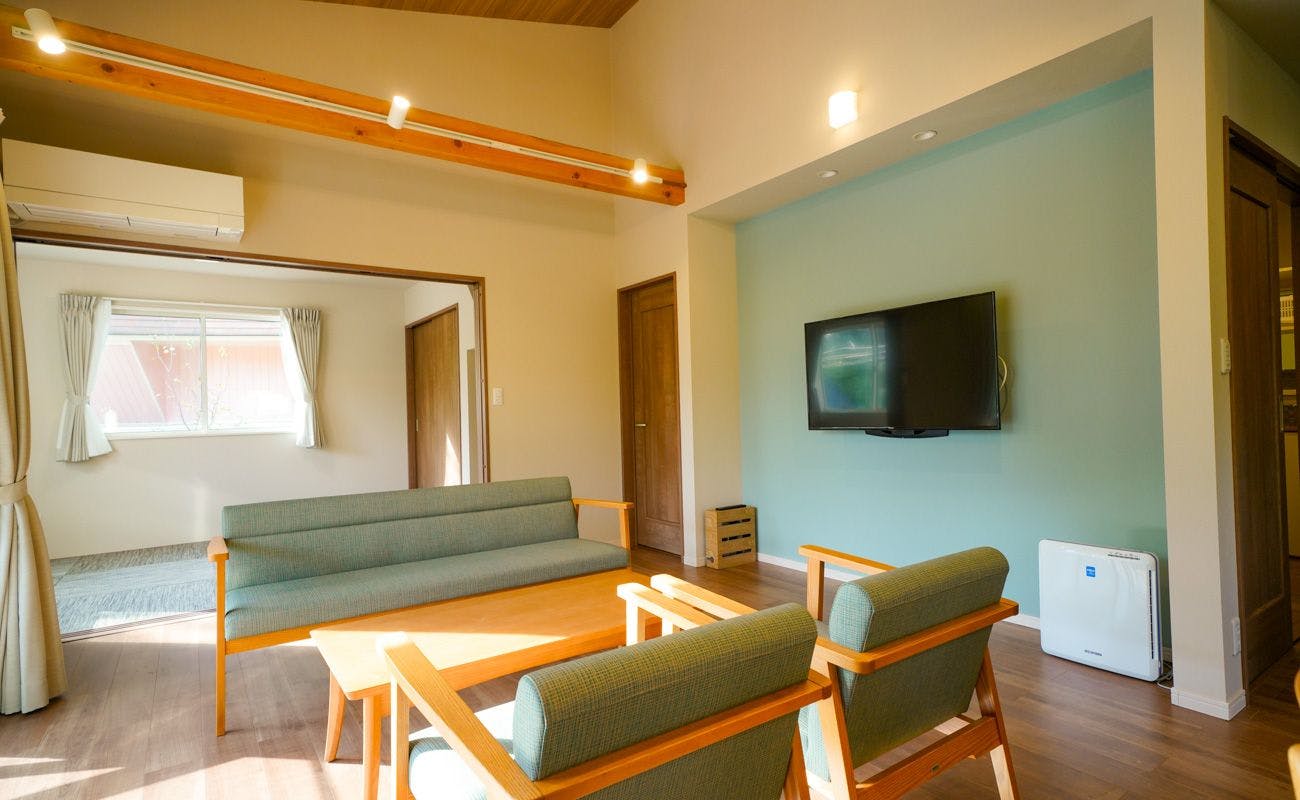 古民家風2階建て。梁調の存在感ある柱が落ち着いた空間を醸し出した開放的なリビングはグループ利用に最適。