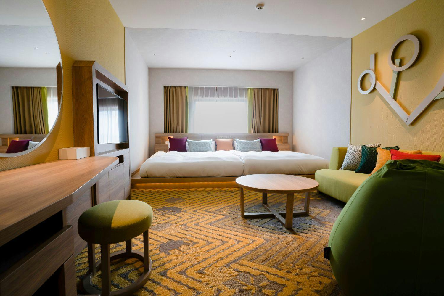 お部屋にはハリウッドツインスタイルの広々としたベッドや小上がりのソファでテーブルを囲む団らんスペースも。森の中で団らんしているかのような客室で、家族ゆったりと心地よくお過ごしいただけます。