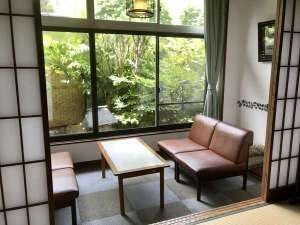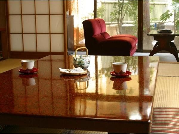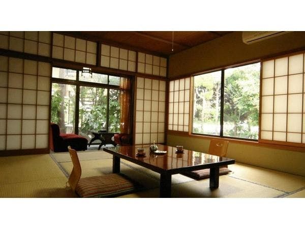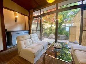 客間「子宝」は露天風呂とシャワー付きの離れ風部屋です。静かなお部屋ご希望な方に最適です。もみじと金木犀等の雑木林を眺めながら静かなお時間を。