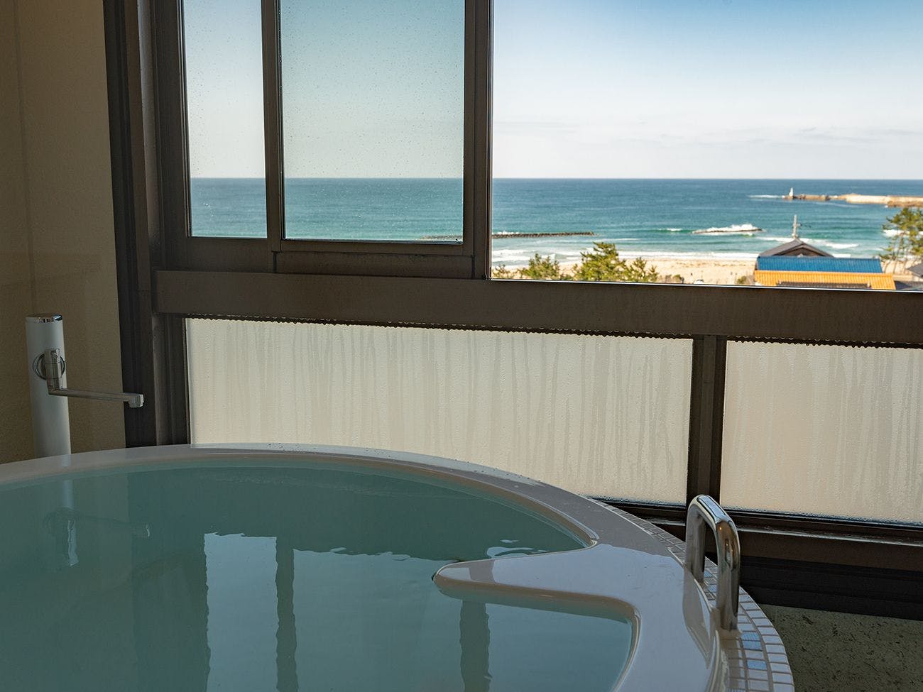 天然温泉に浸かりながら日本海を一望できる半露天風呂付客室。