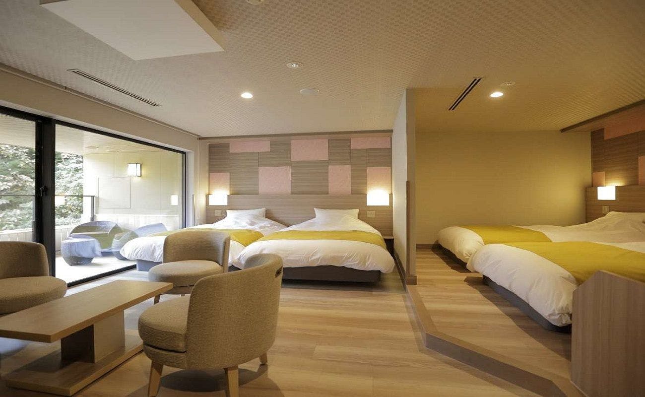 洋間部分にゆったりサイズのベッドを2台配し、和室部分に”置き畳”を取り入れゆったりお寛ぎ頂けるようになっております。