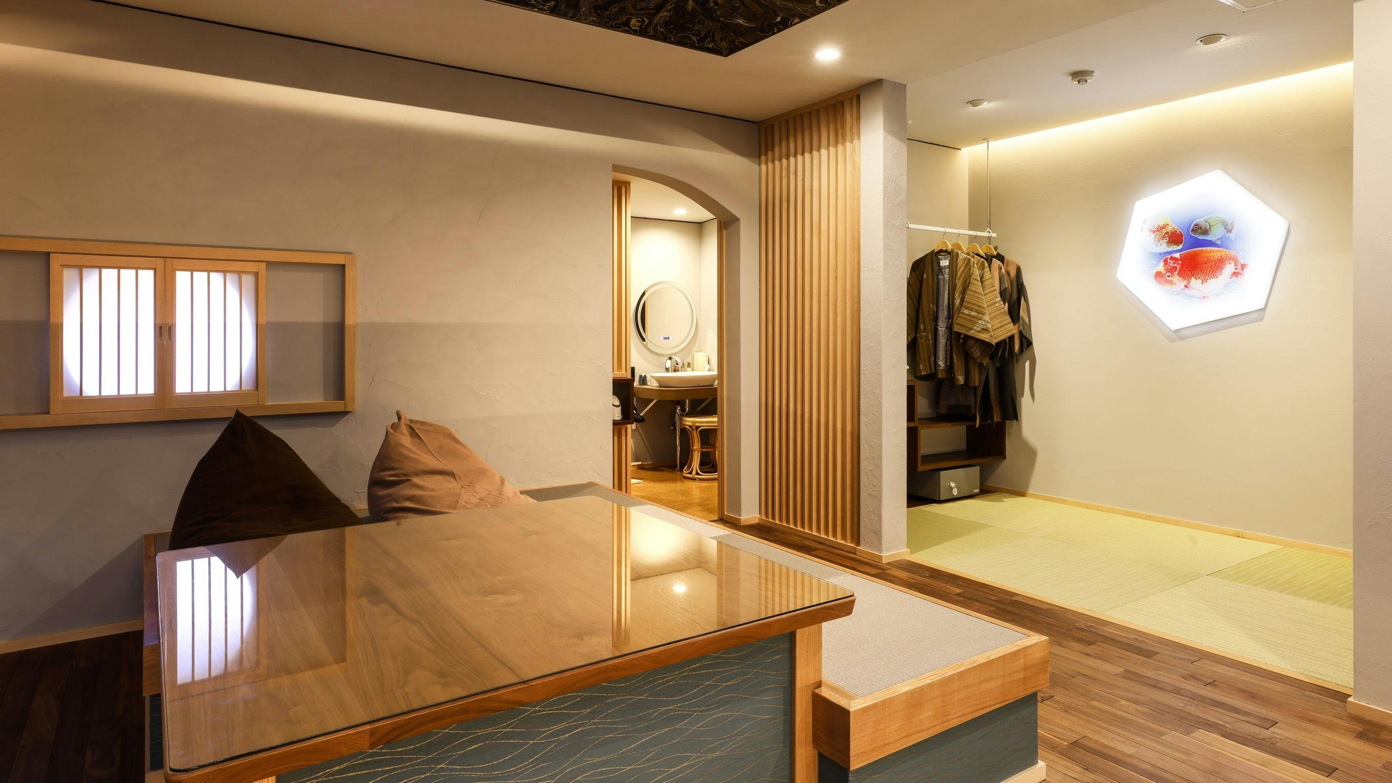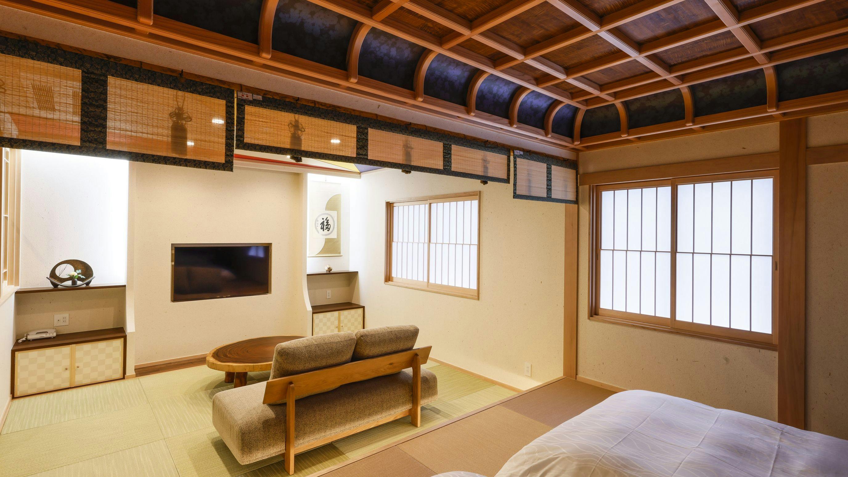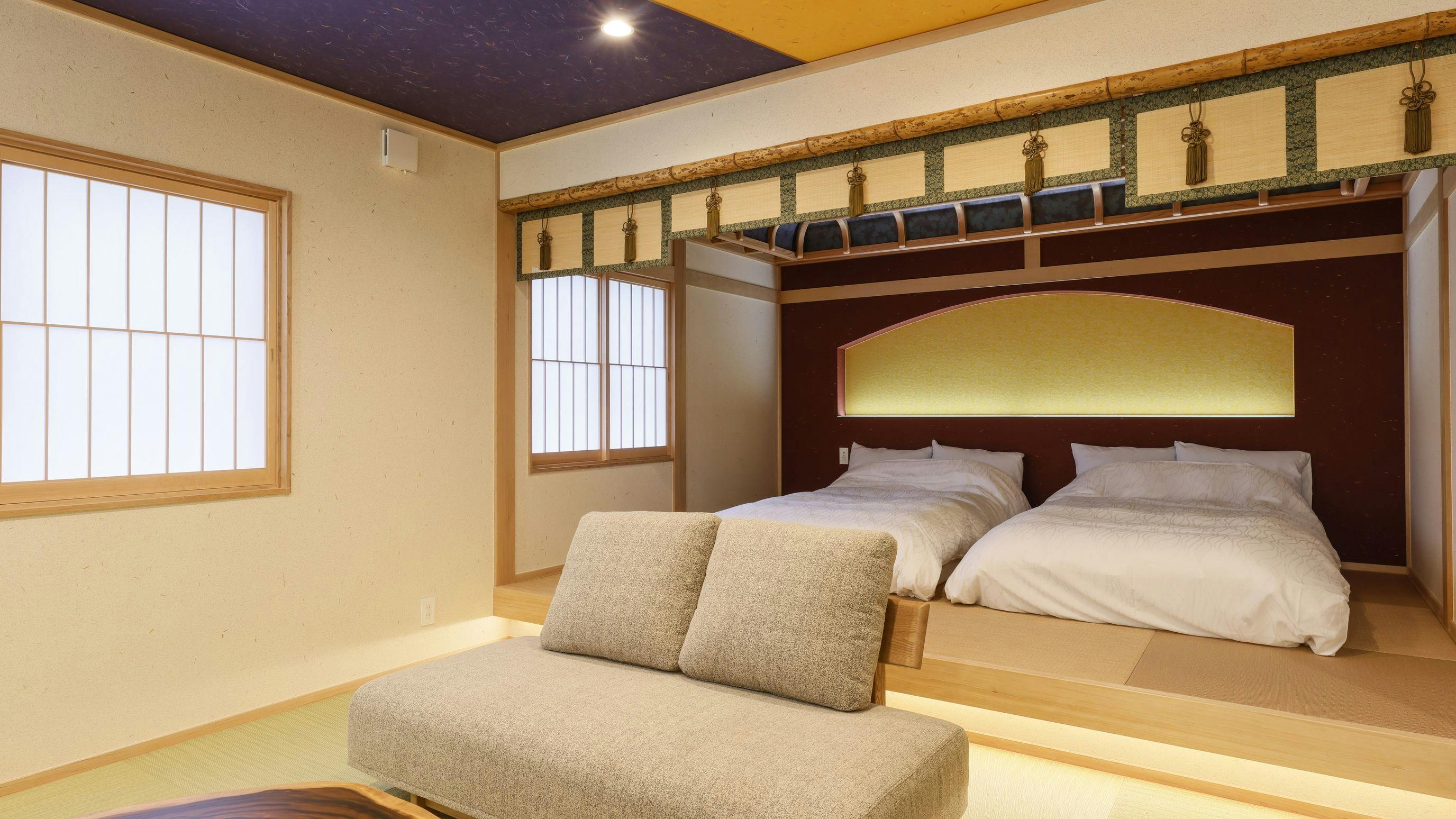 折上格天井のベッドスペースとバーカウンターが印象的なお部屋。 しなやかな畳や組子細工が織りなす和みの空間でごゆっくりお寛ぎいただけます。 露天風呂でお好きなときに心おきなく湯浴みをお愉しみください。※城崎温泉では客室に温泉をひくことが条例で禁止されております。客室のお湯は沸かし湯になりますことご了承ください。