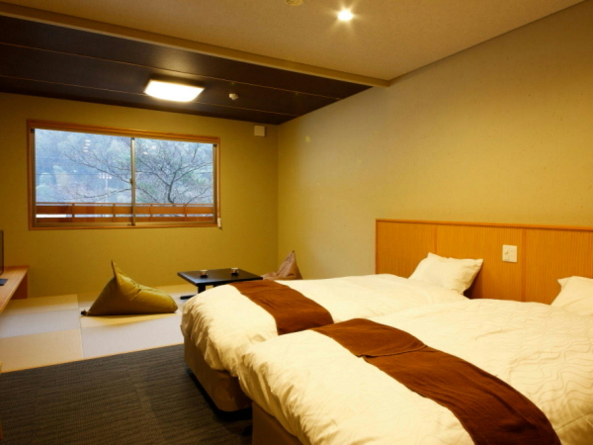 室内は花のイメージを基調に和モダンでシンプルなつくり。窓からは春になると美しく咲く桜、冬になると雪化粧をした山々を望むことができます。※客室はトイレのみございます。お風呂は貸切風呂または外湯をご利用ください。
