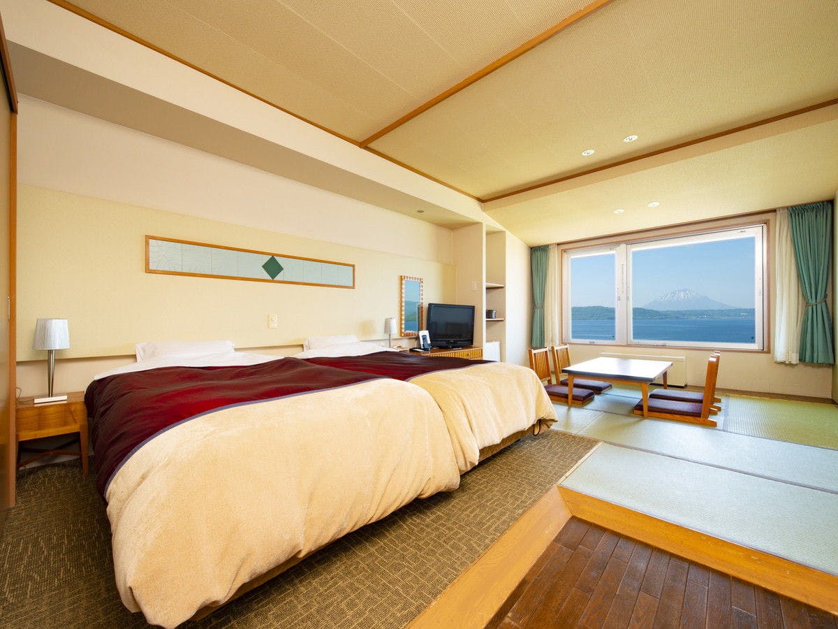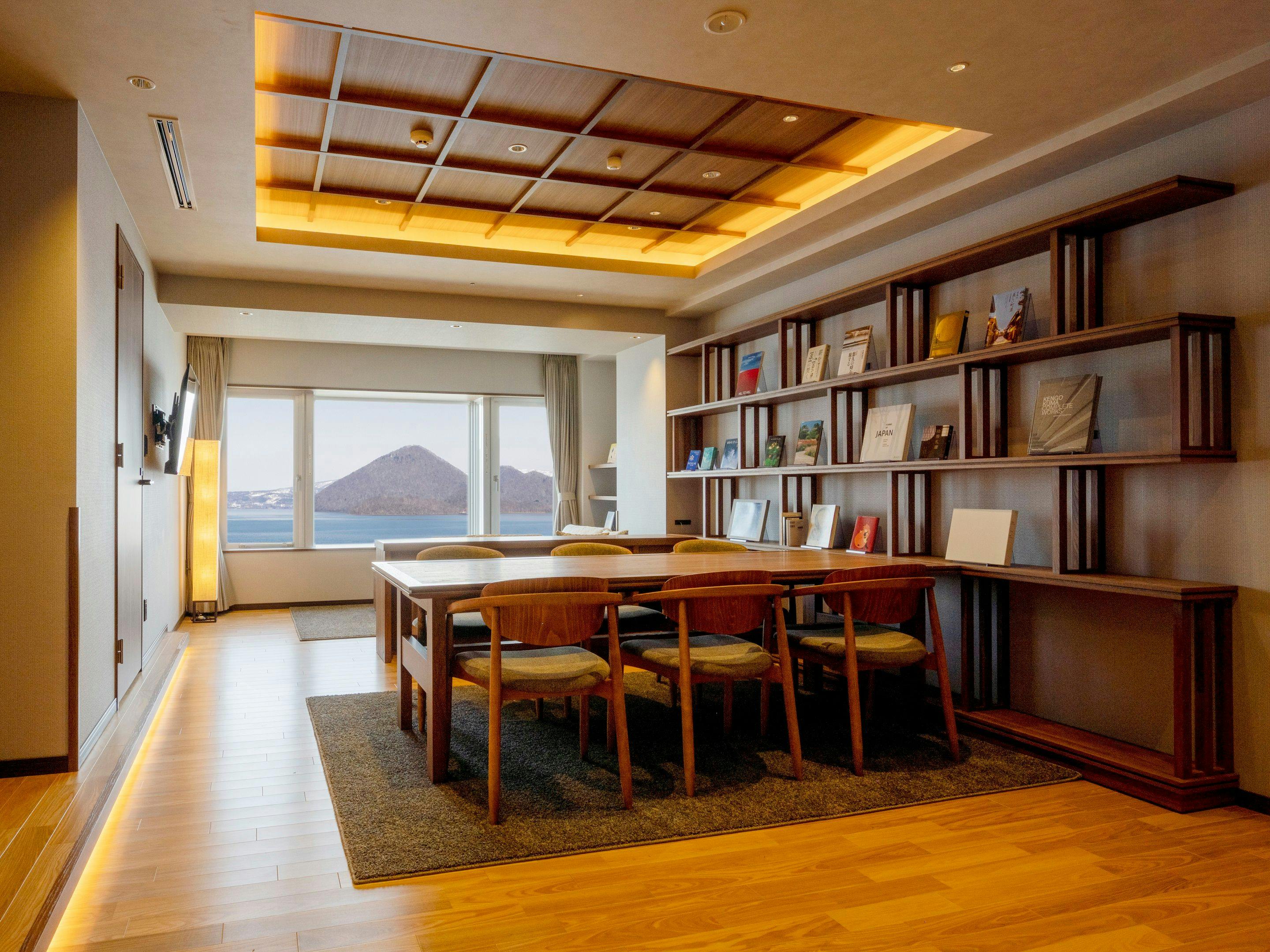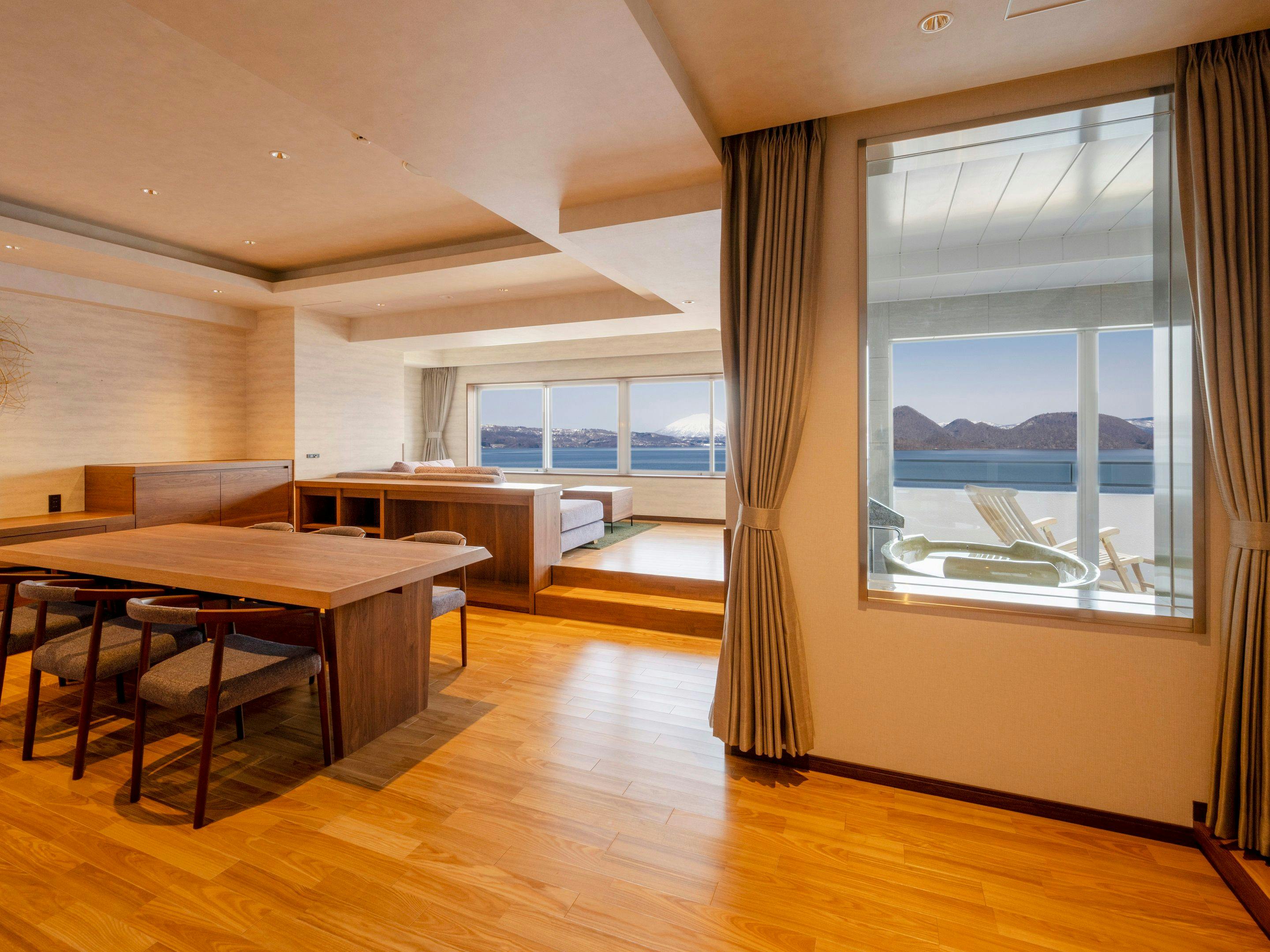 ラグジュアリーな空間と大きな窓とテラスからは洞爺湖が一望できます。隣接の洋室とコネクティングで123平米と広々とご利用いただけます。洞爺湖の絶景を眺めながら入る展望風呂では特別な時間をお過ごし頂けます。