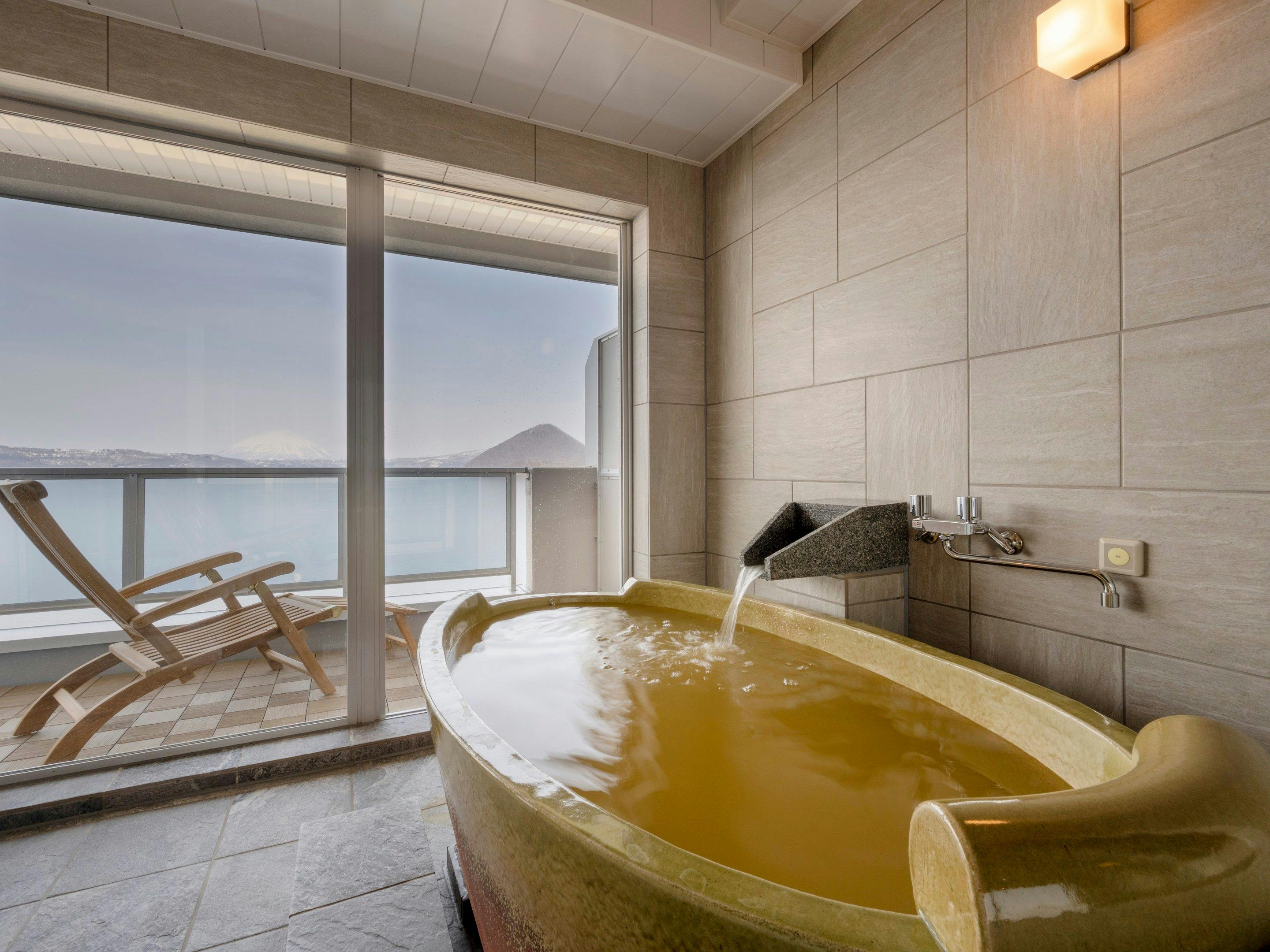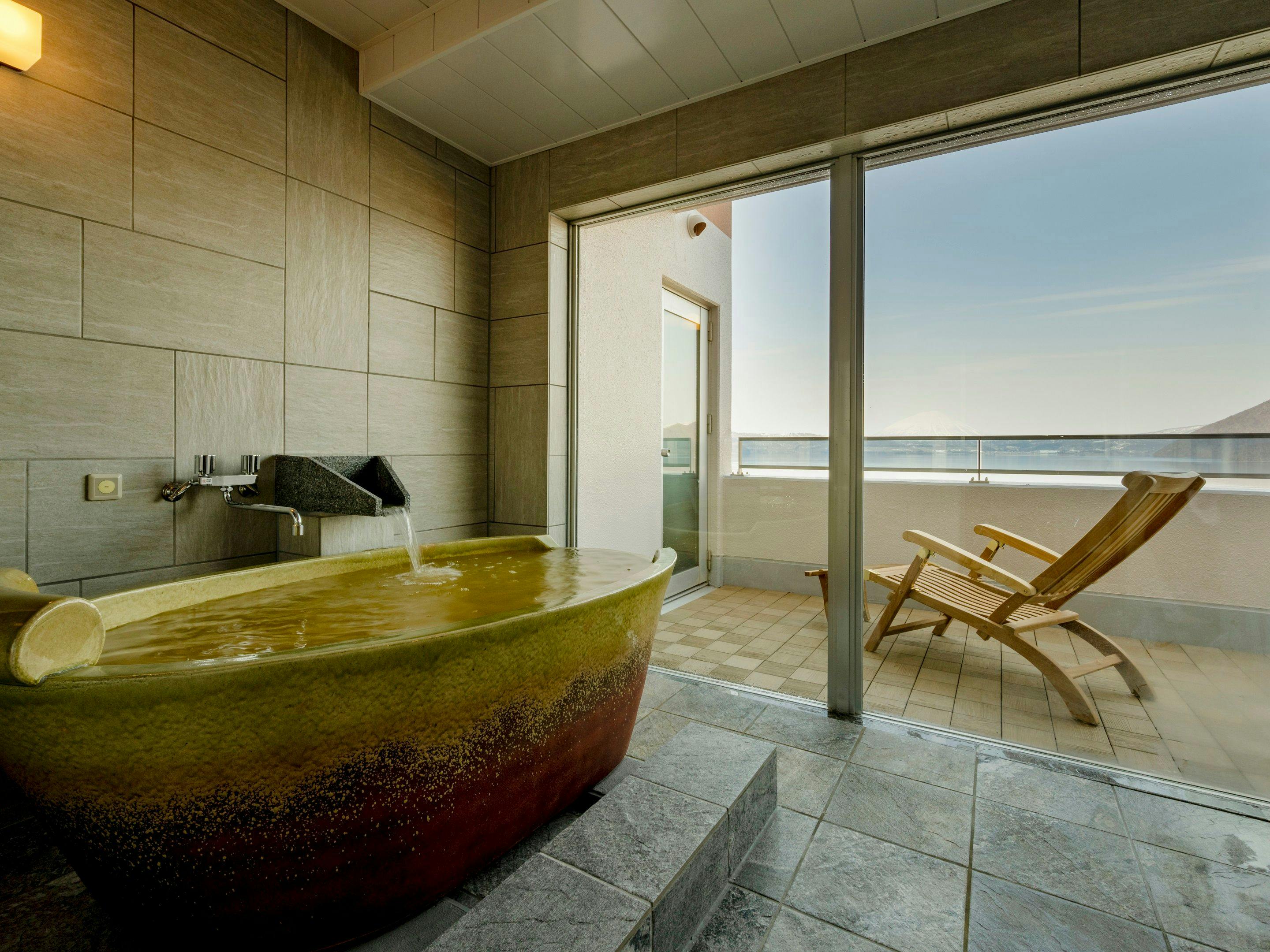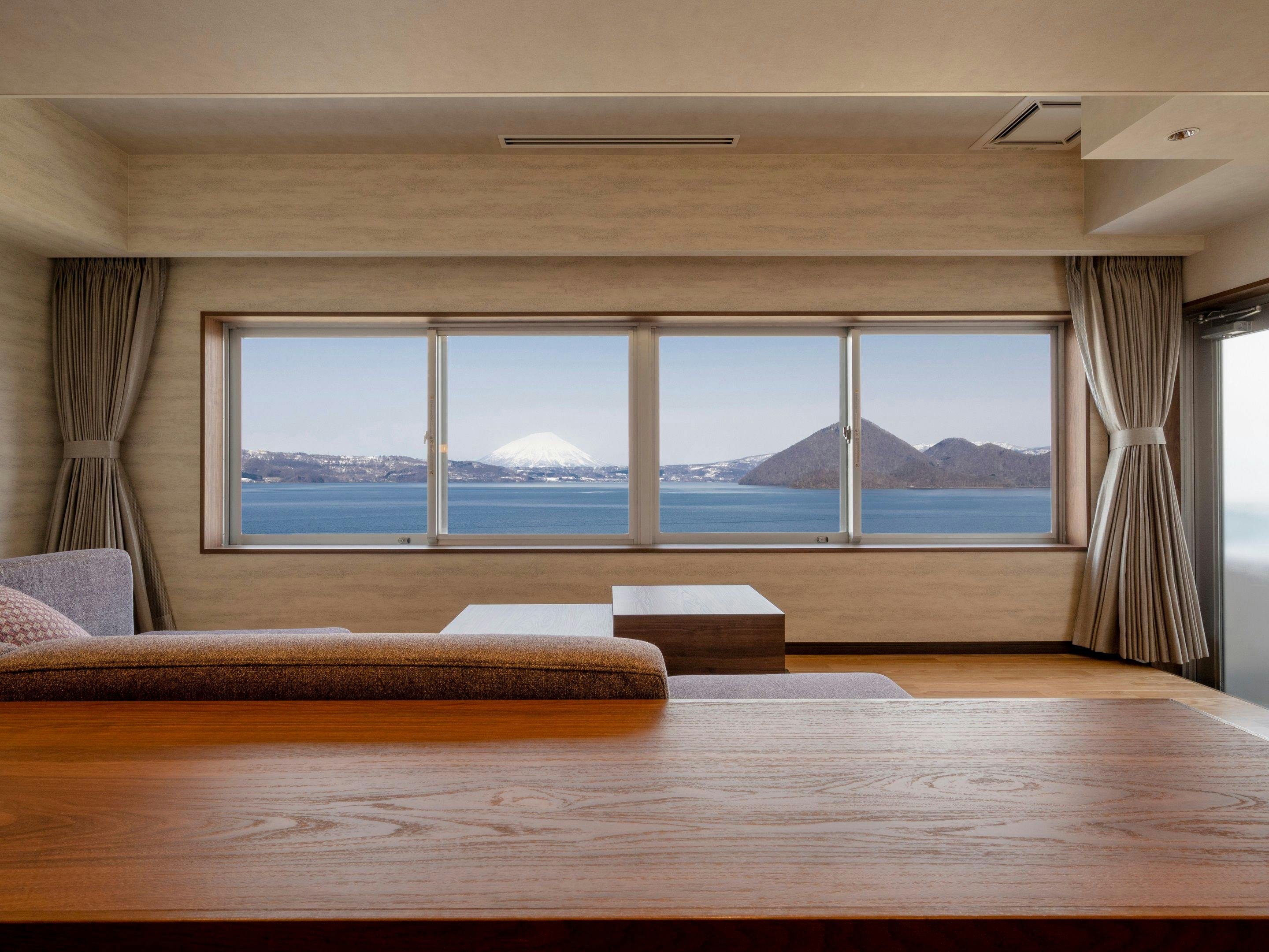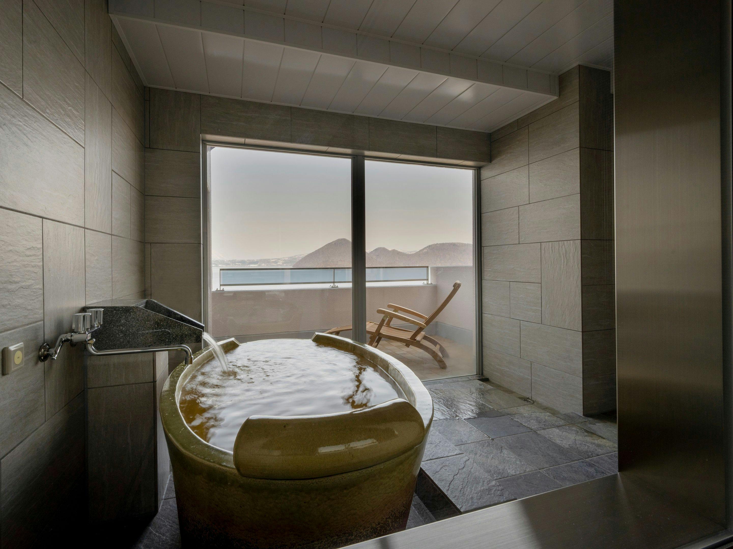 ラグジュアリーな空間と大きな窓とテラスからは洞爺湖が一望できます。洞爺湖の絶景を眺めながら入る展望風呂では特別な時間をお過ごし頂けます。