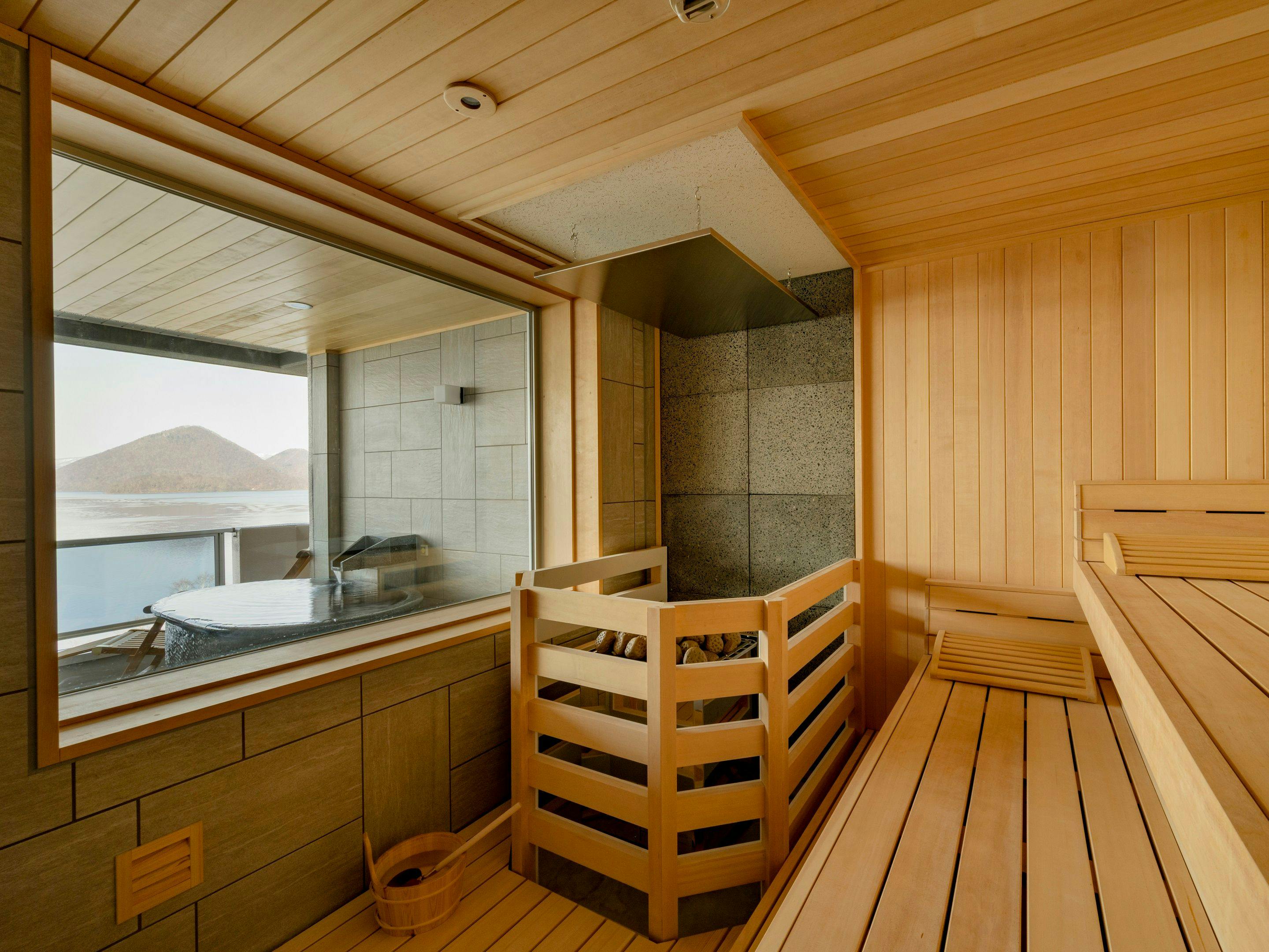 温泉展望風呂と展望プライベートサウナの2つが楽しめる1室限定の特別室。隣接の展望プライベートサウナ室「saunoa room」では洞爺湖の絶景と共にととのうことが出来ます。