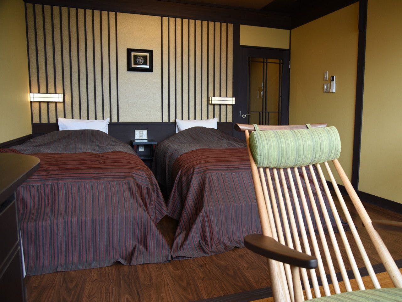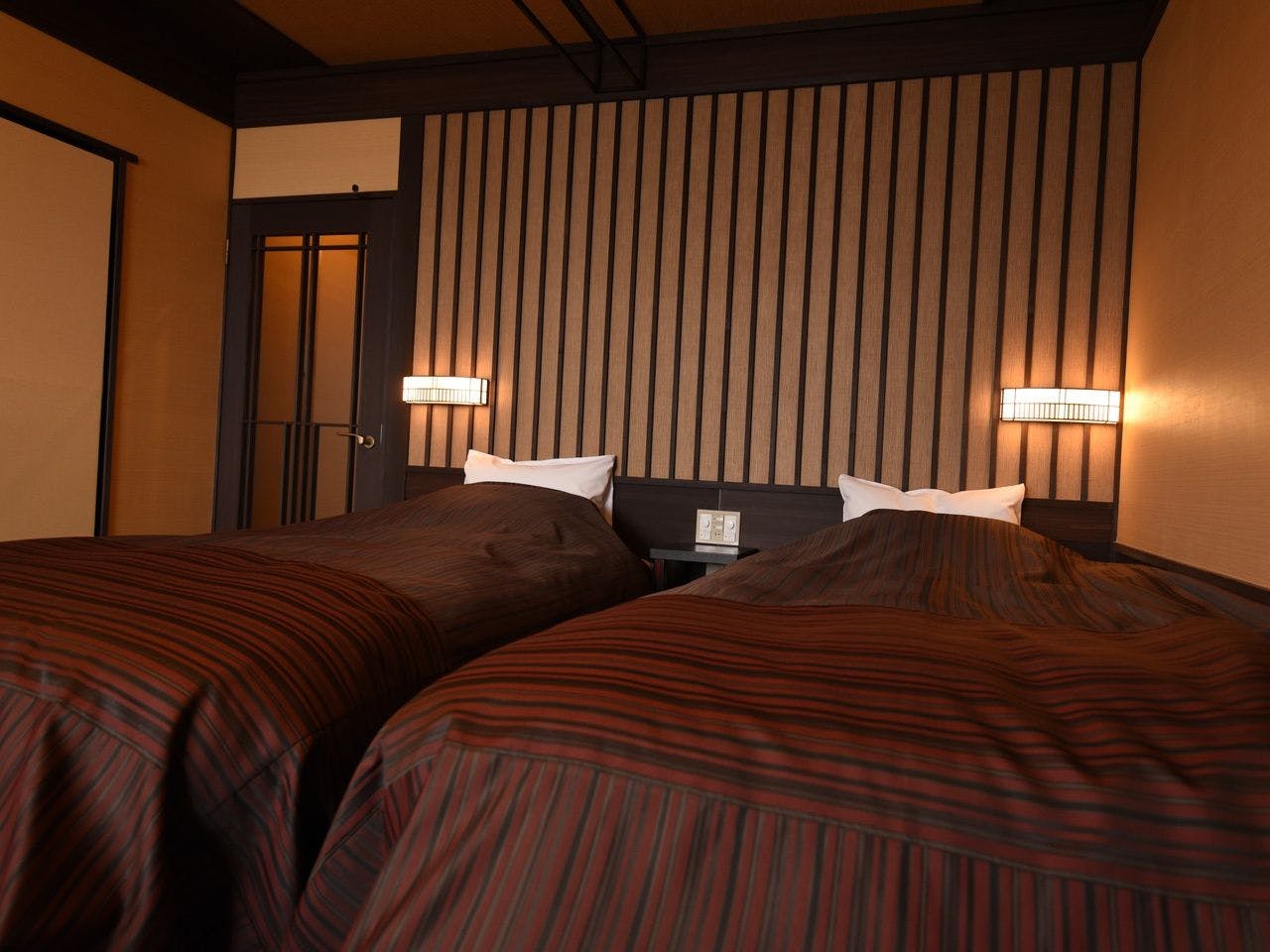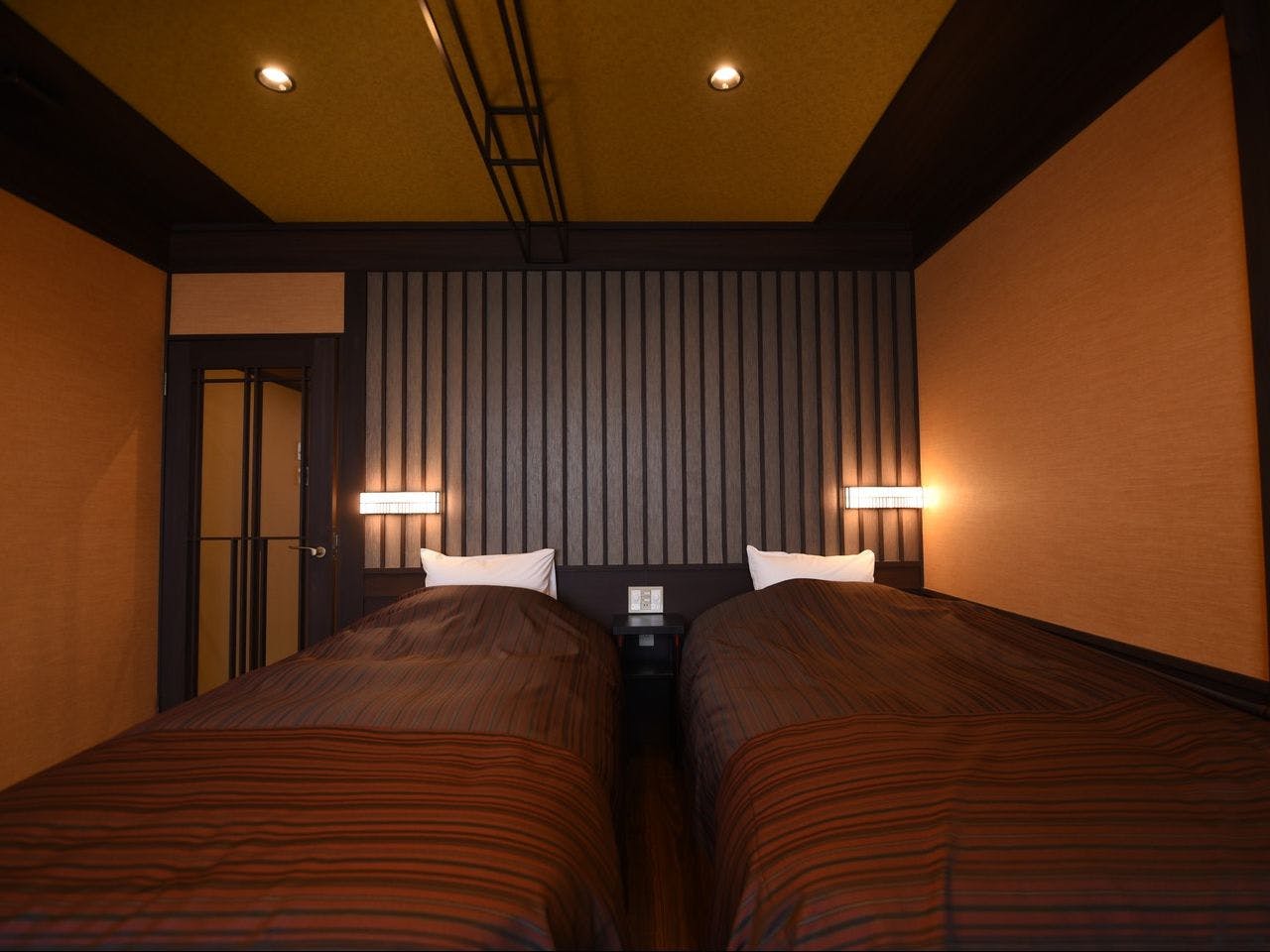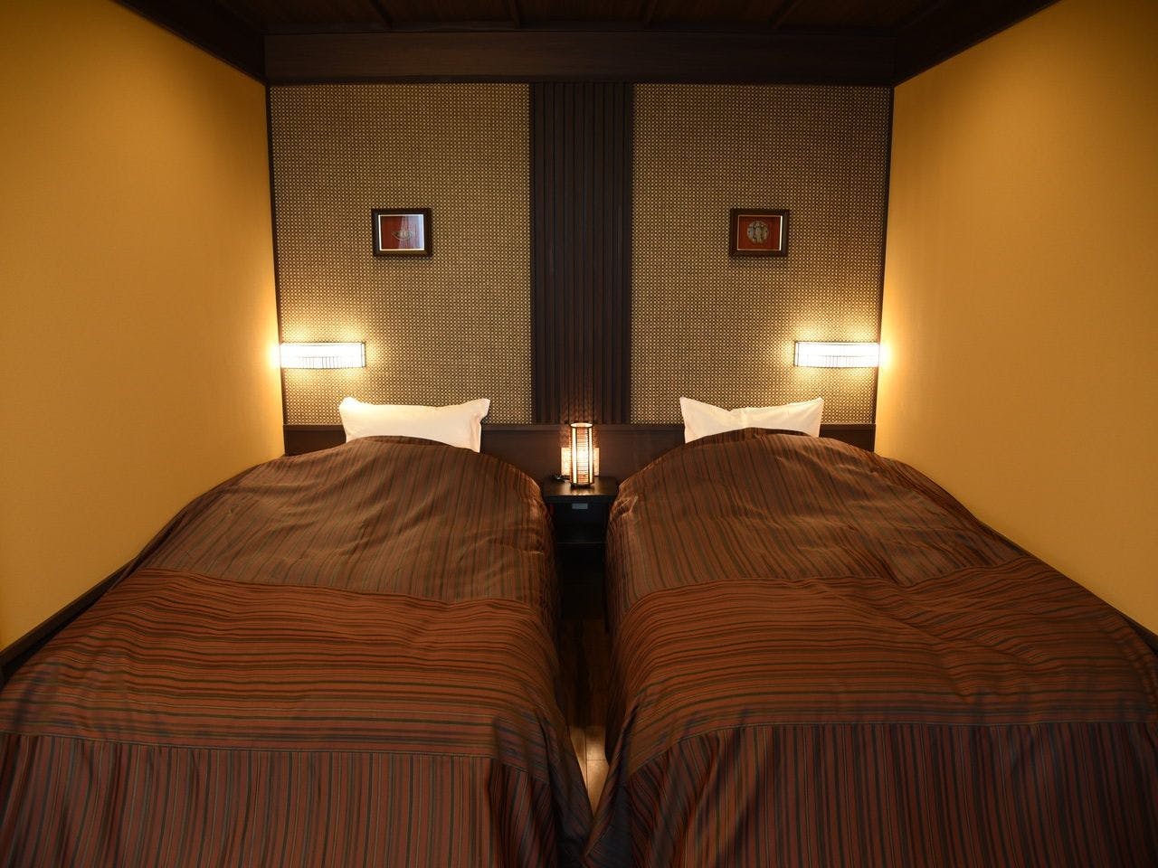 個室風呂付、エアウィーヴ+シモンズベッド(縦200cm×横110cm) 2台、ケトル、ウォシュレット付きトイレ、冷暖房付、冷蔵庫・テレビ、無料LAN