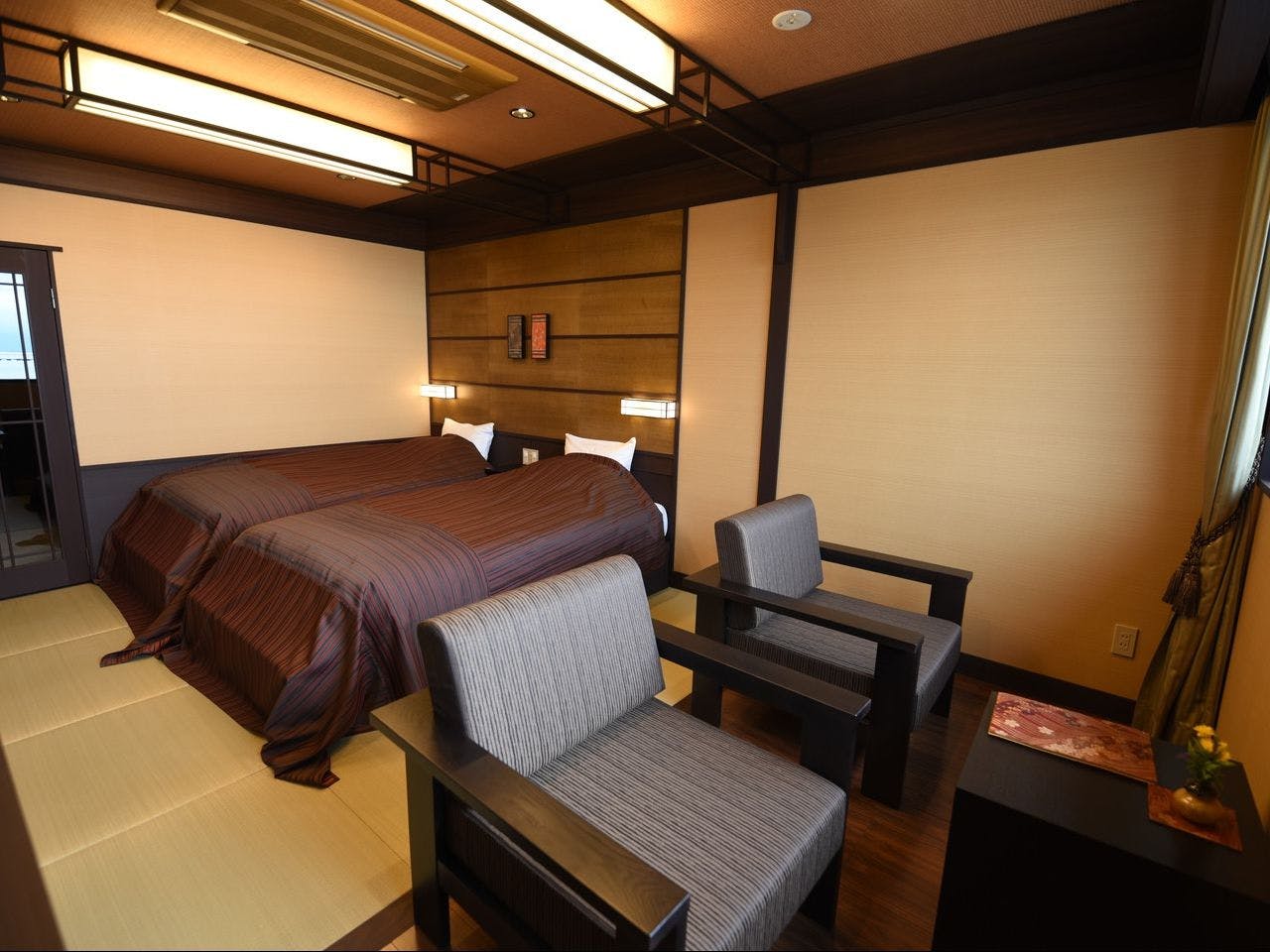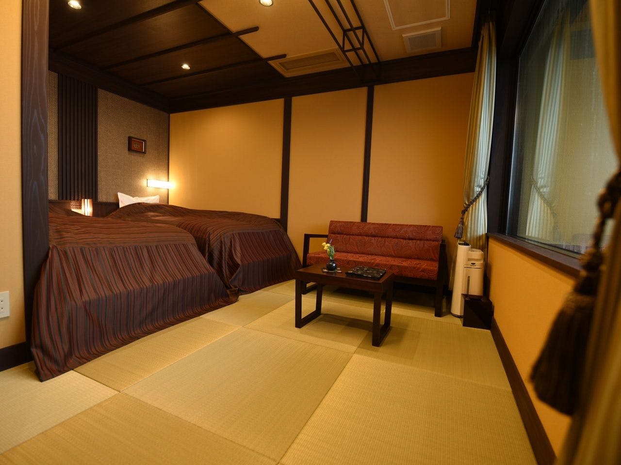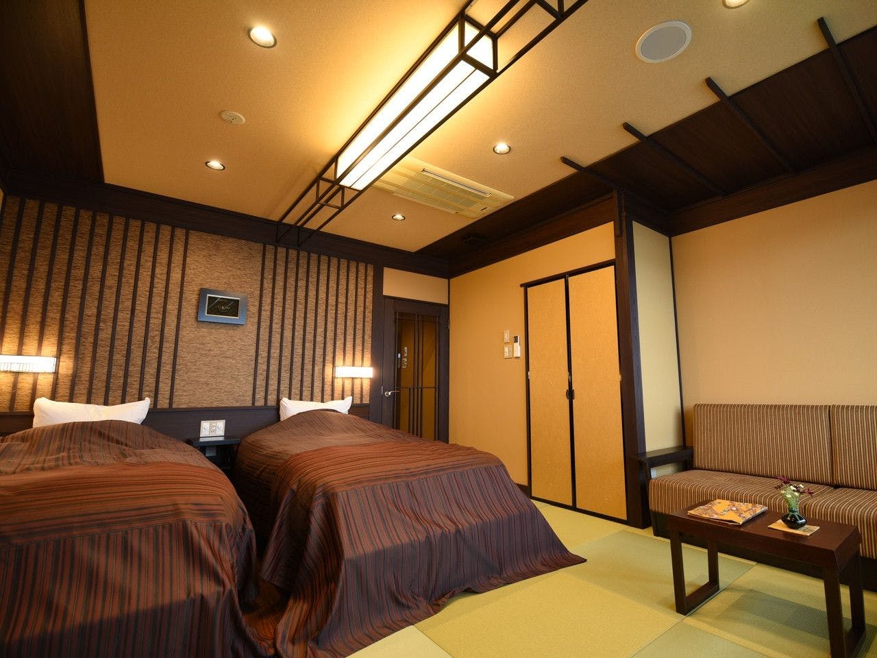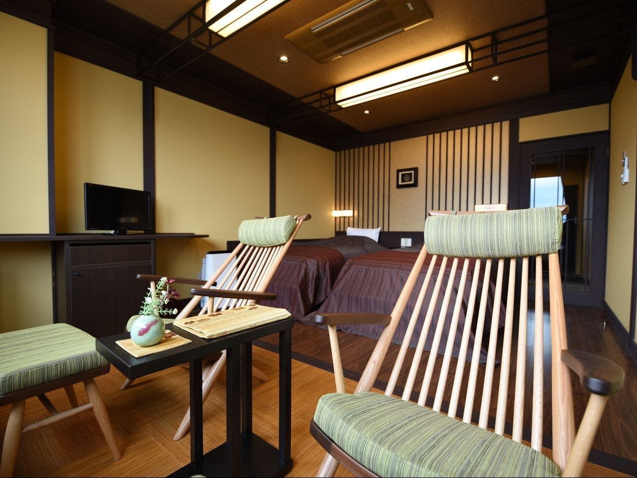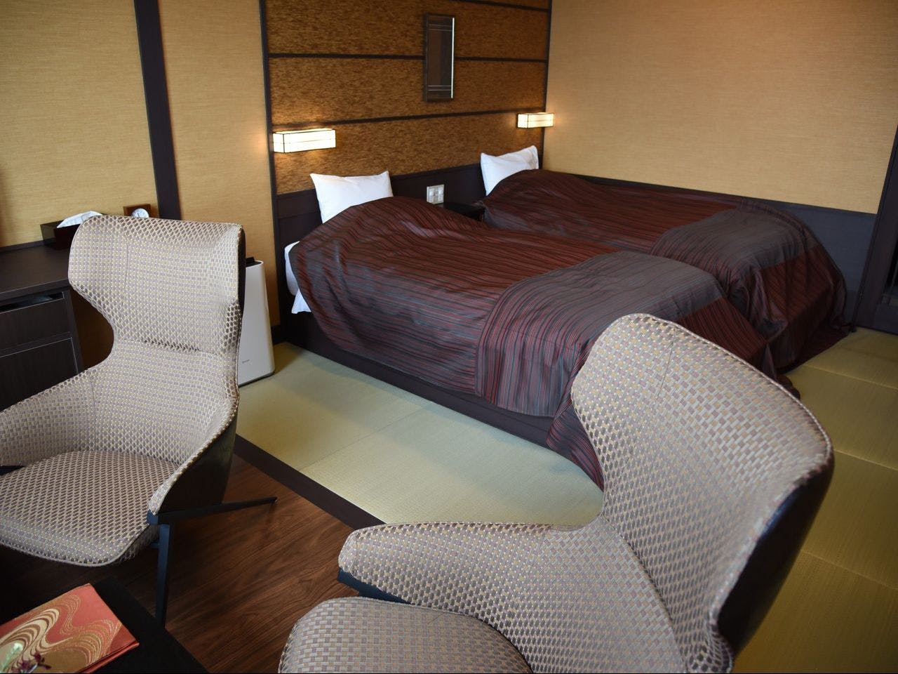 個室風呂付、エアウィーヴ+シモンズベッド(縦200cm×横110cm) 2台、ケトル、ウォシュレット付きトイレ、冷暖房付、冷蔵庫・テレビ、無料LAN