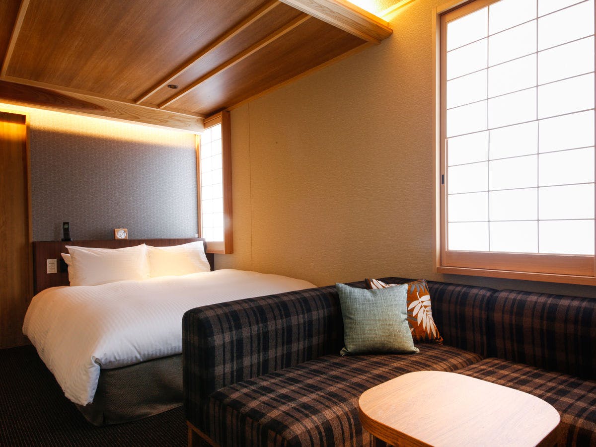 ■靴を脱いで寛げる和風ダブルルームに空見障子を配した約27平米の角部屋
