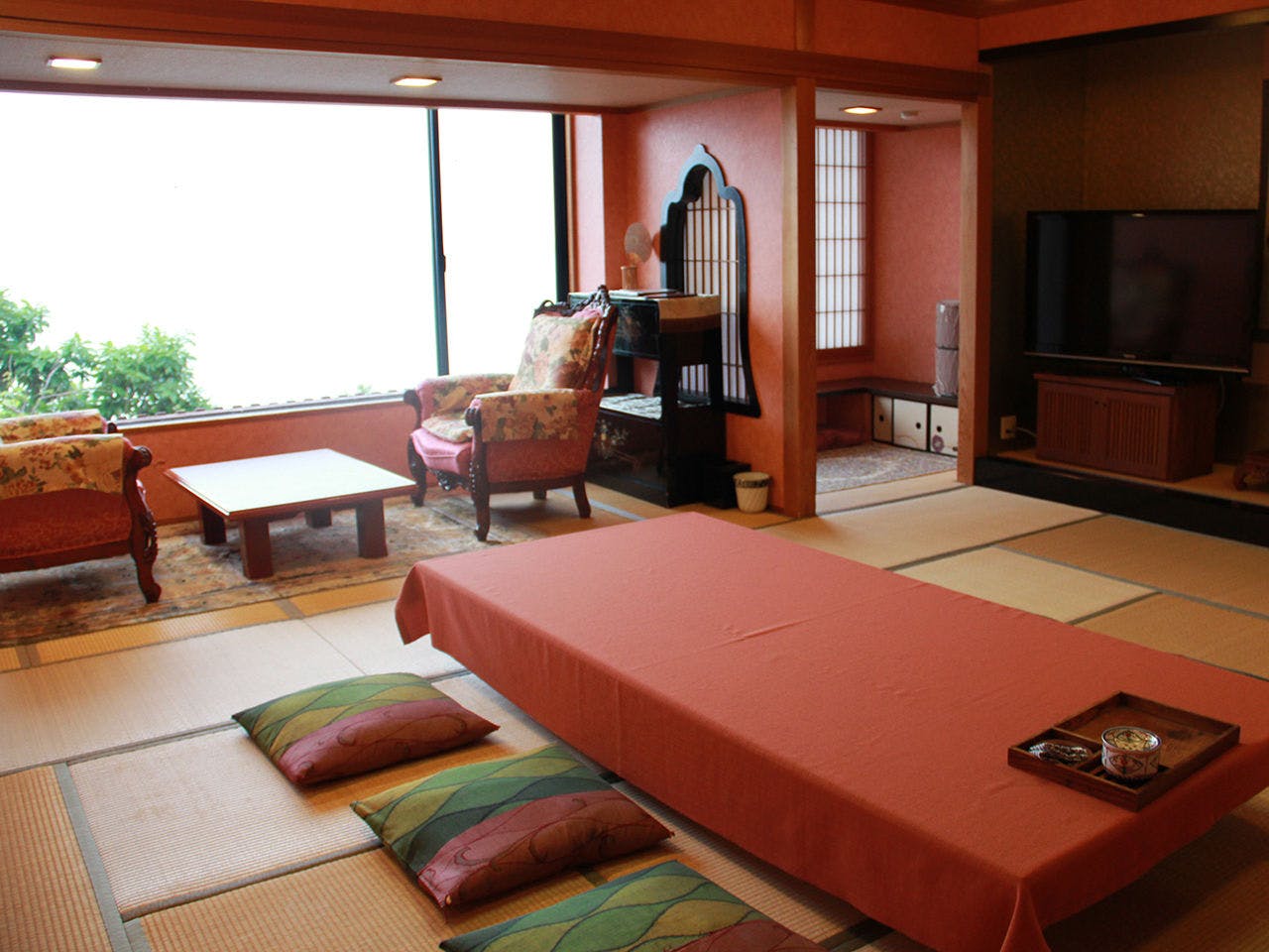 ウッドデッキに露天風呂付、2台のベッドにテーブルと椅子を配置した洋室タイプのお部屋。眼前に有明海&雲仙を一望。バスタオルを着けても入れる!足湯をしながら料理が出てくるのを待つも良し!同じ色にとどまる事のない海にしばし見とれて・・・。湯船では海との一体感を感じて、日常を忘れ身も心も癒されます!!リビングの寛ぎスペースはテーブルにイスをご準備。ご年配の方にもおすすめ。ベッドサイズはお部屋によって変わります。(セミダブル以上)