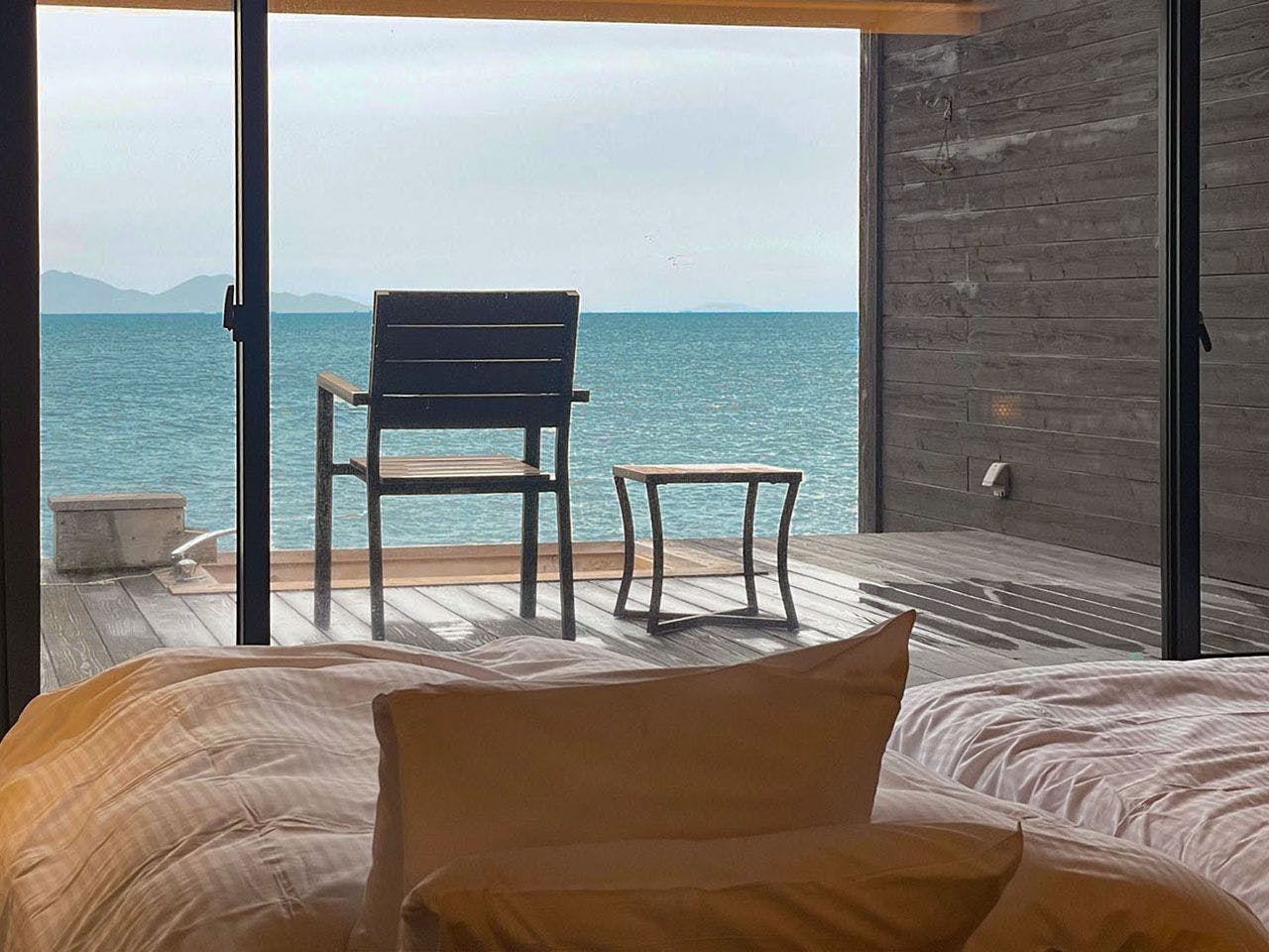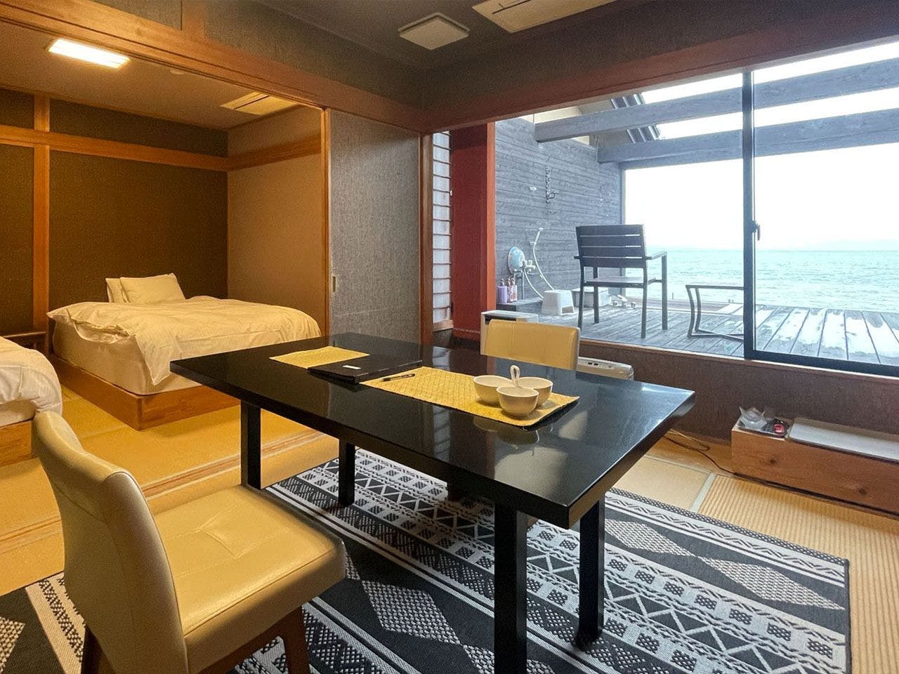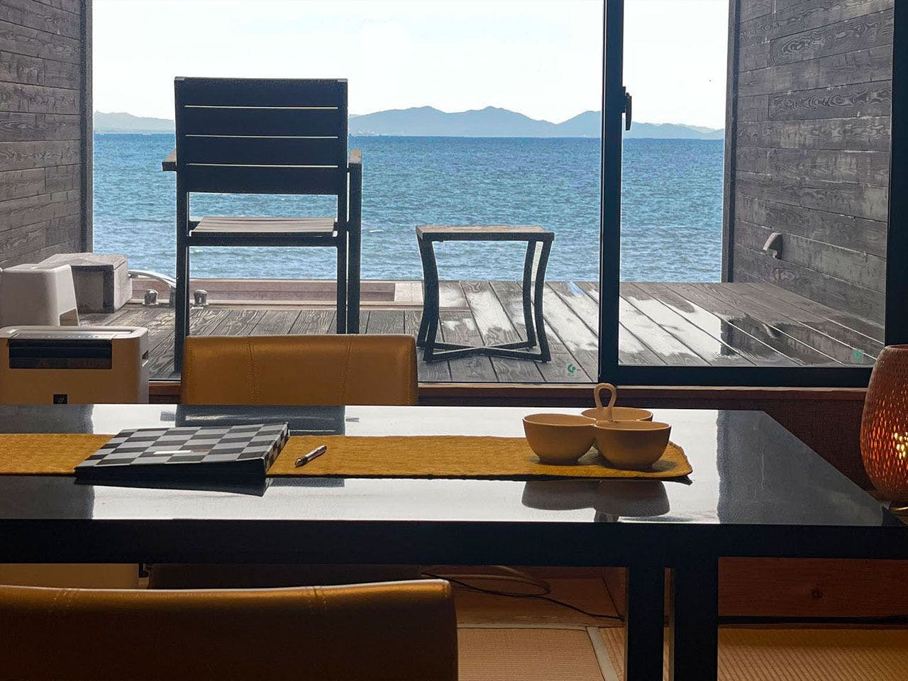 壁一面の窓からは海はすぐそこ!手が届きそうなくらい!有明海と雲仙普賢岳を一望でき潮風と潮の香も感じられます。
