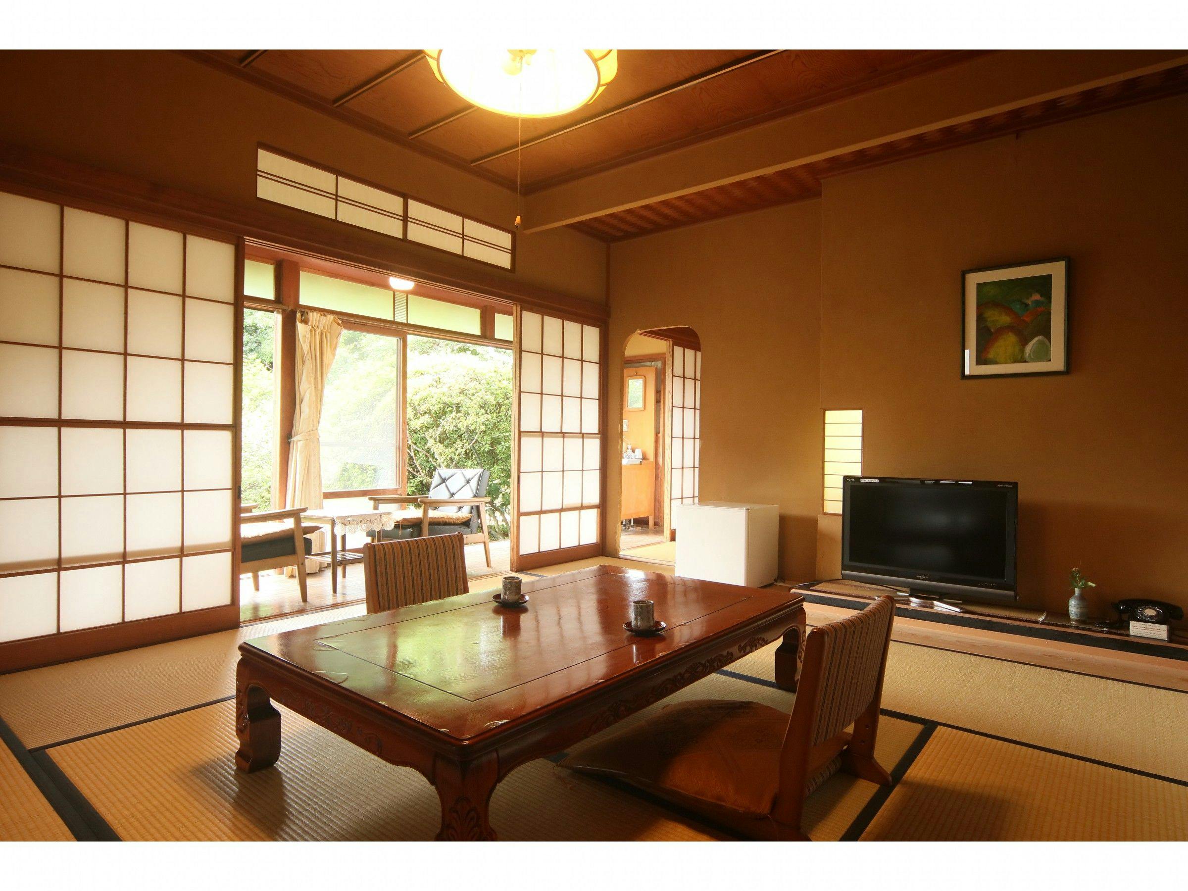 2階の連なる窓は昔ながらの造りで、裏山を右手に下には庭の木々、さつき、つつじ、ゆず、つばきなどを見下ろすことができます。和の空間が二間つづきでゆったり設計され、当館で最も広く日当たりの良い特別室になっております。