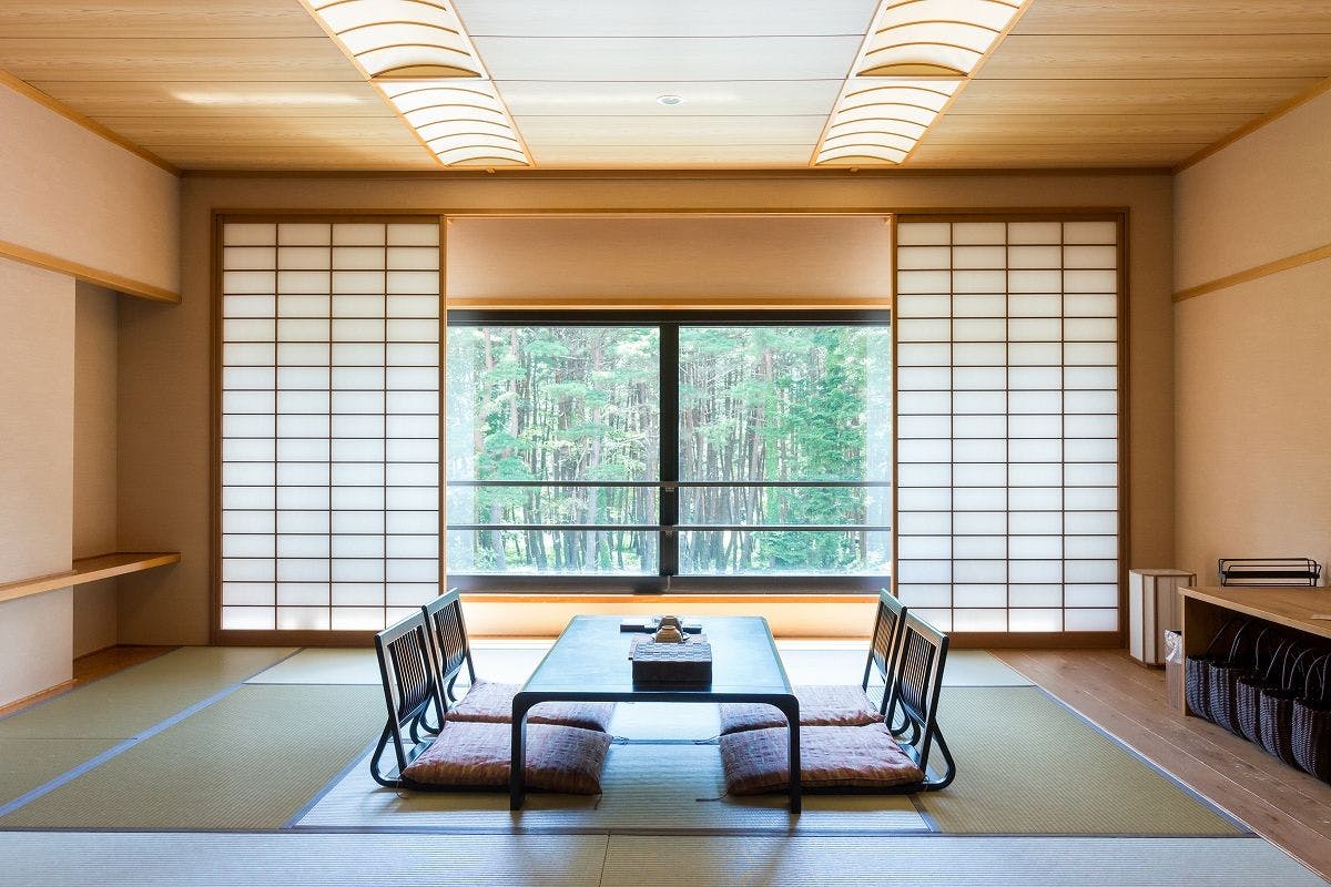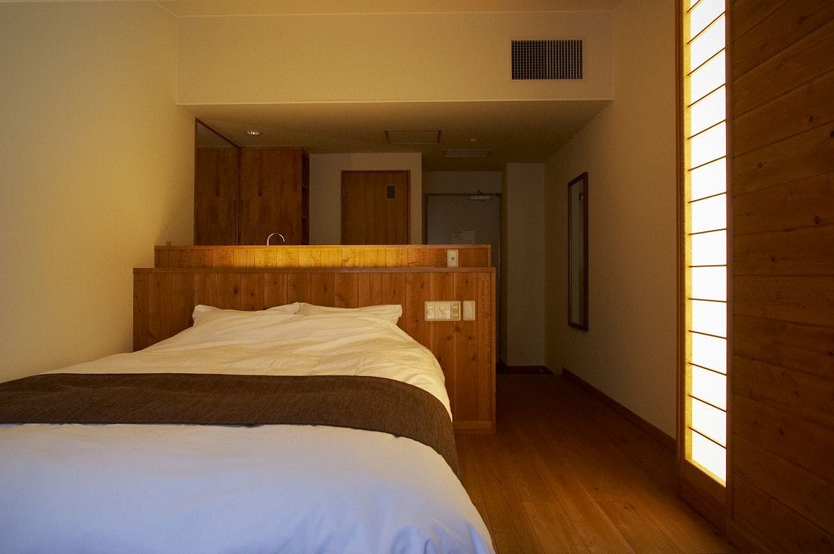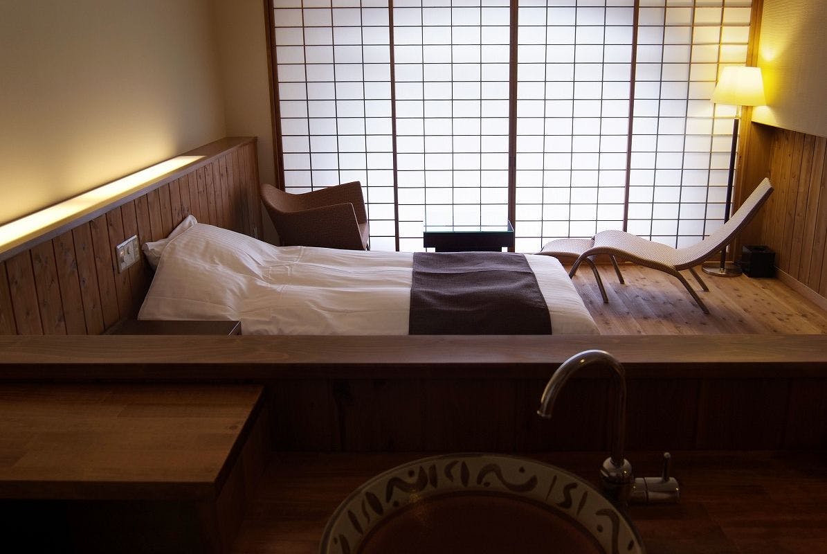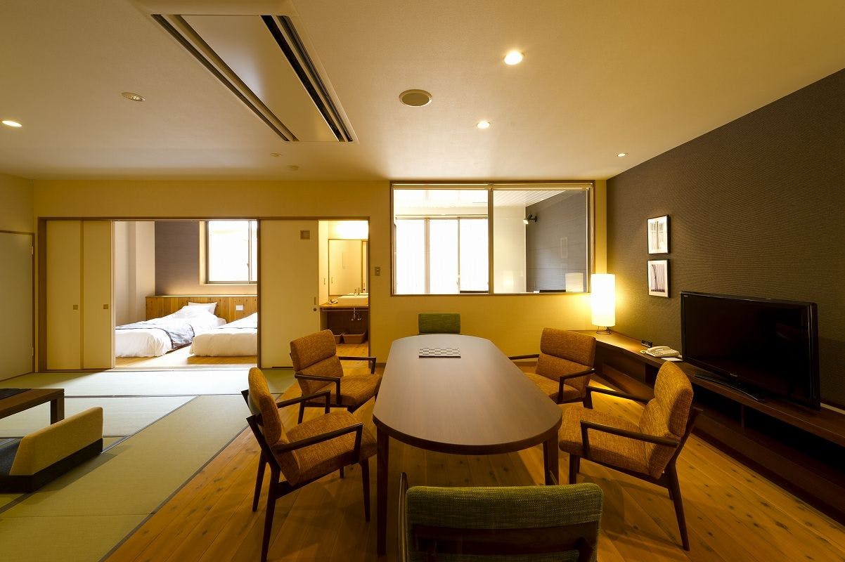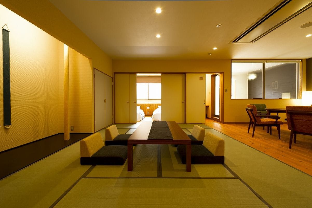 100平米のスイート客室は、檜風呂付の木のぬくもり溢れるプライベートスイート