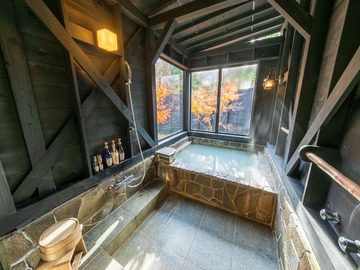 本館1階【半露天風呂】付き客室です。窓からは箱根季節の木々を眺めながらゆっくりとご自分のお好きな時に客室専用お風呂に入り、ご自分のお時間をお過ごしいただけます。当客室では密回避のため大浴場のご使用ができませんので予めご了承くださいませ。