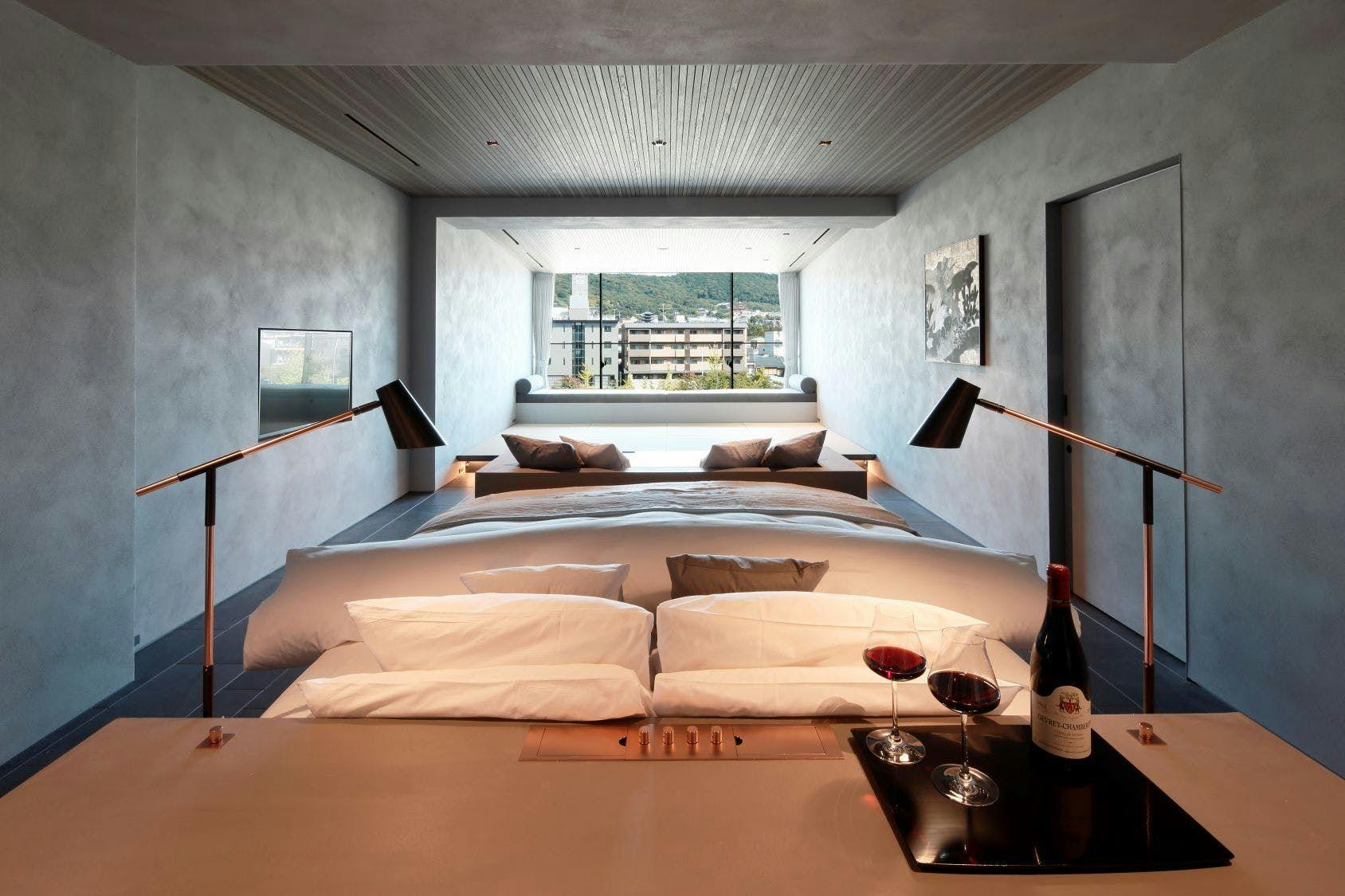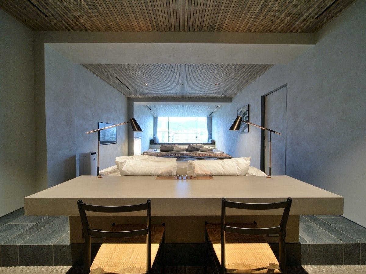 ワンフロアに1室のみで快適にご利用いただける仕様です。当館は【ペット不可】ですので予めご了承ください。<全室禁煙でございます>京都ならではの街並みから一歩入るとモダンな世界に引き込まれます。お部屋からは鴨川を眺めることができ、四季の移ろいを感じていただけます。お部屋にはキングサイズのベッドが一台ございます。また簡易キッチンもあり、連泊の方にもぴったりです。京都観光の二人旅、グループ旅行、帰省、記念日など様々なシーンでご利用下さい。
