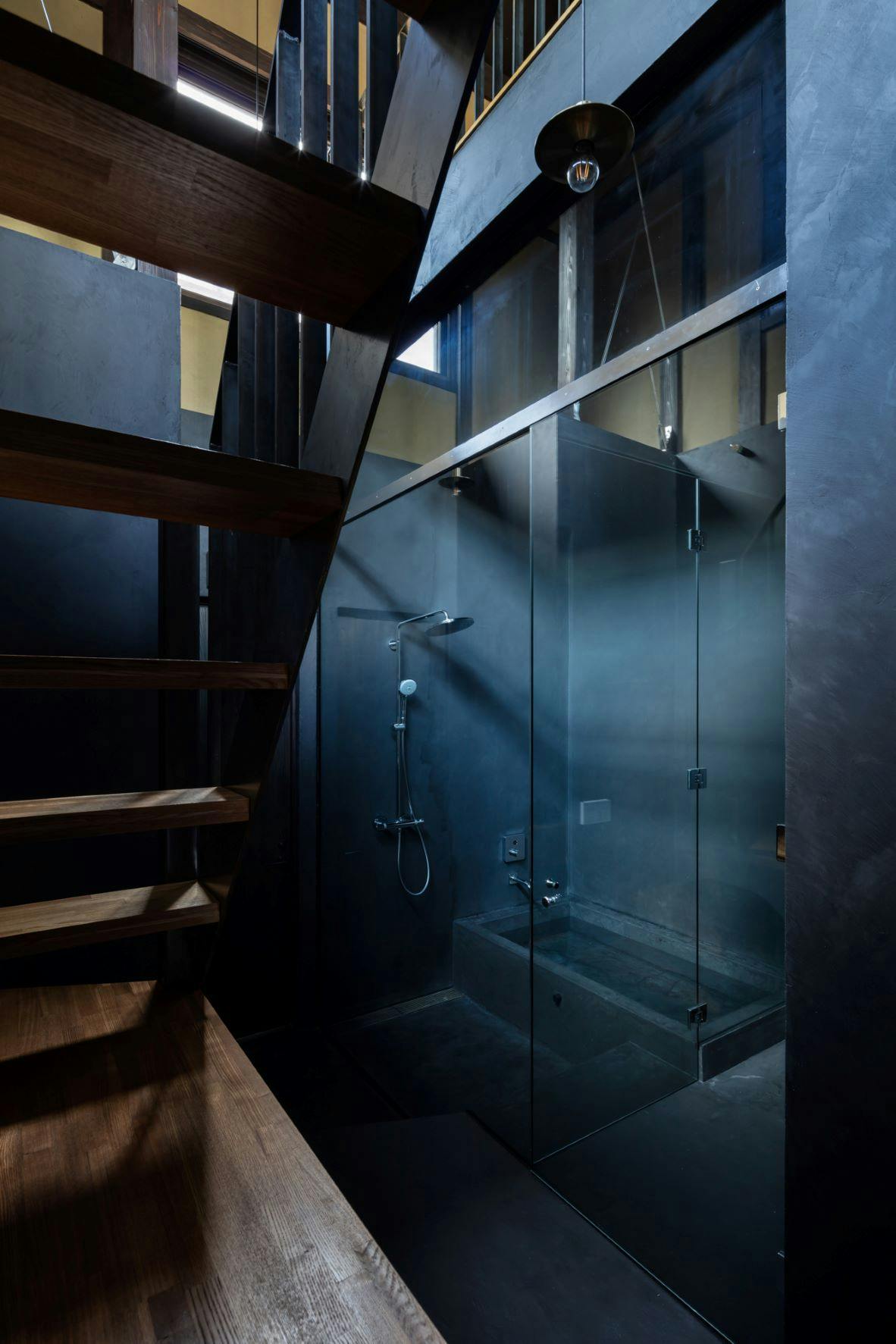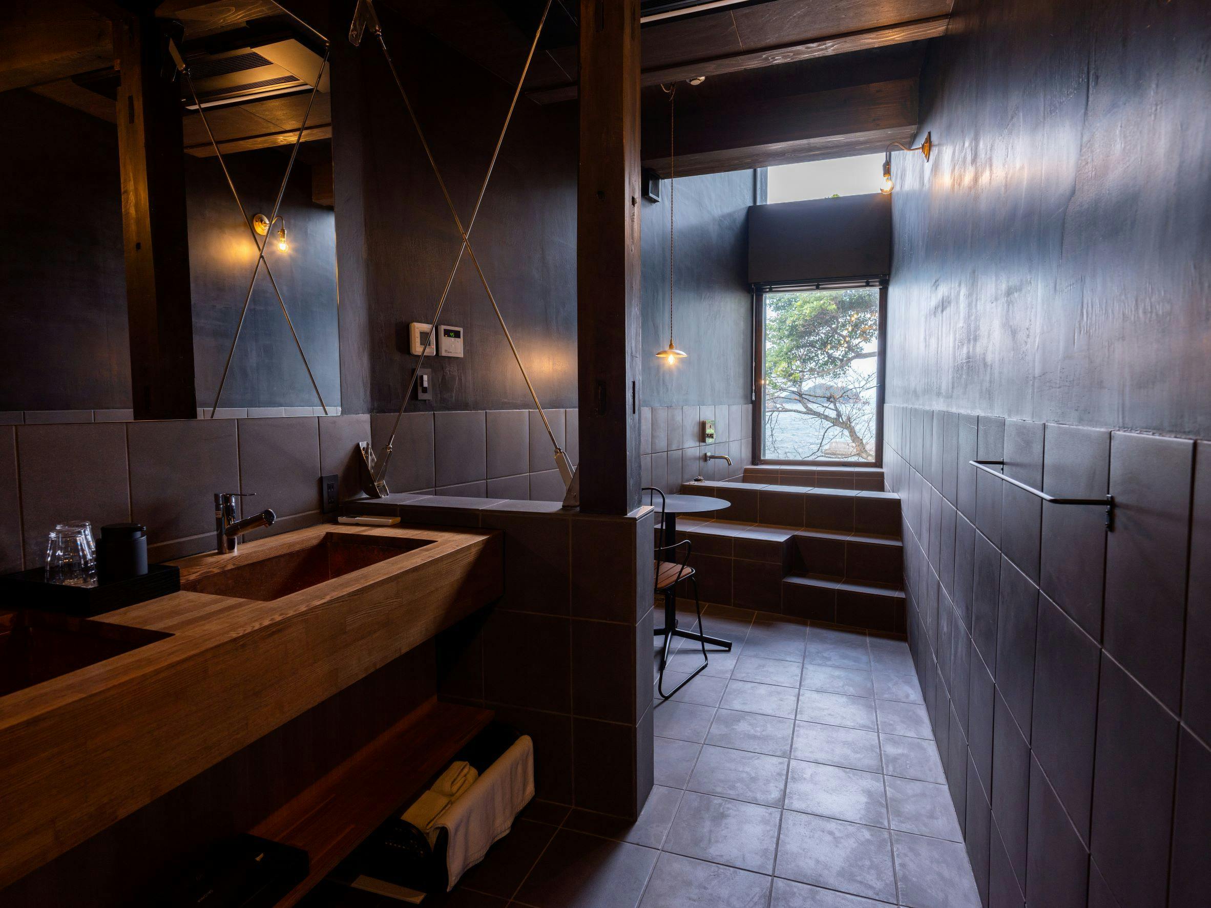 nami は、ガラス張りと黒モルタル仕上げが特徴的なバスルームは、広々と足を伸ばしてゆっくりおくつろぎいただけます。
