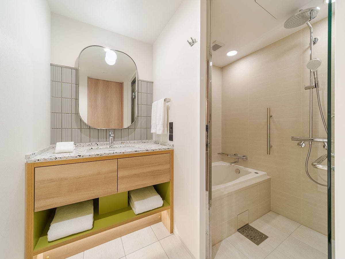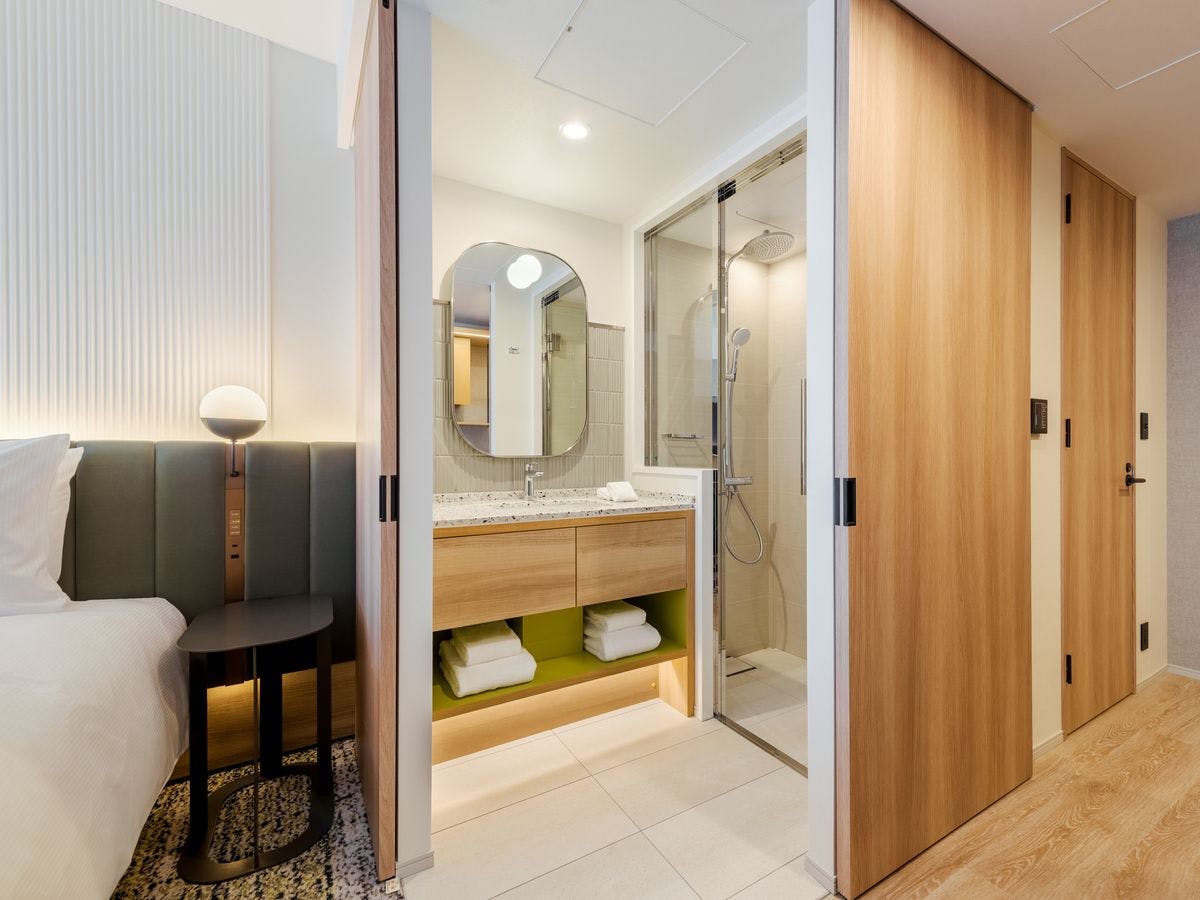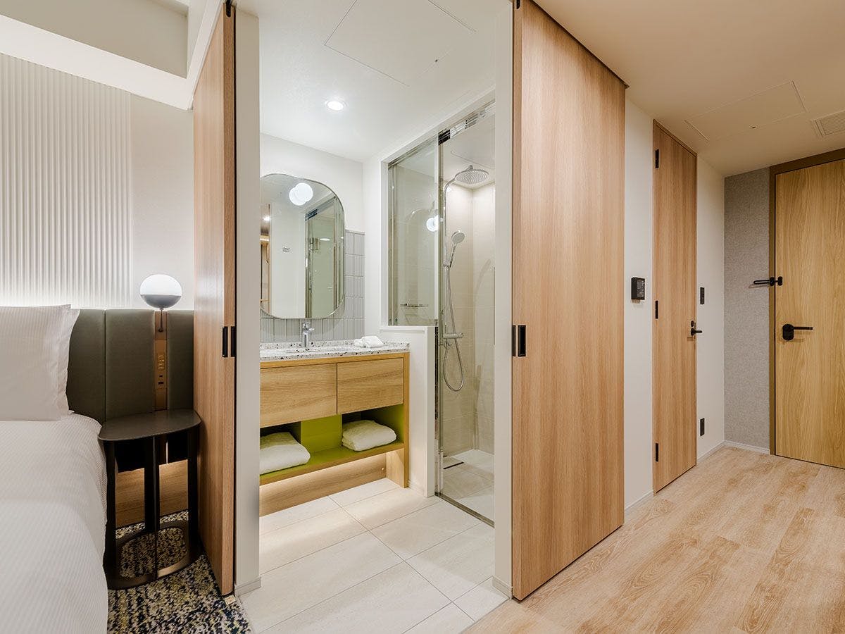 「木」を基調とし、京都らしさを取り入れたインテリア。バスタブ無し、シャワーブースのみ。独立型シャワーブースを装備。※歯ブラシはご希望の方に環境に優しいヘッド交換式のものをフロントでご用意。