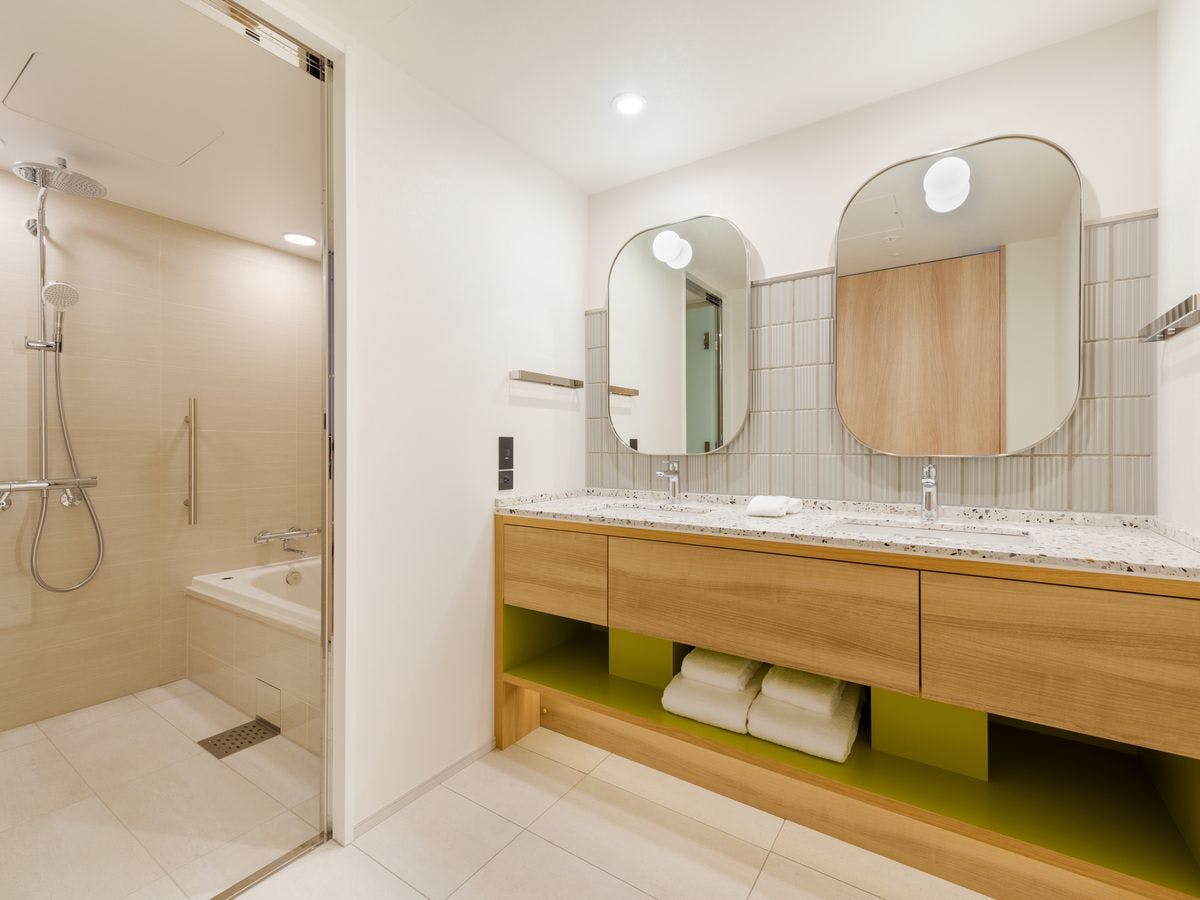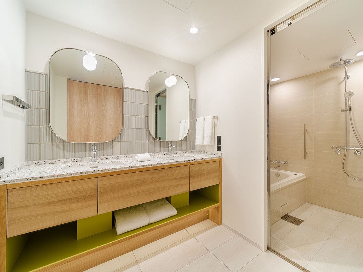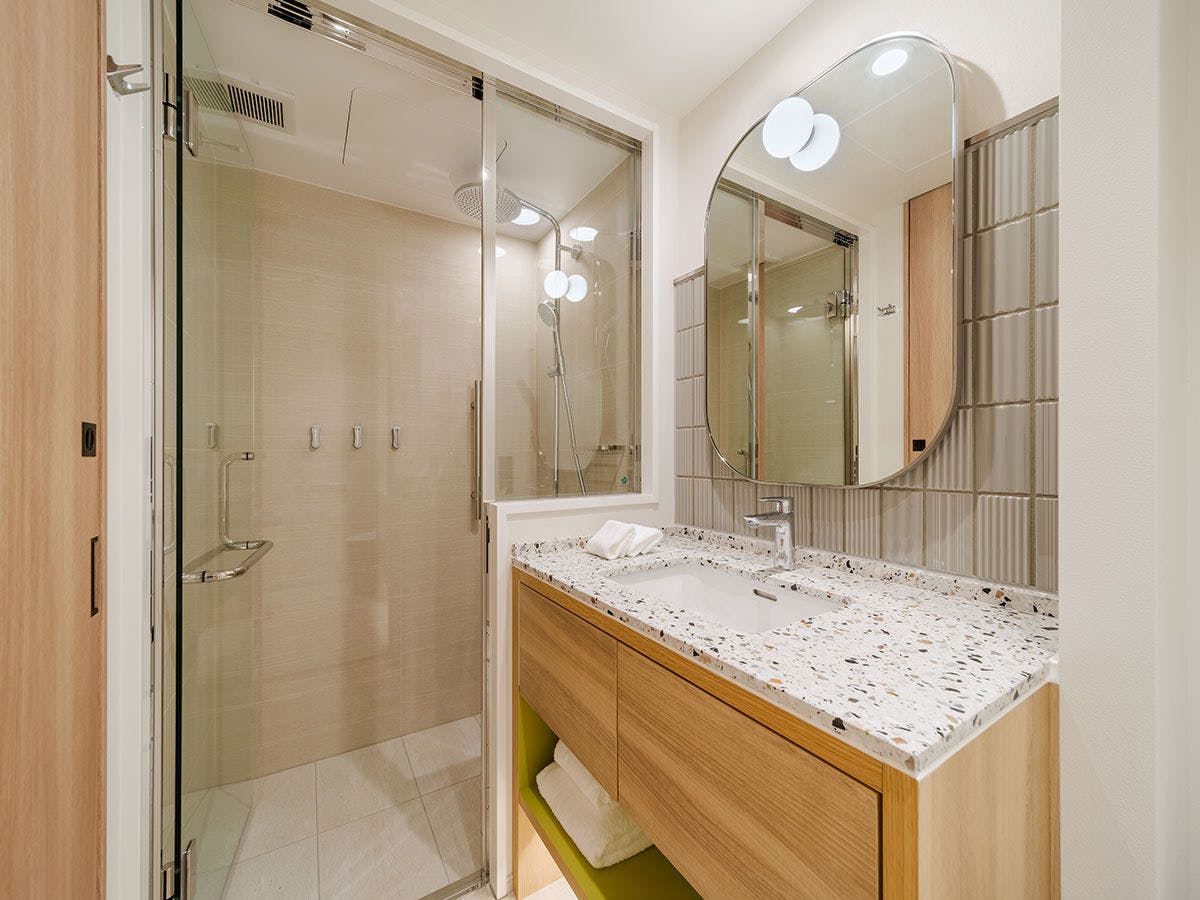 「木」を基調とし、京都らしさを取り入れたインテリア。バスタブ無し、シャワーブースのみ。独立型シャワーブースを装備。※歯ブラシはご希望の方に環境に優しいヘッド交換式のものをフロントでご用意。