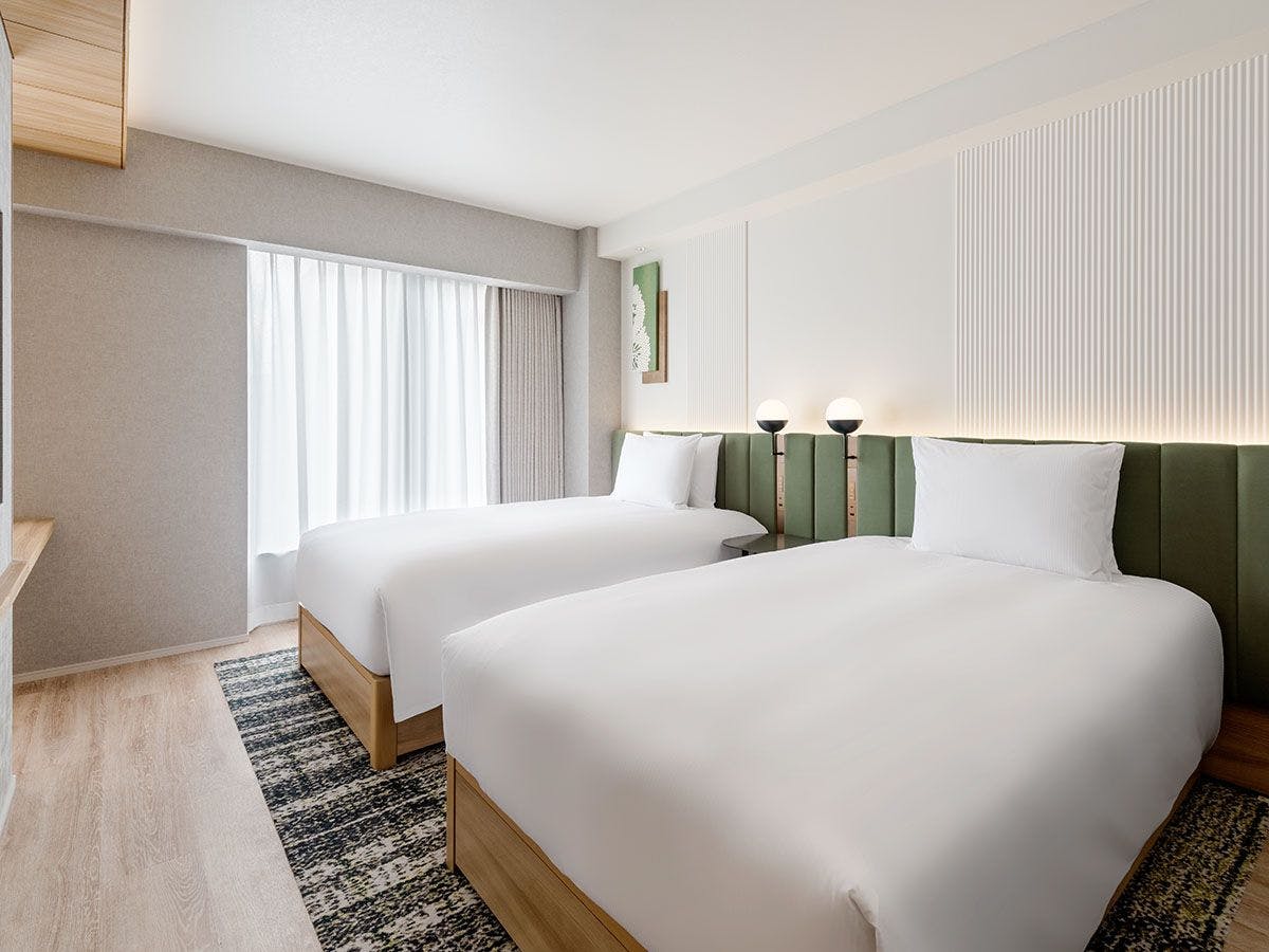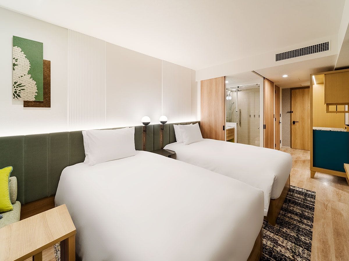 ハリウッドツイン仕様。トランドルベッド設置で最大3名様宿泊可。バスタブ無し、シャワーブースのみ。独立型シャワーブース装備。※歯ブラシはご希望の方に環境に優しいヘッド交換式のものをフロントでご用意。