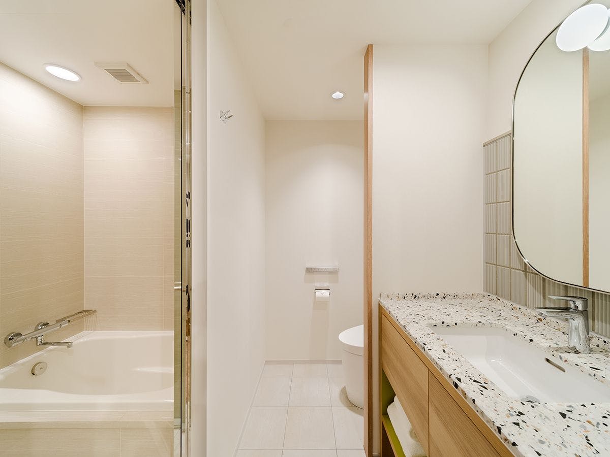 「木」を基調とし、京都らしさを取り入れた温かみのあるインテリア。シャワー付きの洗い場とバスタブを装備したバスルームがございます。※歯ブラシはご希望の方に環境に優しいヘッド交換式のものをフロントでご用意。