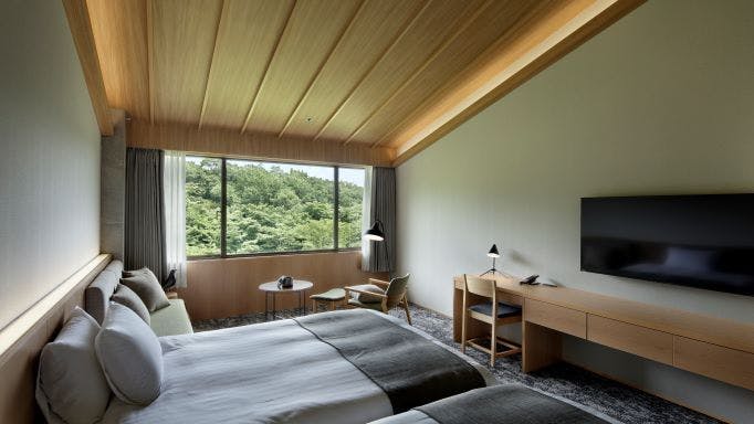 高い傾斜天井から眺める雄大な森の景色が開放的なツインルーム