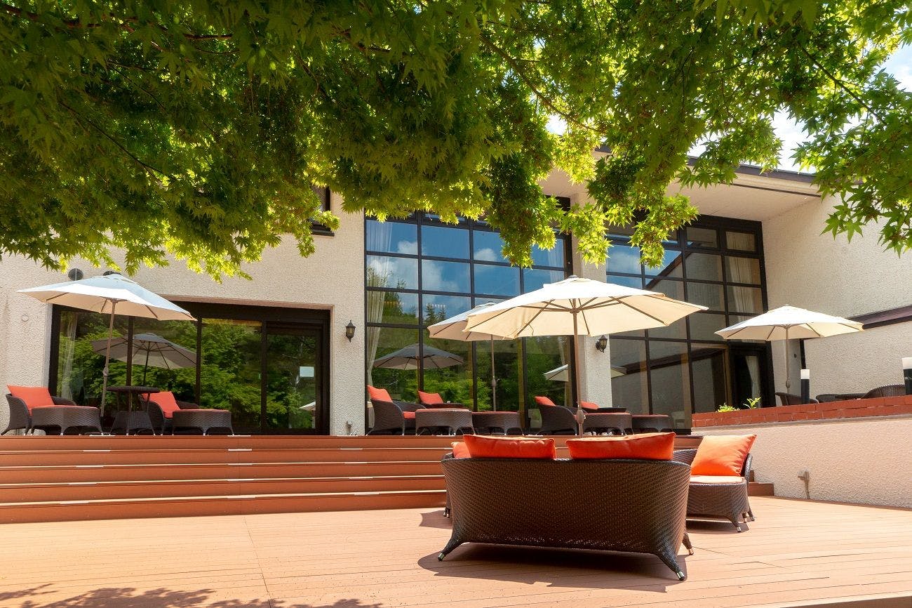 敷地内はウッドデッキが敷き詰められ、客室には