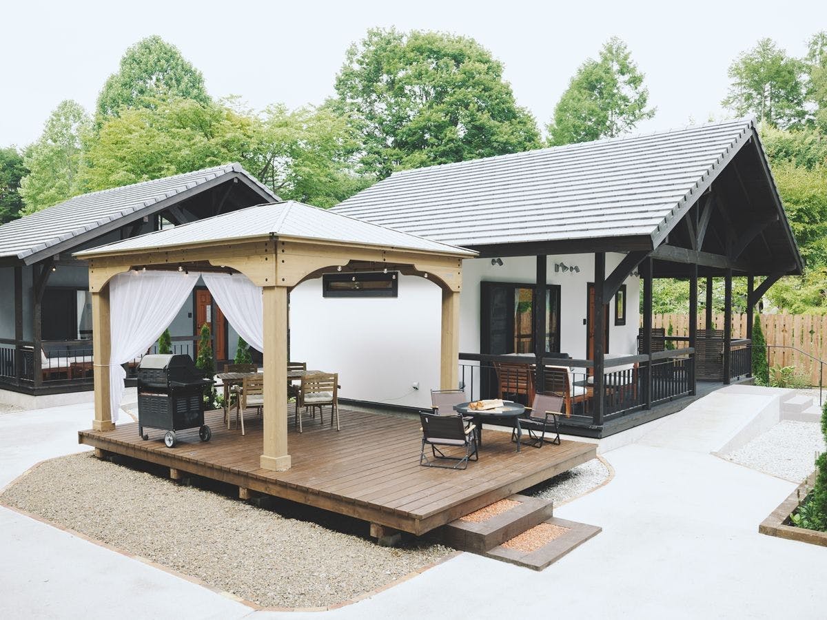 2棟限定、焚き火台デッキ・専用ガゼボ・リビングデッキを完備。
