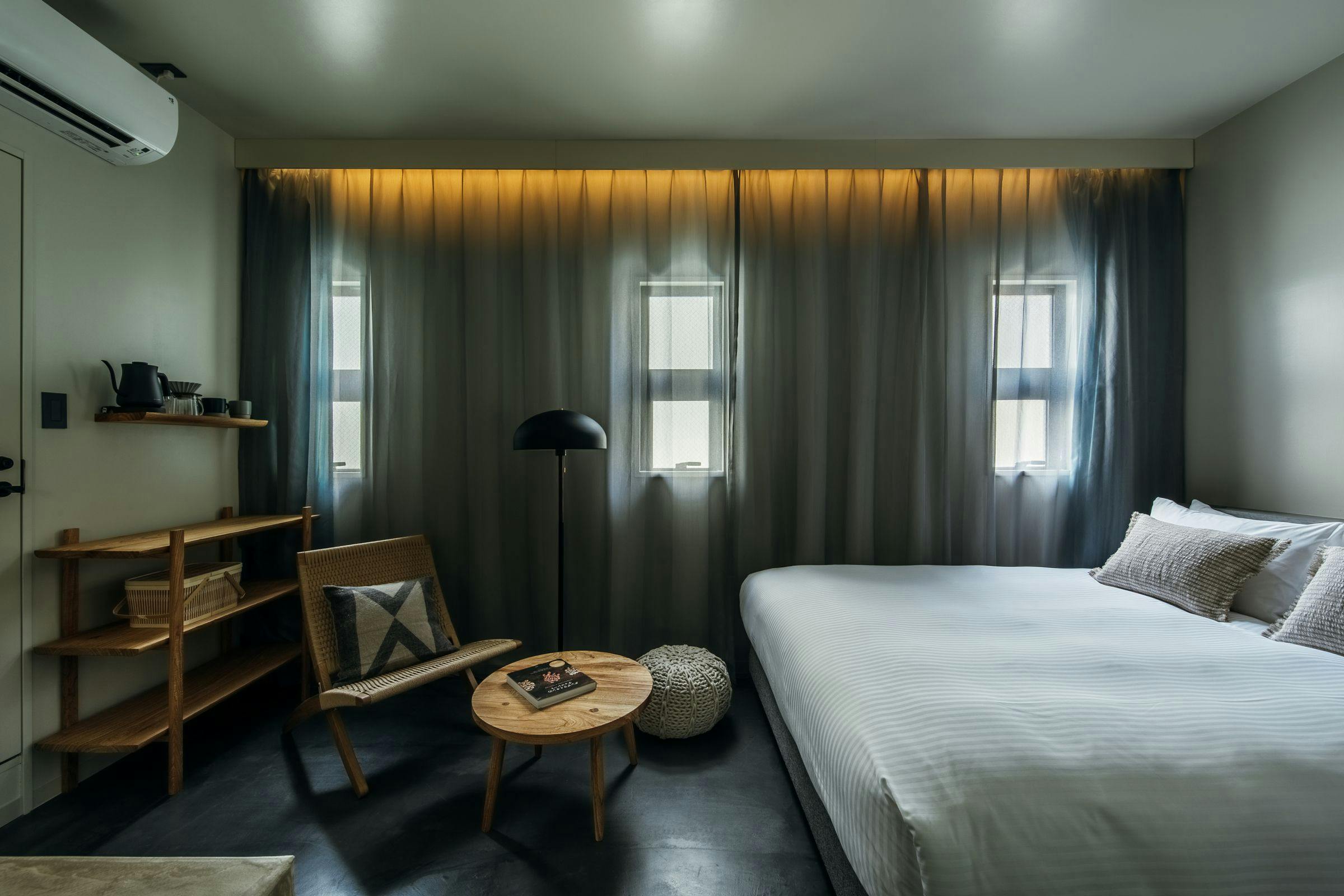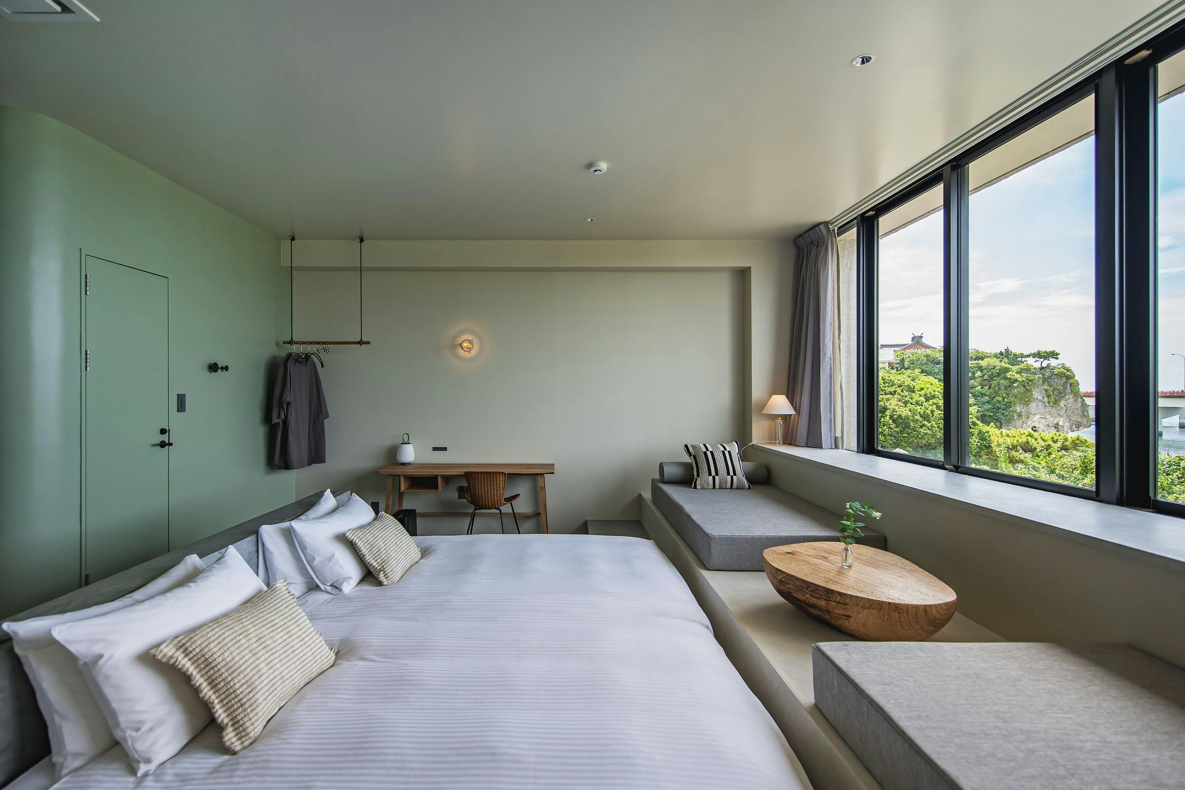 ビーチサイド、コーナーに配置されたこのお部屋は、大きなダイニングテーブルとくつろぎのリビングスペースを備え、グループやご家族で食事を楽しむことができるコンセプトにしました。シャワーブースとトイレはセパレート、独立洗面台で使い勝手の良いお部屋です。