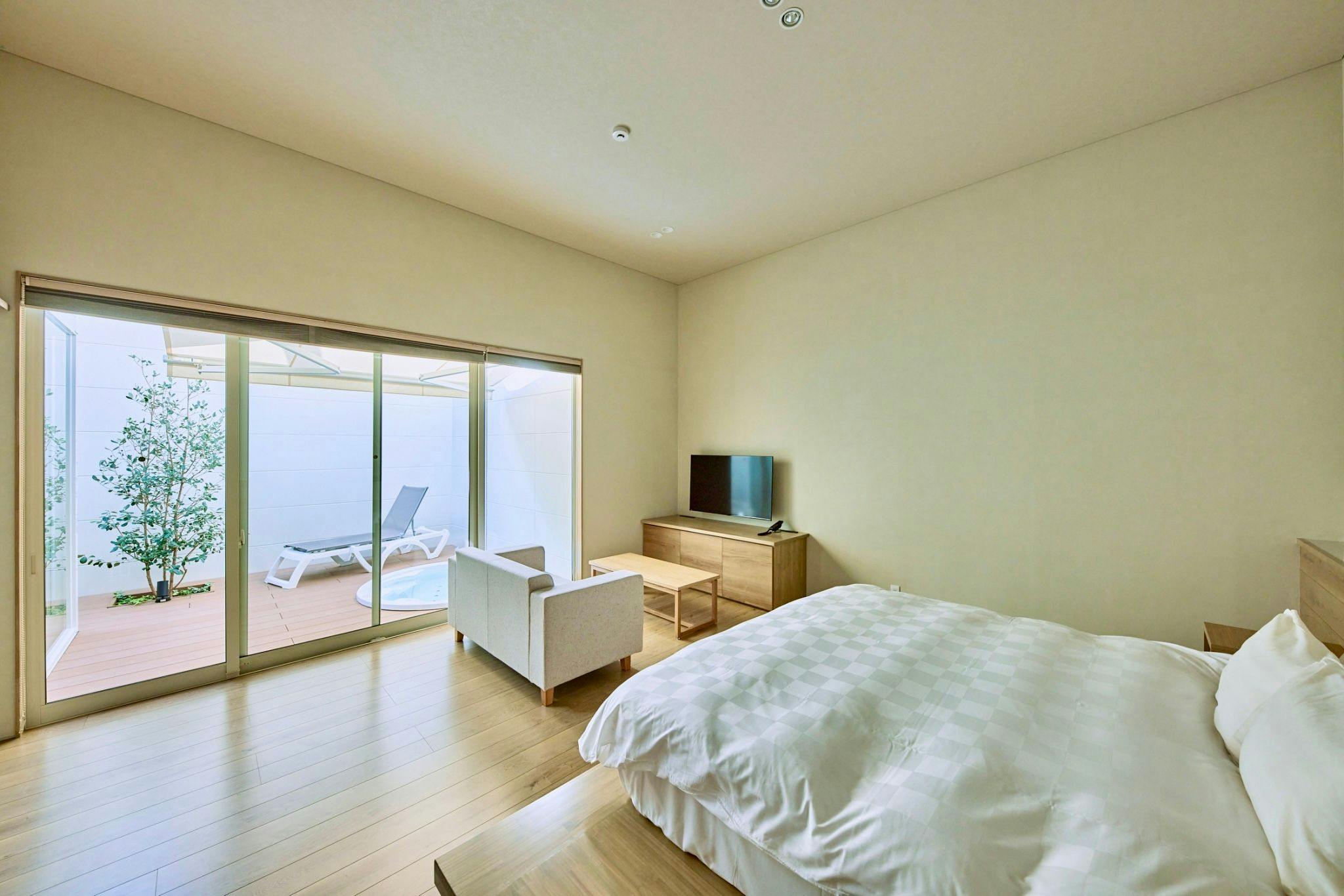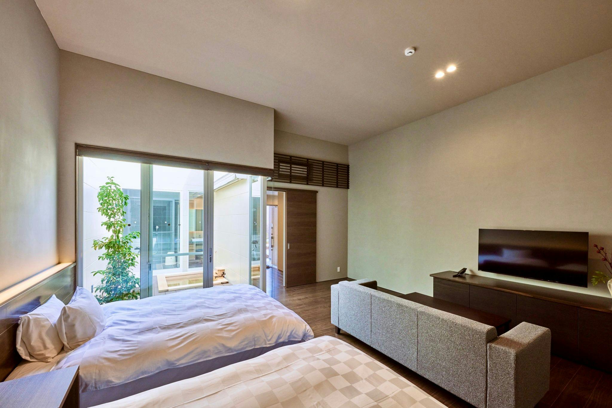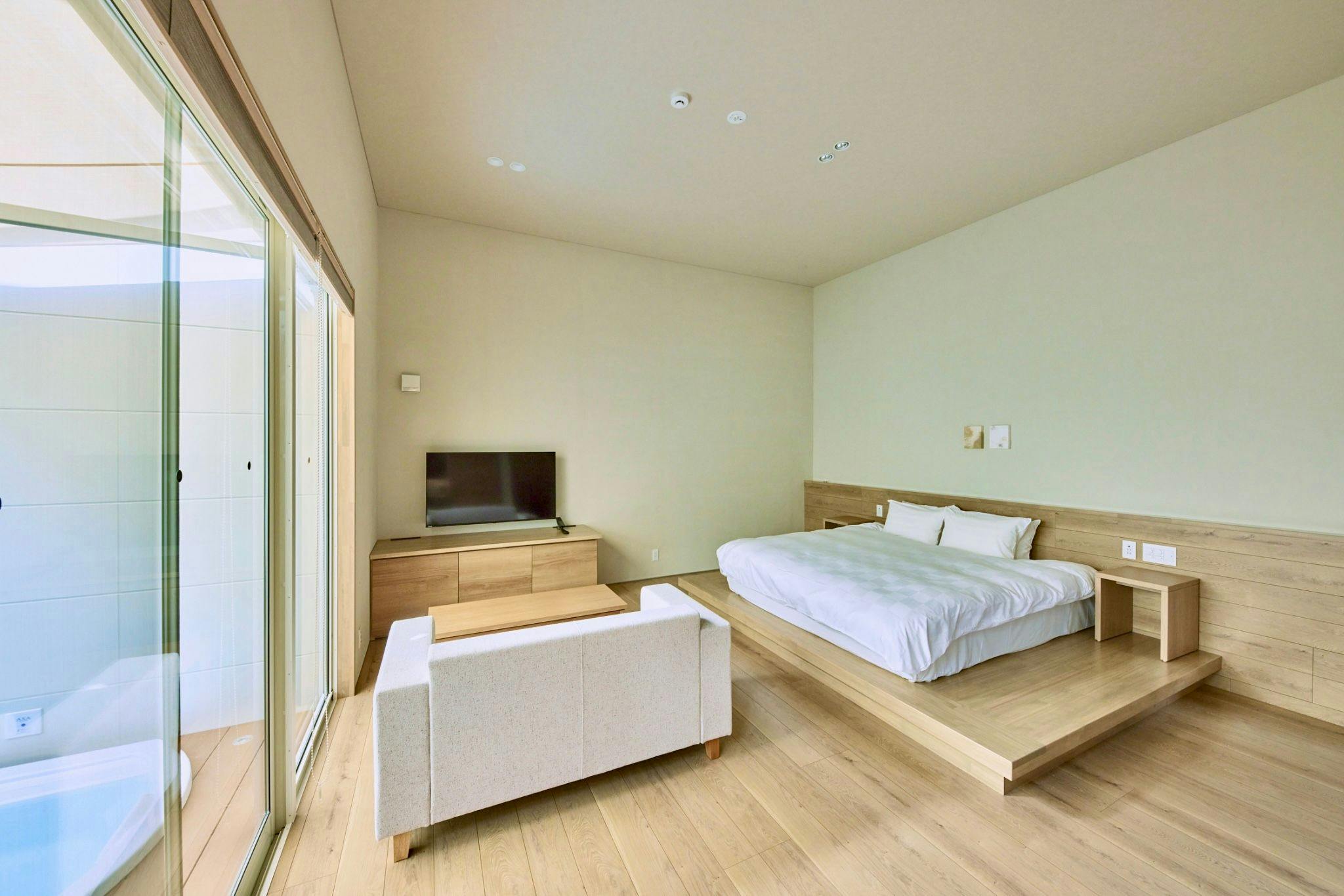 ・洋室、シモンズ製キングサイズベッド(1800×2000)使用。