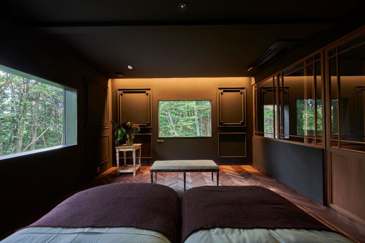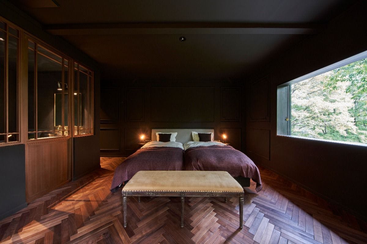 玄は黒のひとつ手前、煤や炭を薄く重ねて出来上がるような、無彩色です。二面の窓から美しい緑が目に飛び込んできたときまるで絵画のような窓外の風景と、それを引き立てるための黒壁がこの部屋のシンボルに決まりました。クラシカルモダン、ヨーロッパのホテルをモチーフにした内装、窓枠を配さず一枚のまるで一枚の絵画のような窓外の風景をお愉しみください。