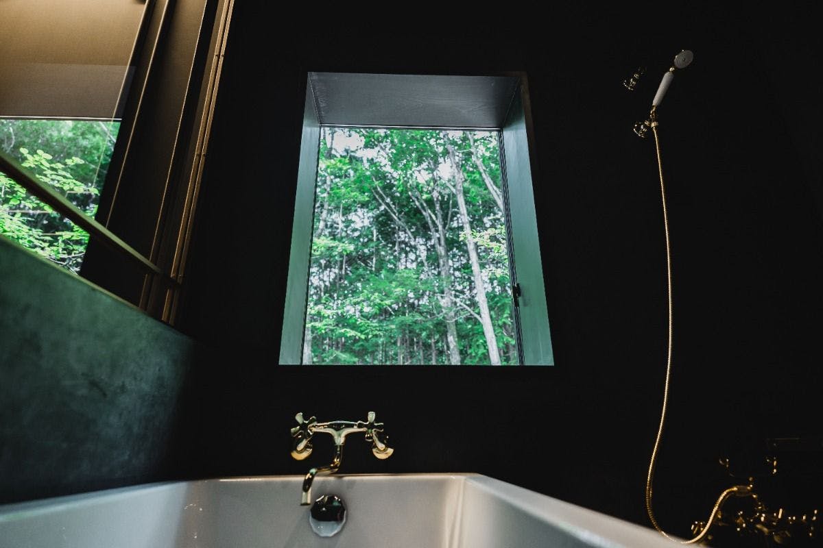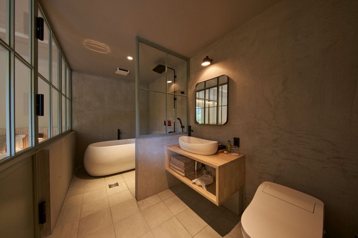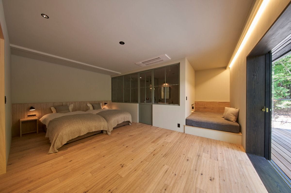 21平米ものプライベートテラスを備え、最大3名でご宿泊いただけるのが最も広いお部屋。東から昇る朝日に包まれた柔らかな緑色をイメージして翠と名づけました。北欧風のインテリアに特徴的なフォルムのバスタブ、シングルベッド2台と、デイベッドとしてもご利用いただけるセミダブルベッド1台をご用意しています。