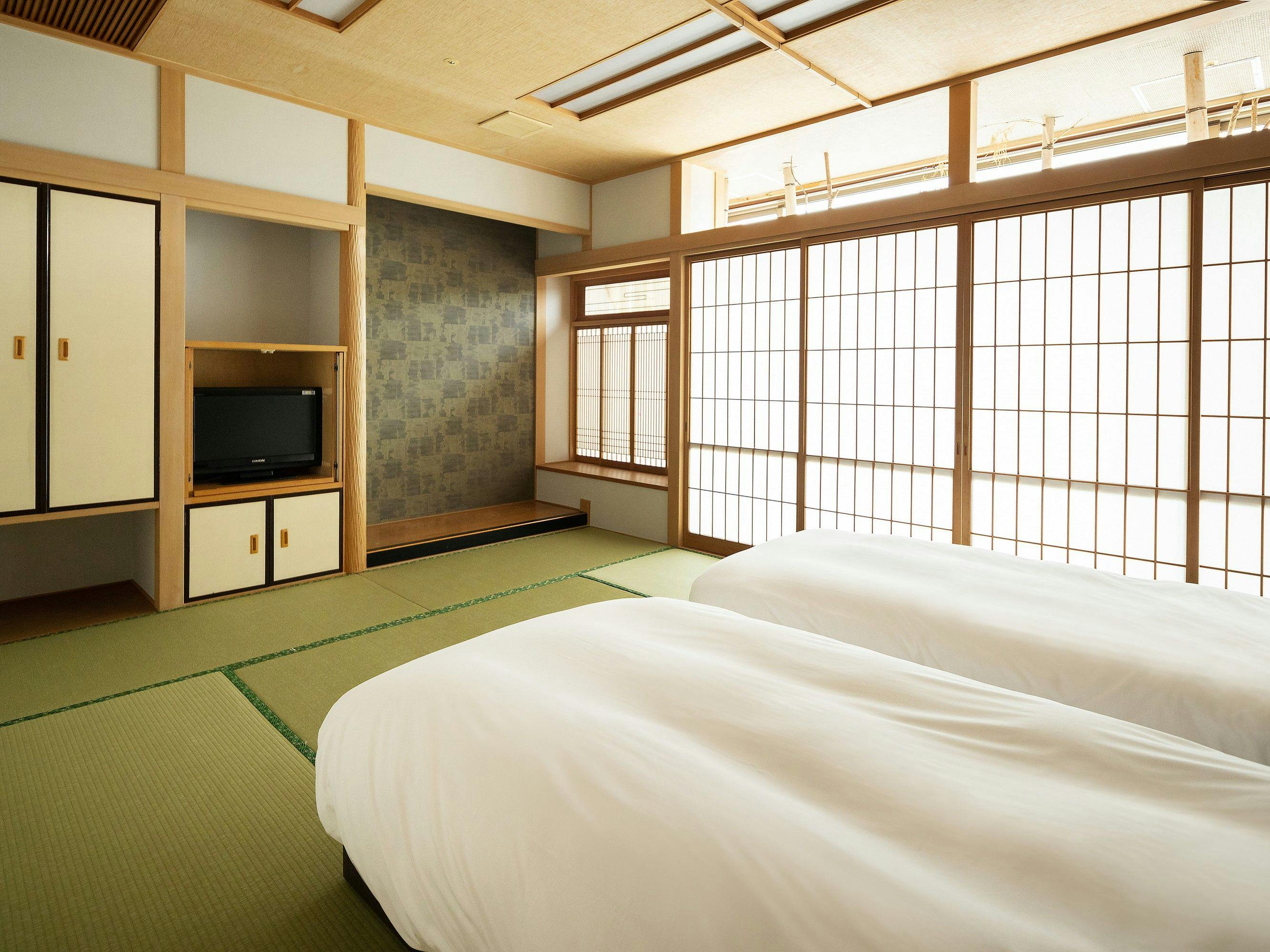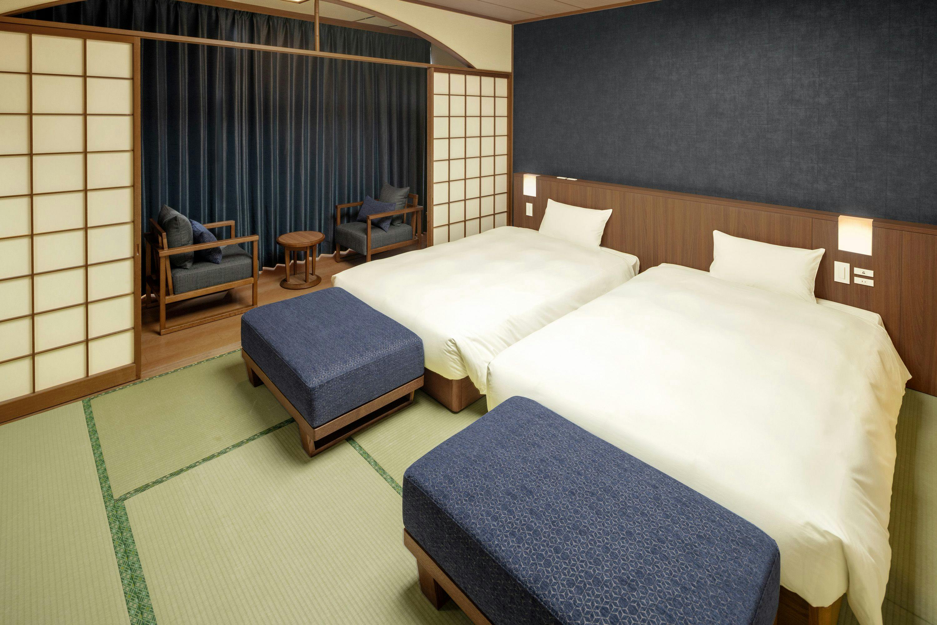 10畳+9畳の二間続き、さらに広縁を設けた開放的な空間で寛ぎを演出する客室です。和と洋の趣が調和した木のぬくもりを感じる空間で、四季折々の嬉野温泉の街並みをお楽しみください。※ベッドの他にソファベッド(1組)、布団枕セット(3組)のご用意がございます。