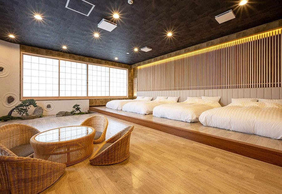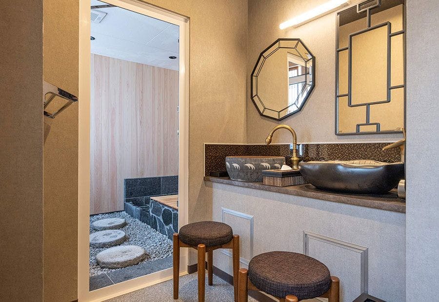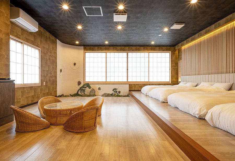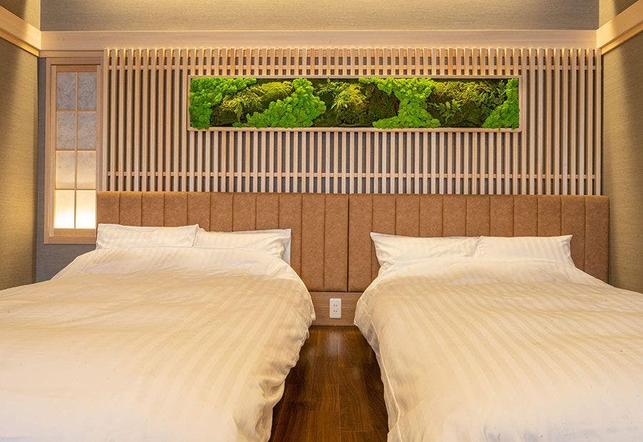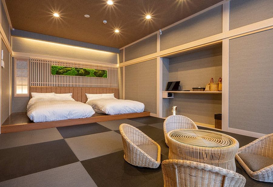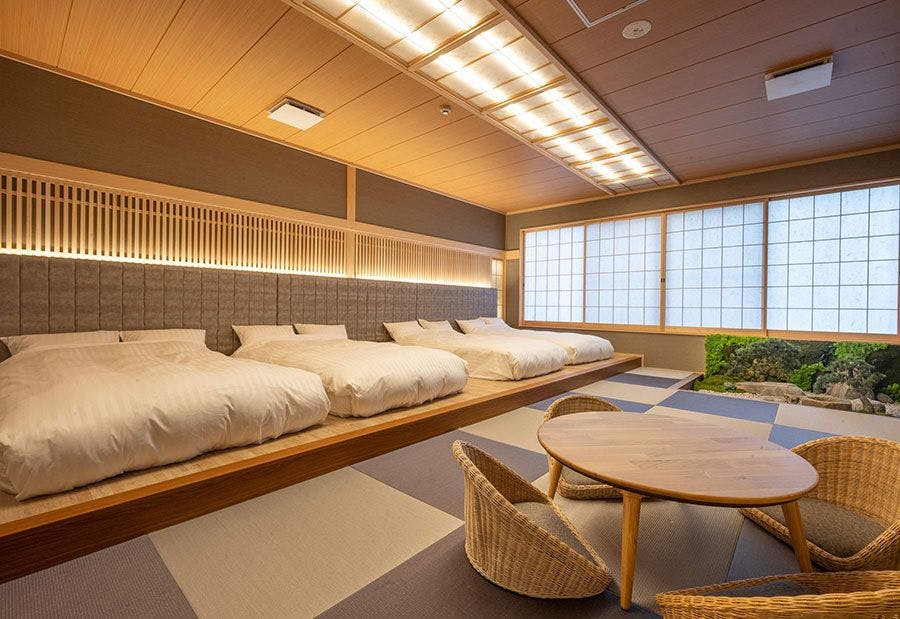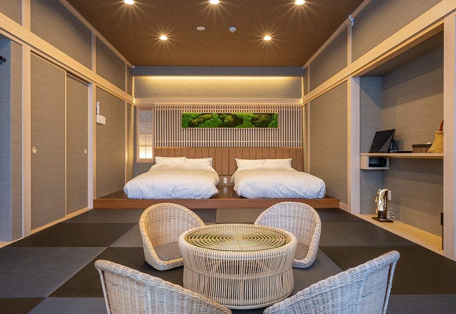 当館自慢の源泉掛け流し総檜風呂付のお部屋です。源泉掛け流しの湯をたっぷりとご堪能いただけます。ベッド4台と畳のスペースの広々としたお部屋は、ご家族やグループでのご宿泊に最適です。室内には世界的庭園デザイナー石原和幸プロデュースの庭園や緑を設置。緑溢れる空間で優雅な時間をお過ごしください。