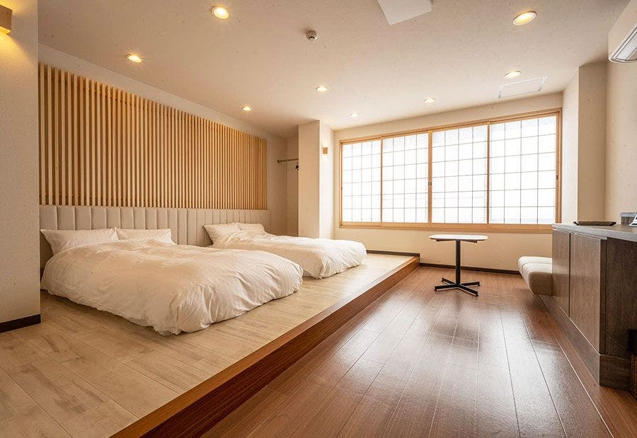 洋室タイプのスタンダードツインルーム。旅館にいながら、ホテル感覚でお寛ぎいただけます。室内にはソファをご用意。木の温もりあふれるお部屋でごゆっくりとお過ごしください。※部屋ごとに広さや仕様、眺めが異なり、指定はできませんのでご了承ください。※バスタブの無い、シャワーのみのお部屋タイプです。※当館はエレベーターがございません。階段でのご移動となります。