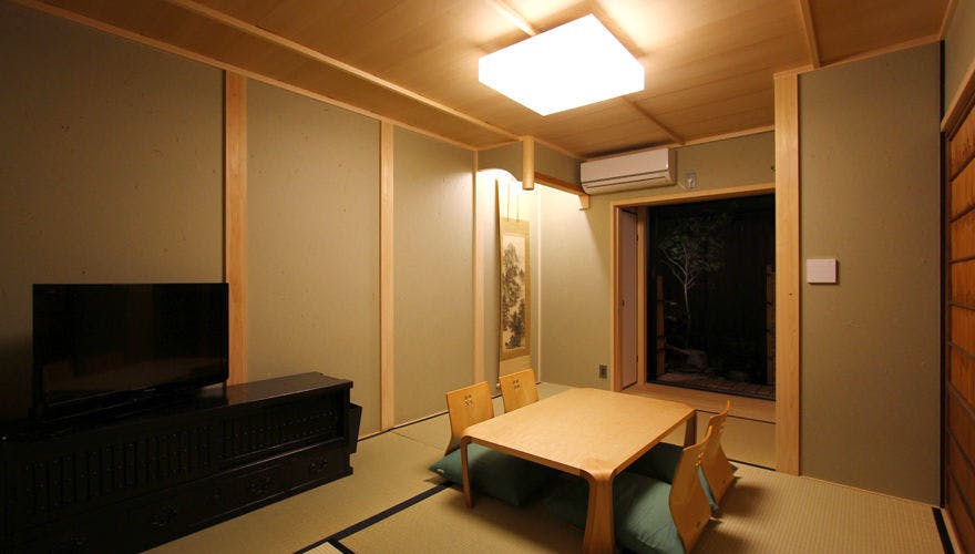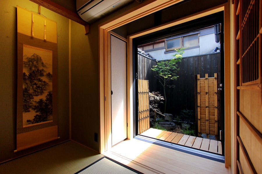 1階:フロントスペース、5畳半の和室(畳敷き、床暖房つき)、キッチン、洗面、浴室 、トイレ×2、坪庭