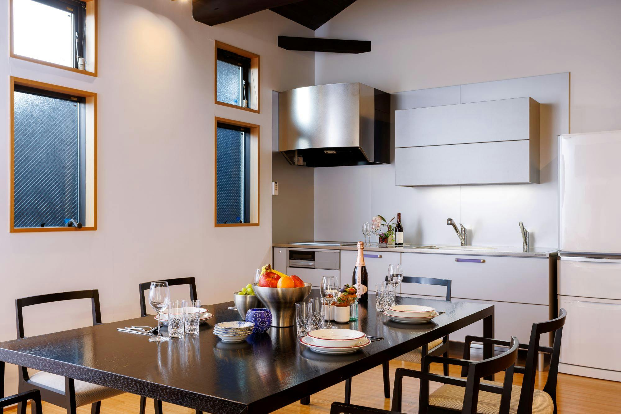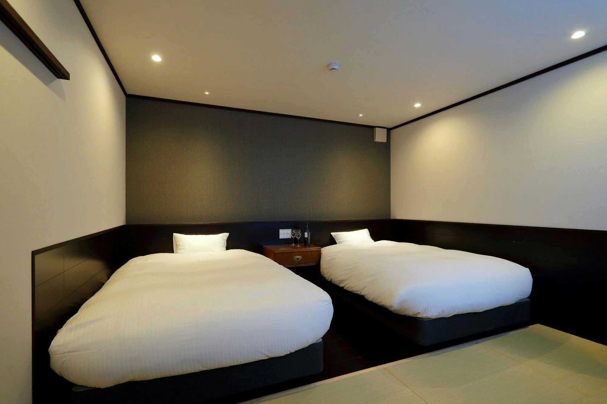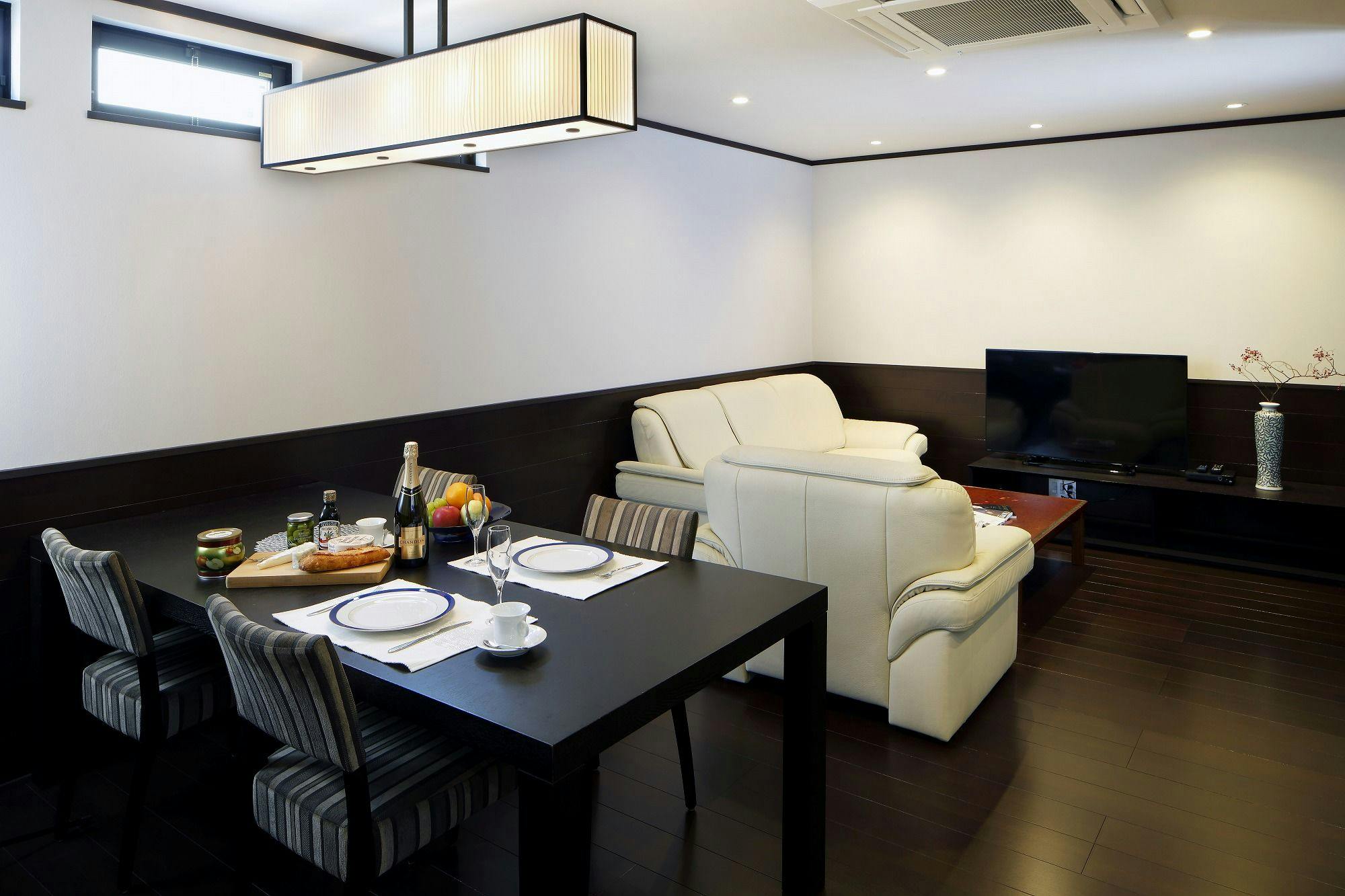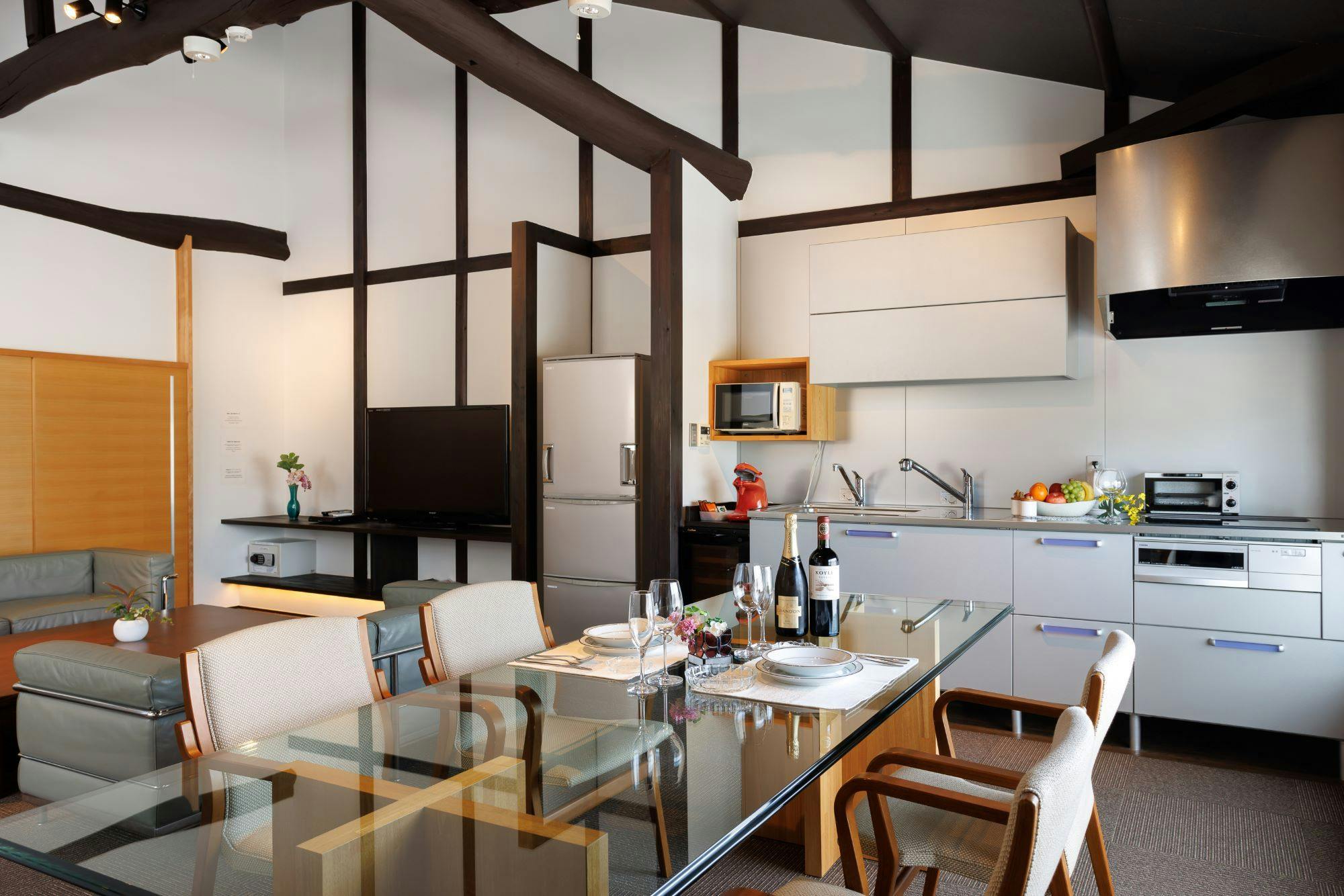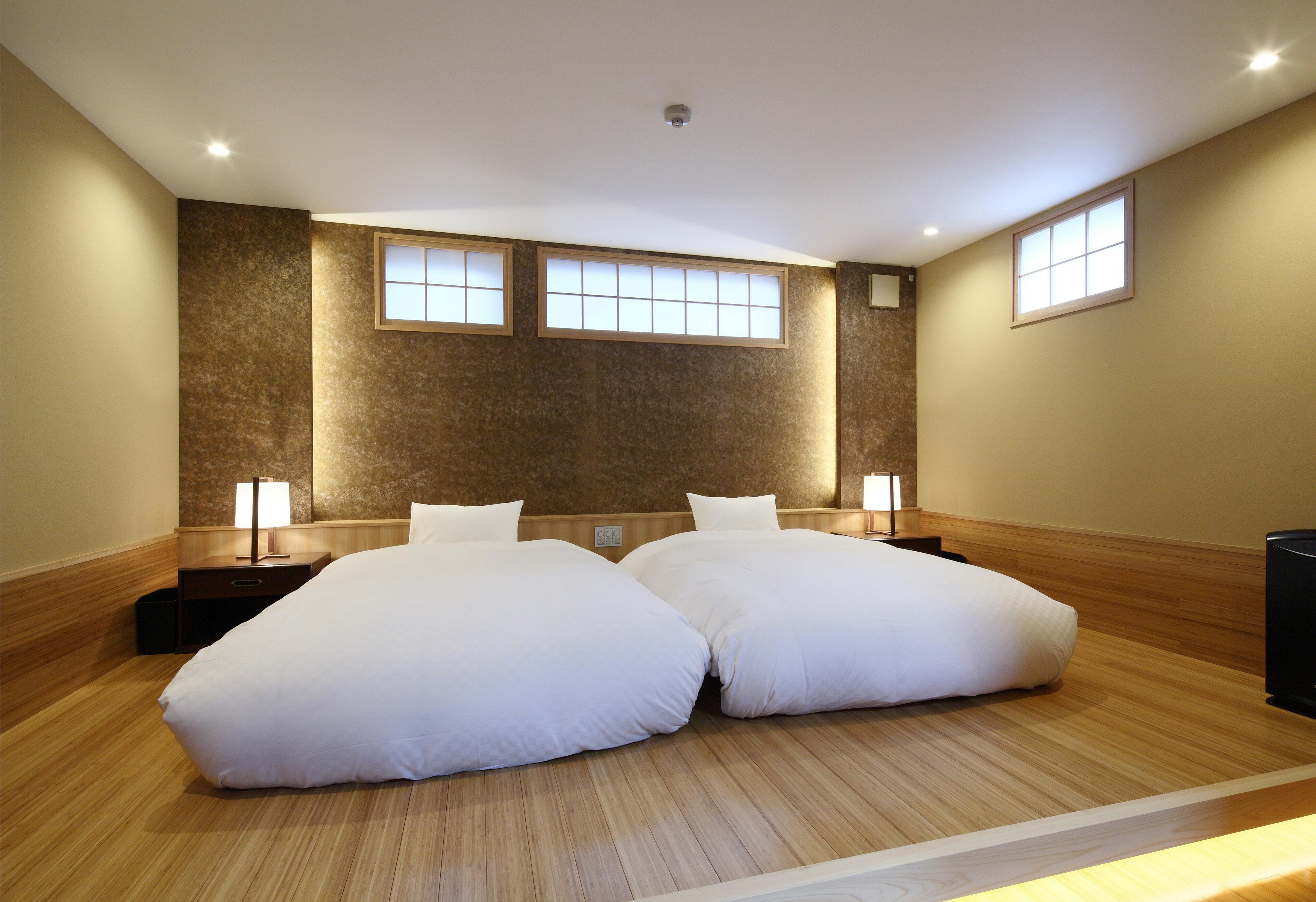 デラックススイートの和モダンな町家。フラットタイプ。階段を上がると広いリビングダイニングスペース。和モダンが織りなすスタイリッシュな空間。梁(ゴロンボ)を見せた高い天井は、開放的でリラックスできる空間を生み出しています。ベッドルームは市松模様をあしらった壁が特徴的。江戸時代から続くモダンさがインパクトを与えます。京宿うさぎは1日6組様限定です。