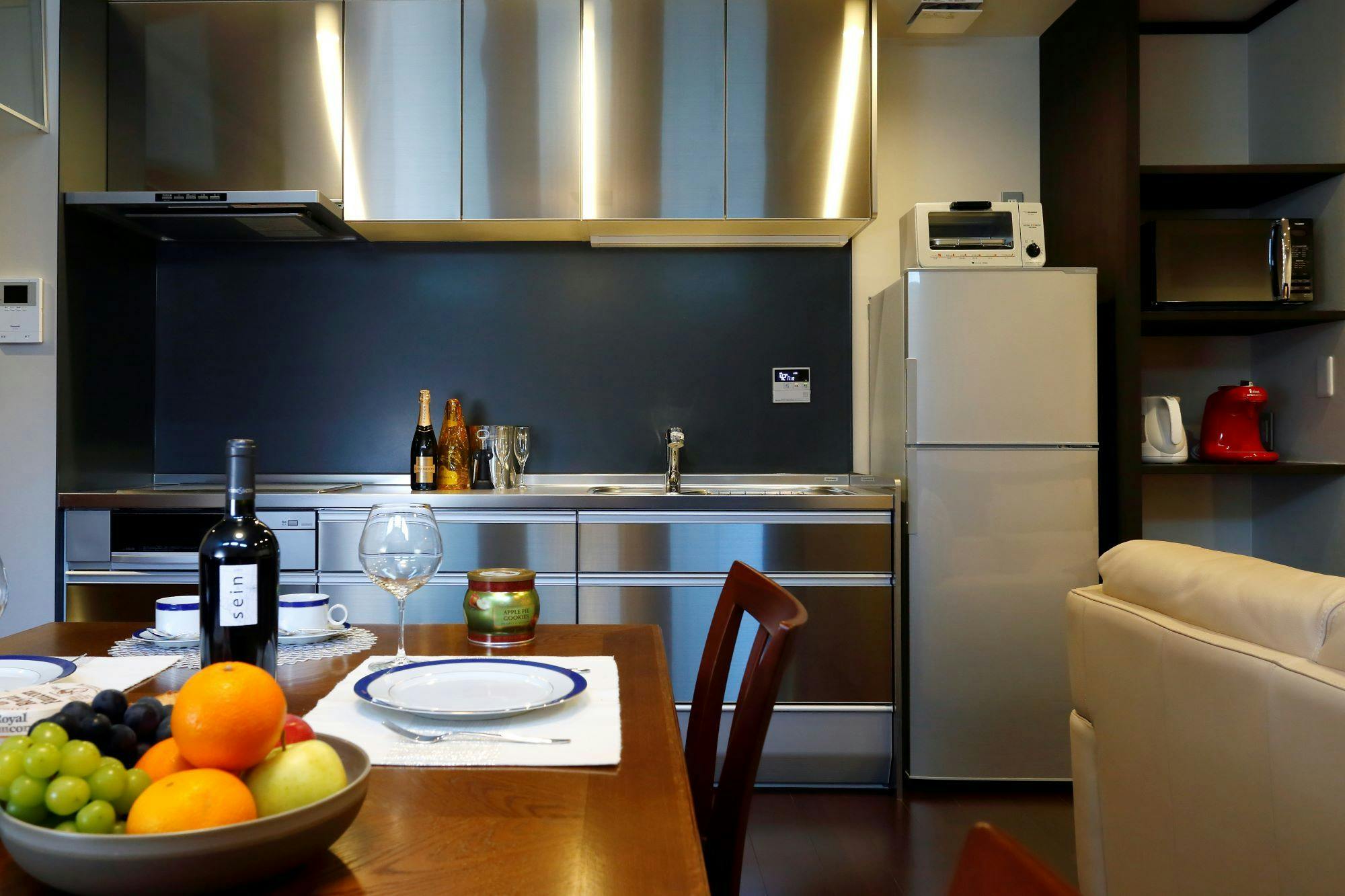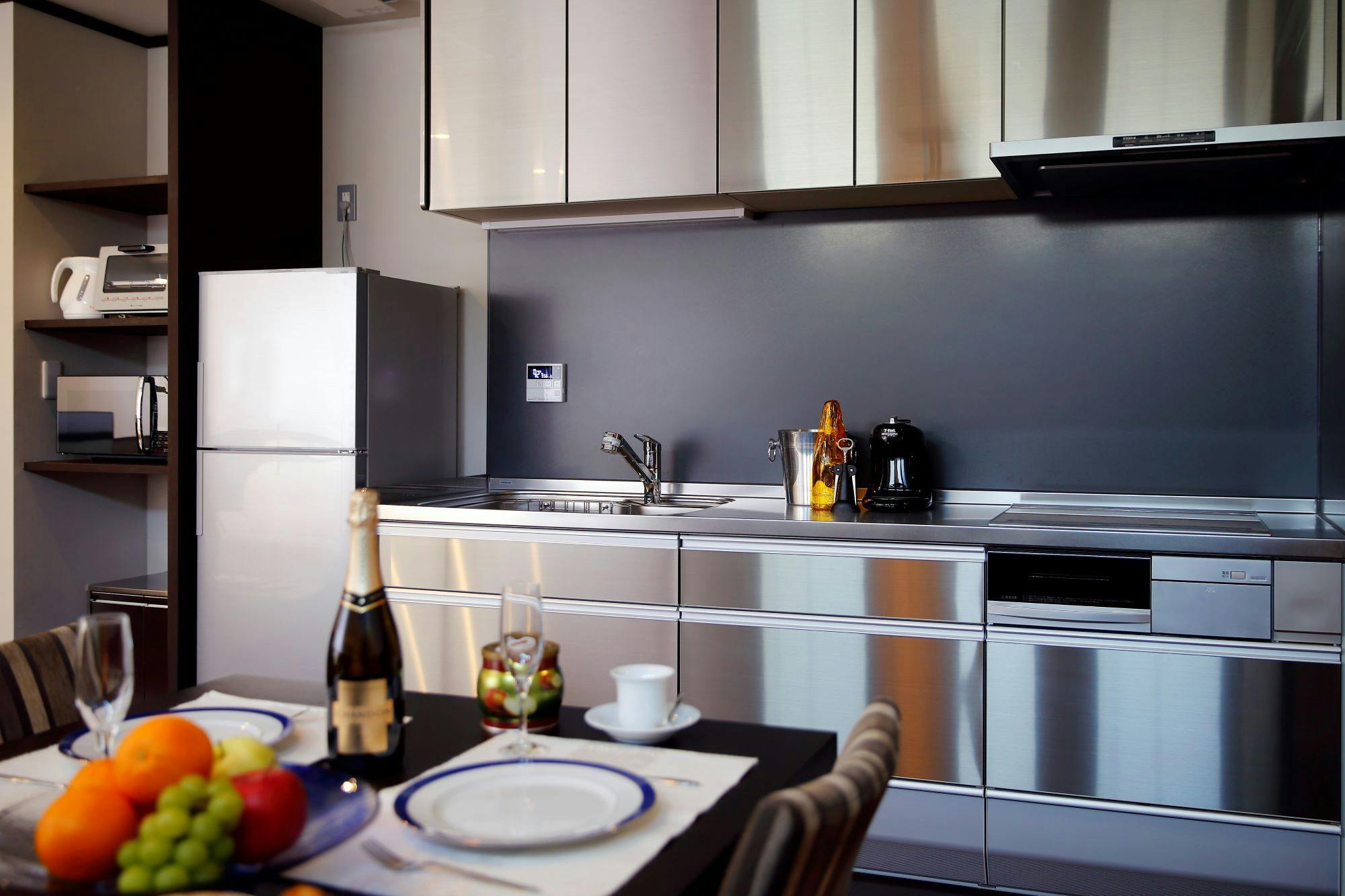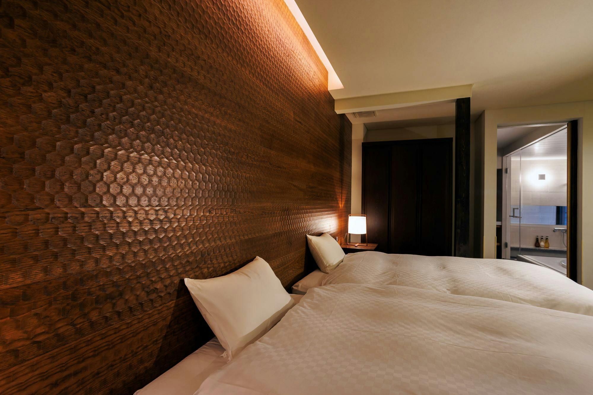 メゾネットタイプのスイート。花びらを思わせる あたたかな赤い壁がお出迎え。1階のリビング・ダイニングはスタイリッシュなモノトーンの空間。坪庭はつくばい、灯篭、飛石の茶庭仕立て。竹から流れ落ちる水音が心地よく、夜には光に照らされた水の揺らぎが何とも幻想的です。2階寝室にはシモンズ製のベッドをご用意。深い眠りをご体感ください。京宿うさぎは1日6組様限定です。