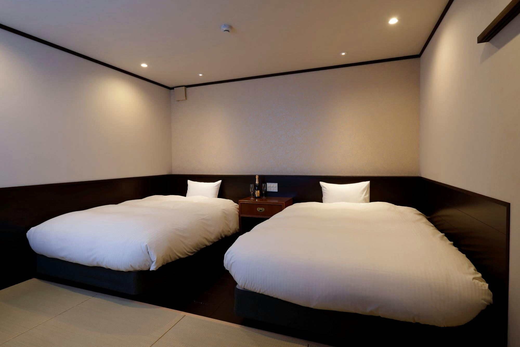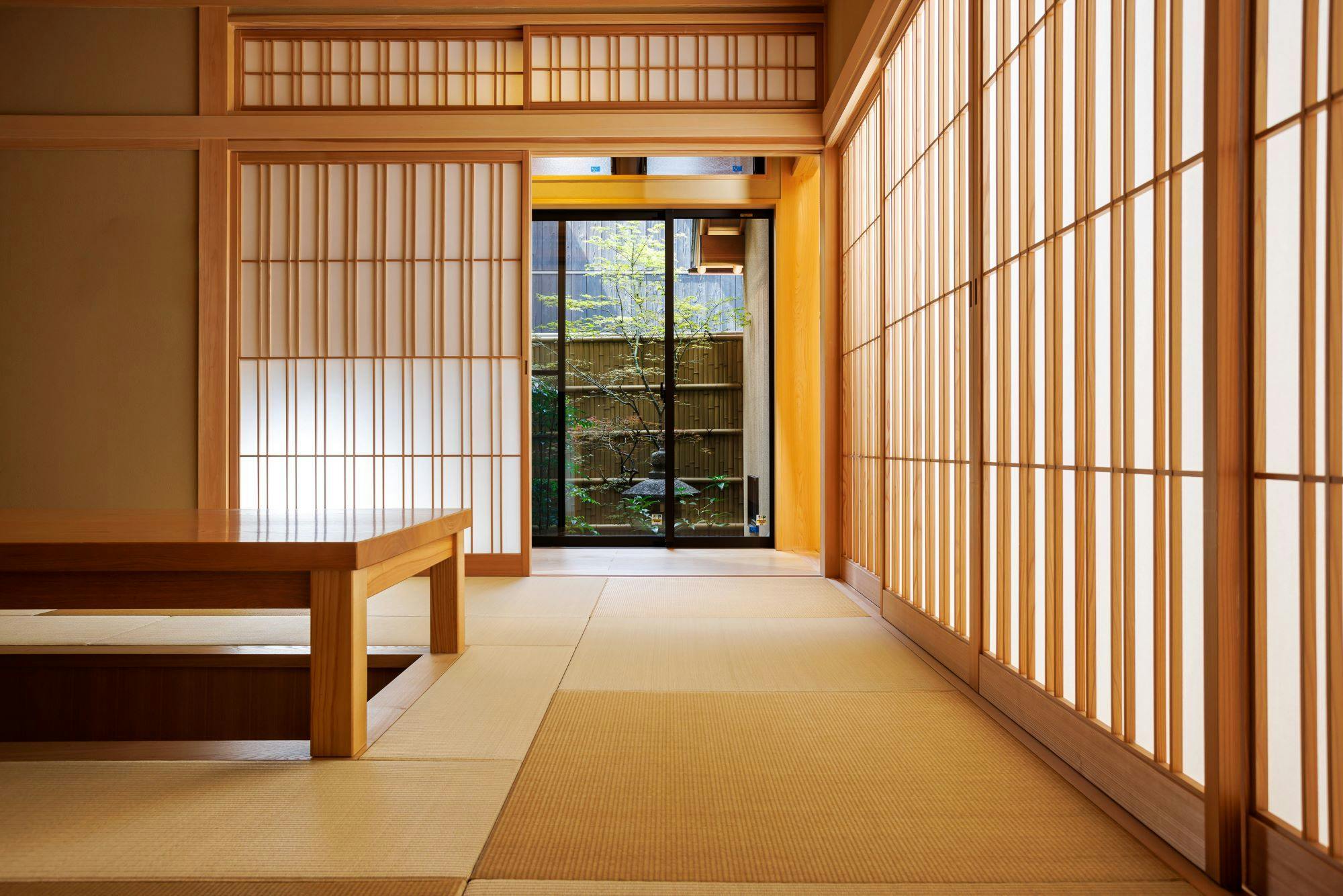 メゾネットタイプのデラックススイート。玄関ホールを入ると、和室につながる広々した和の空間と、坪庭が調和して安らぎを感じさせます。秋には坪庭のもみじがつくばいを飾る風流さ。2階の窓を開けると世界文化遺産に登録されている二条城の西南櫓がご覧いただけます。京宿うさぎは1日6組様限定です。