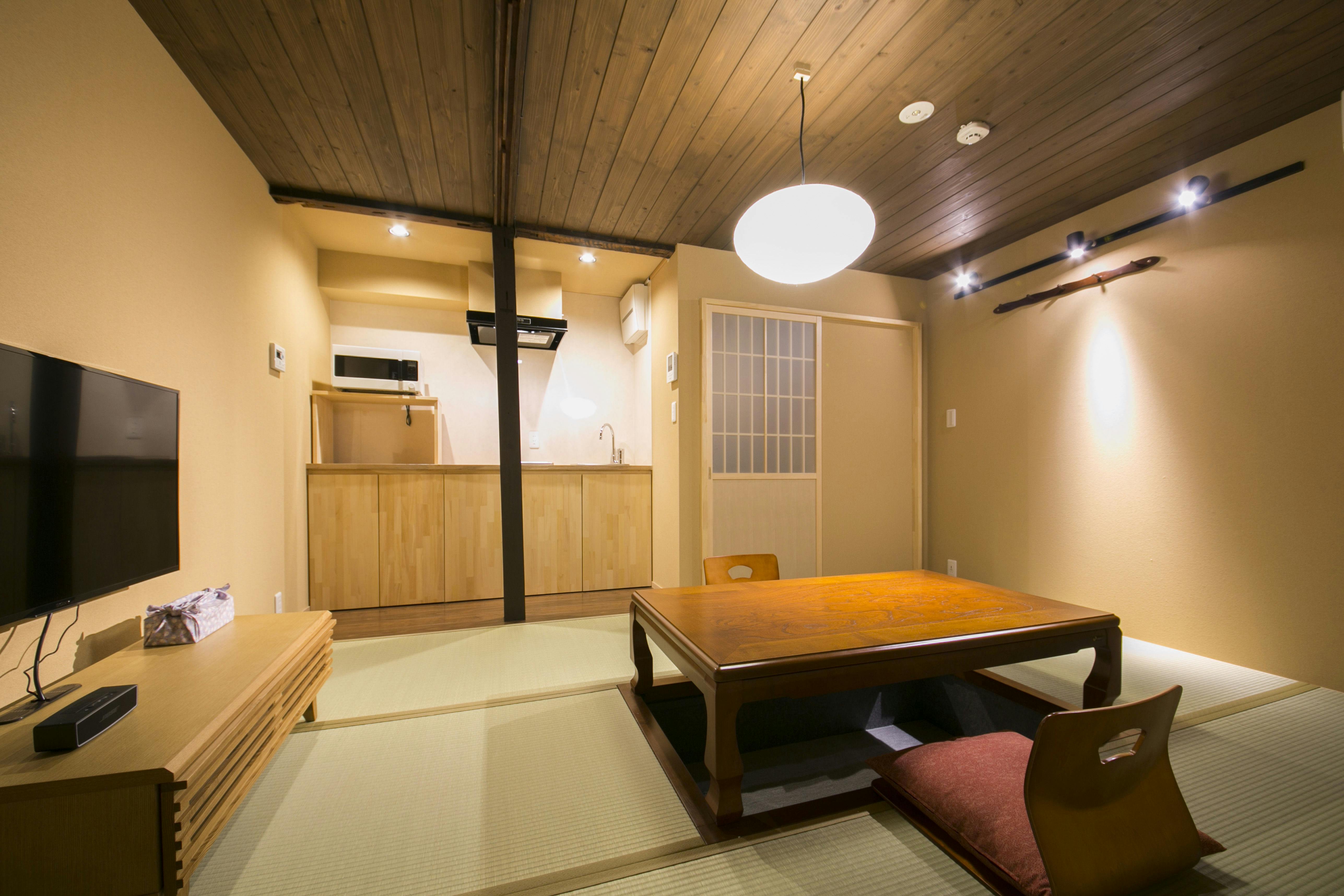 二階寝室床暖房、掘りごたつ、エアコン・加湿機能付き空気清浄機(1階、2階)京都の冬でもご満足いただけるための空調を完備しています。